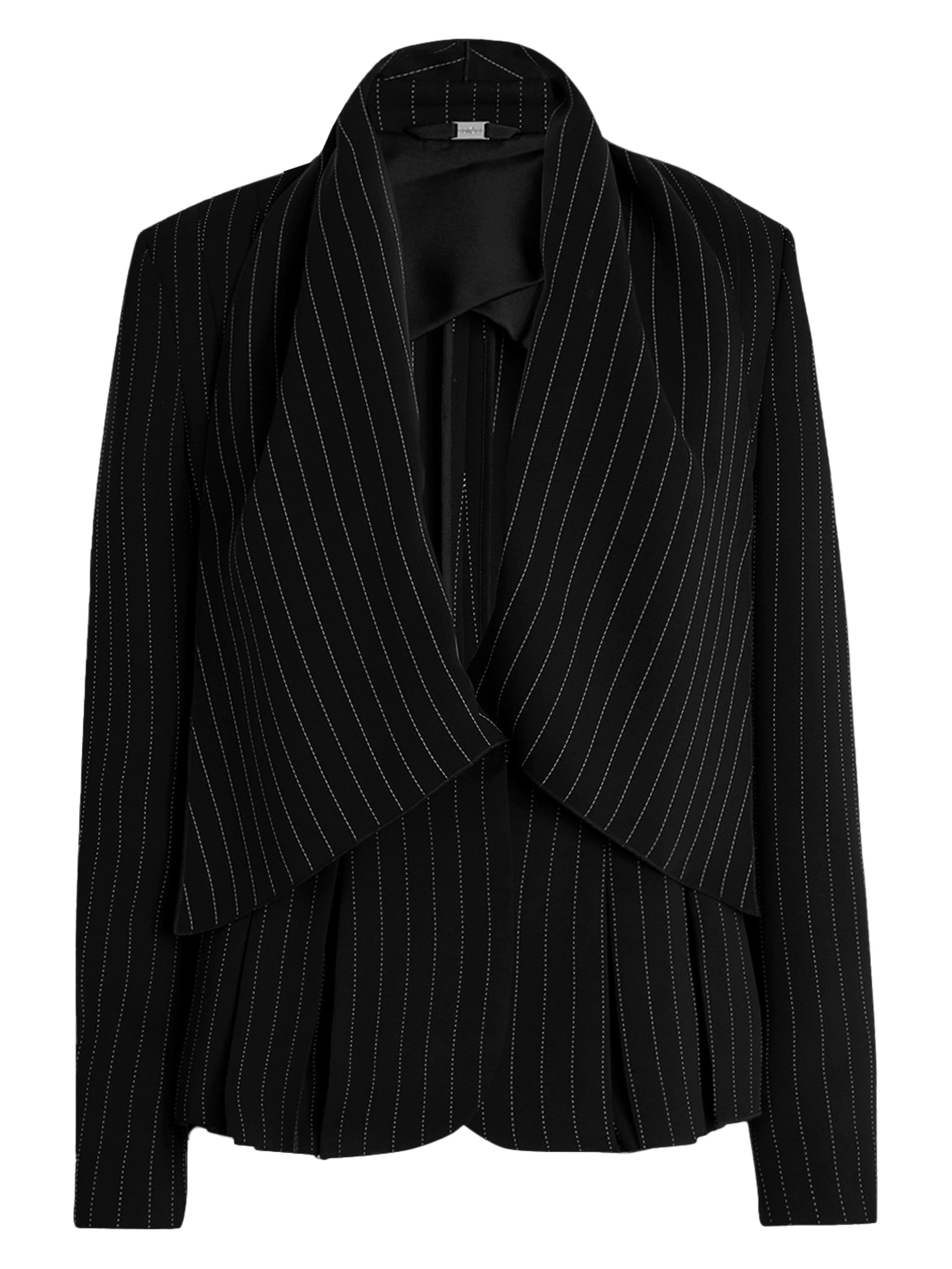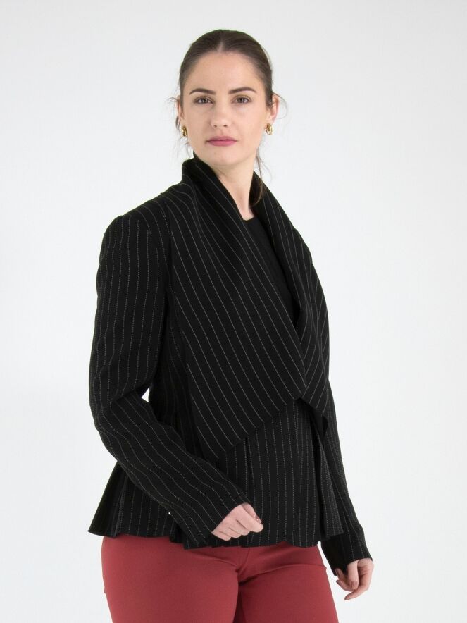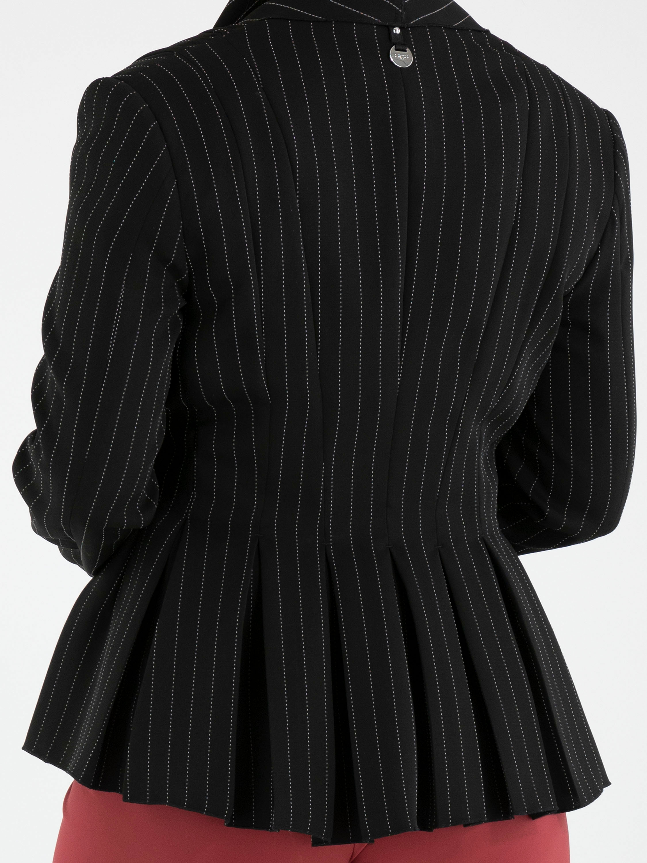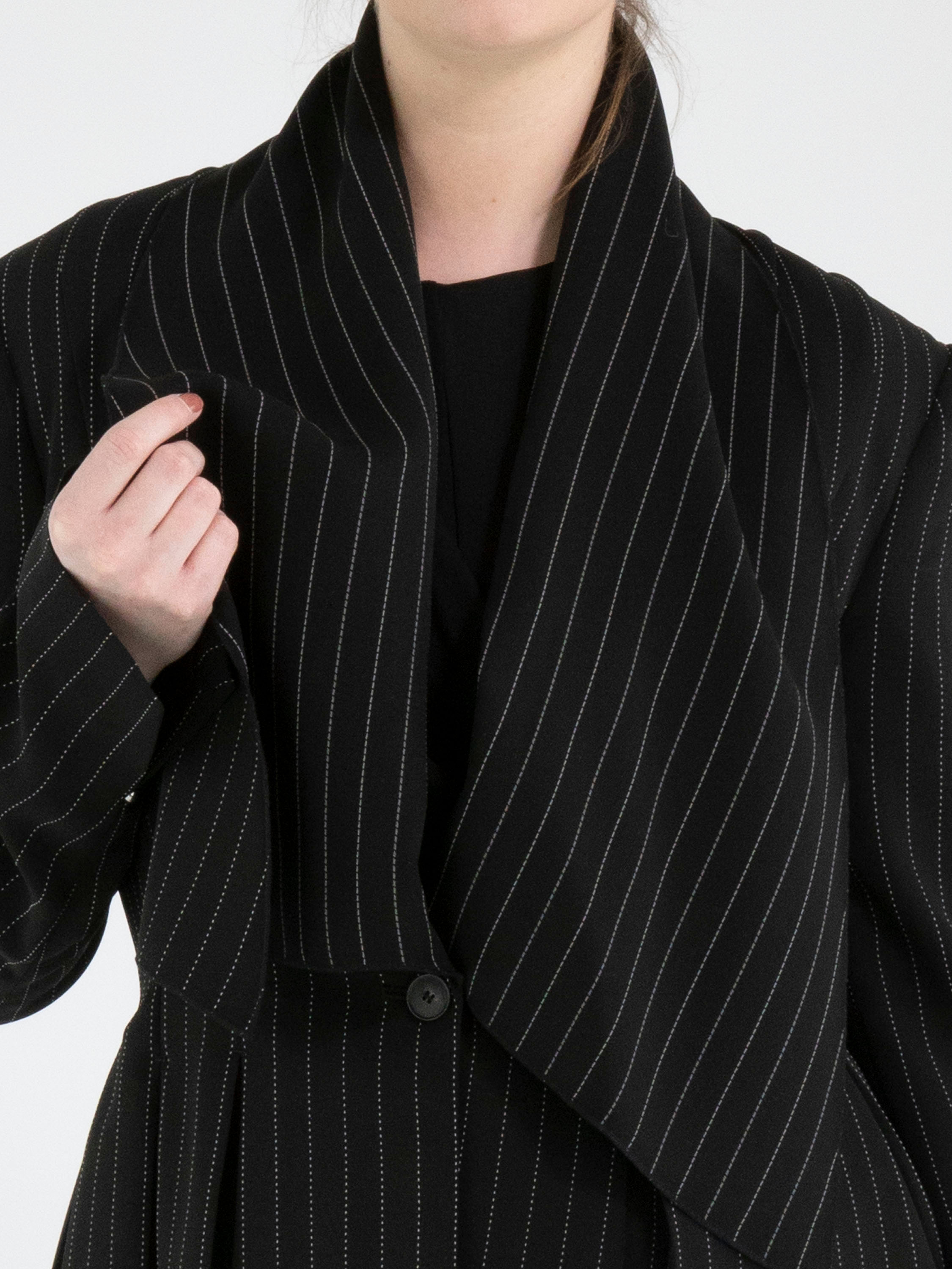 Un blazer de High à fines rayures craie de couleur noire avec des coutures blanches. Le blazer est doté d’un large col châle et d’une fermeture à un bouton. À l’extrémité des manches longues se trouve une courte fente avec un clou décoratif argenté. Des poches fendues sont placées à hauteur de la taille. Au dos, plusieurs plis partent de la taille. Ce blazer ne doit pas être lavé.