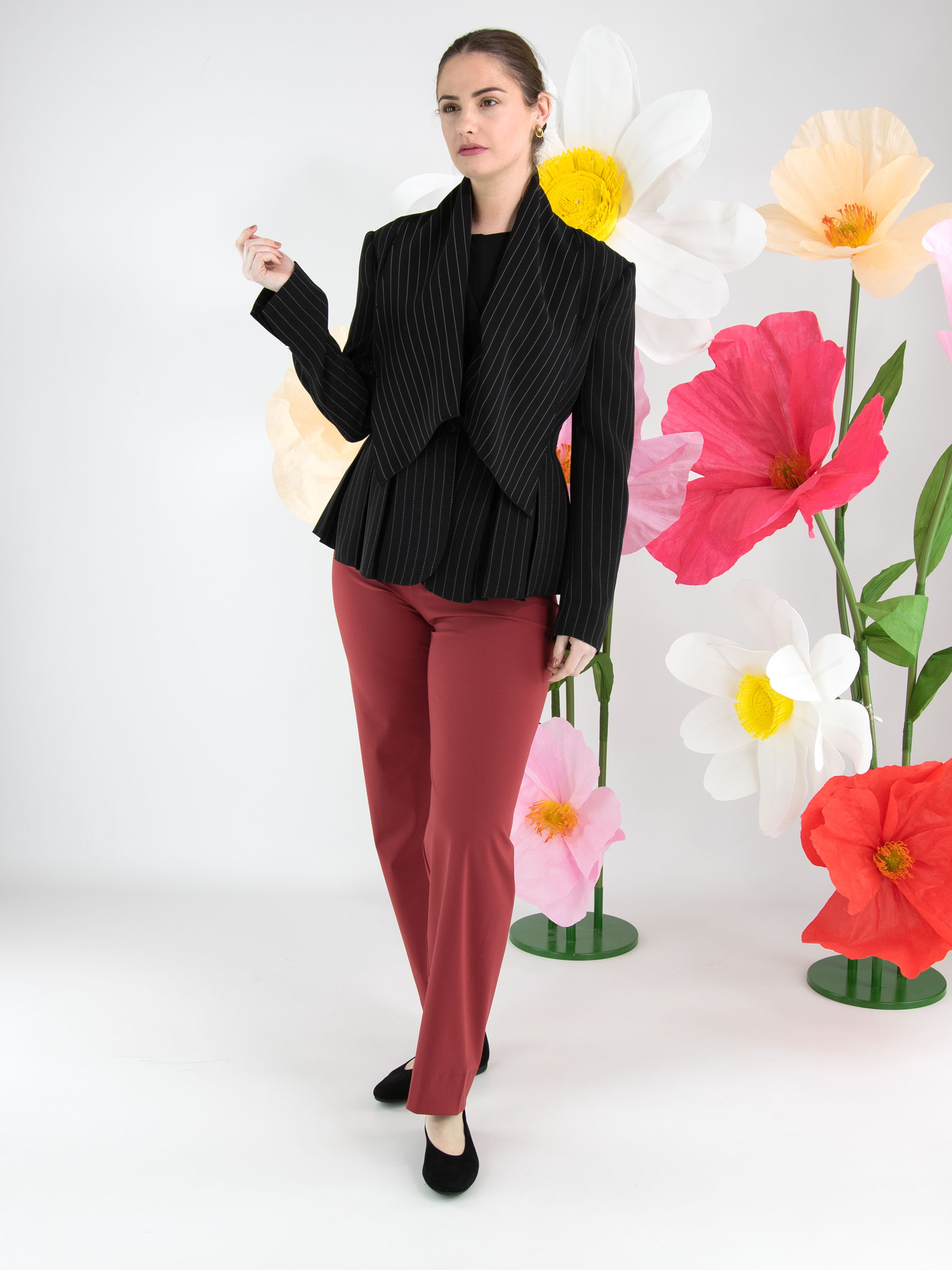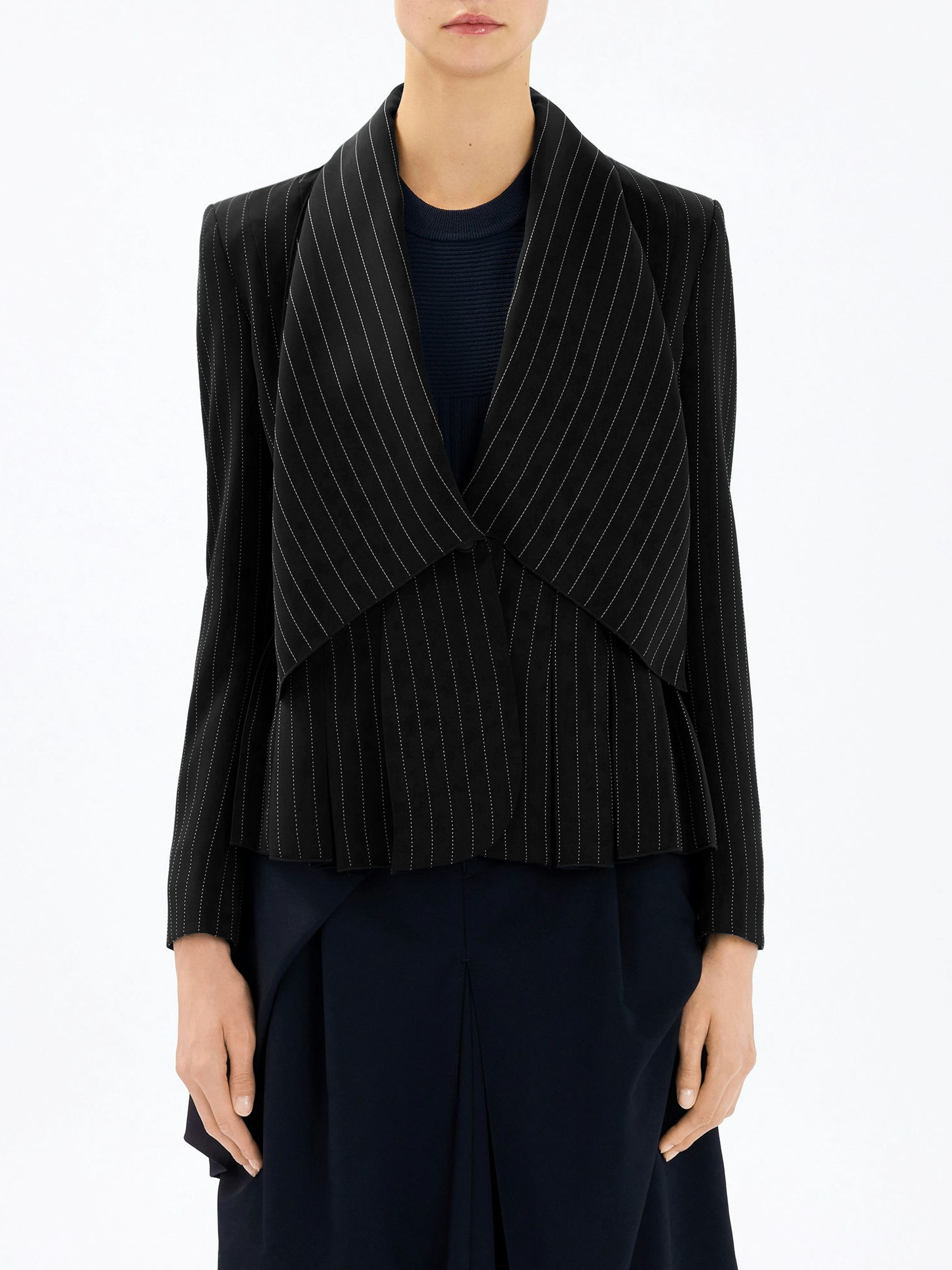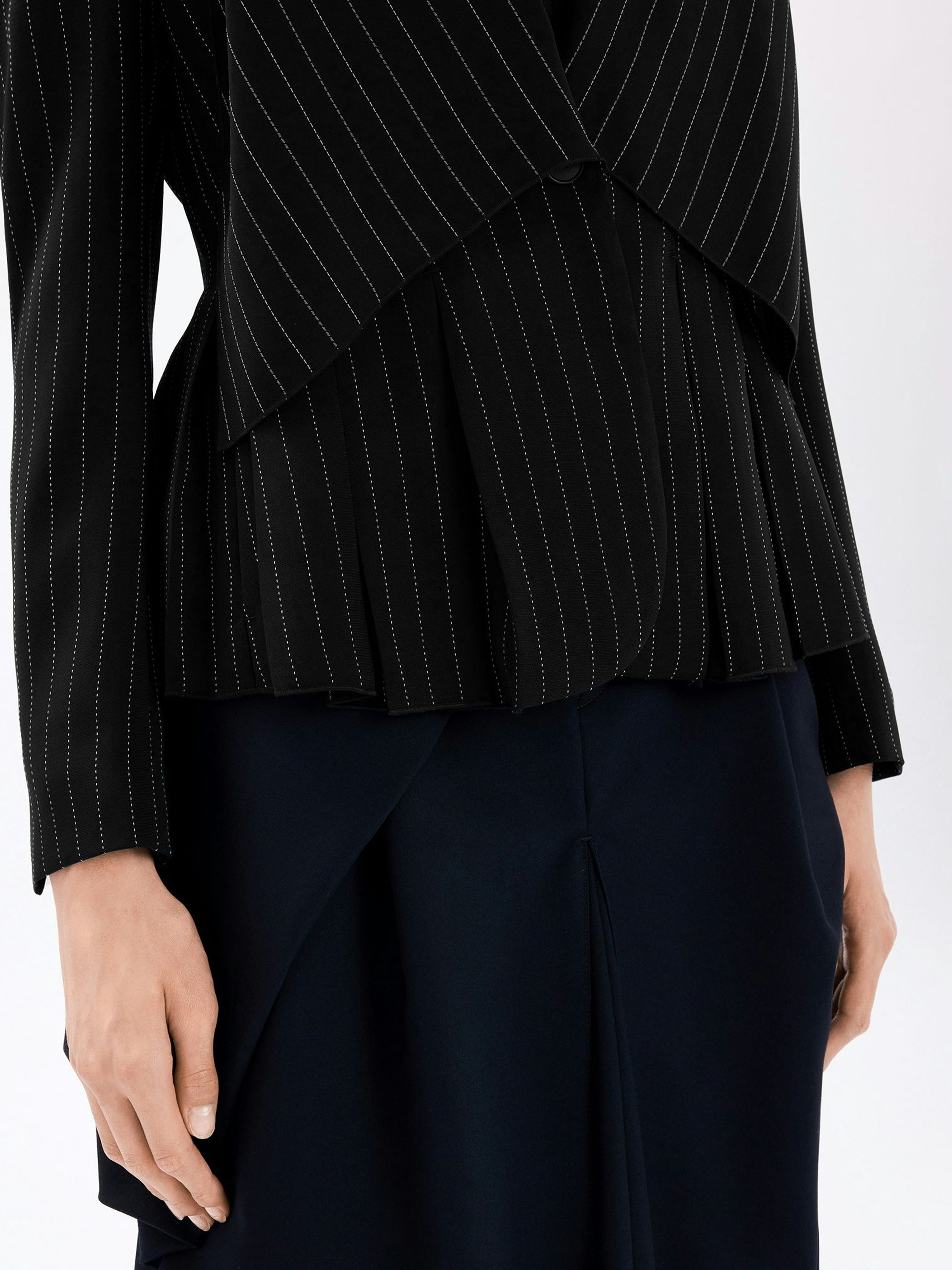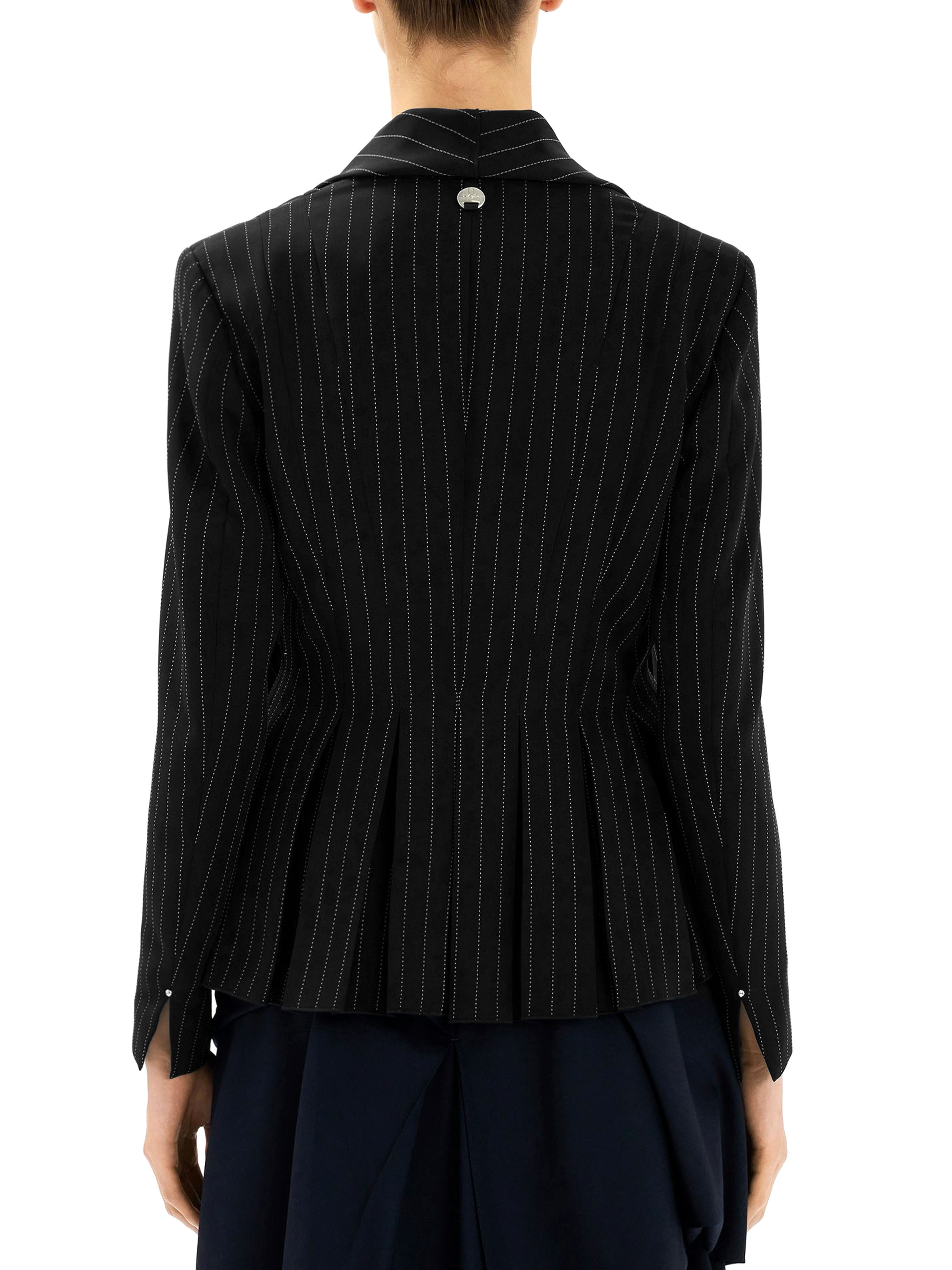 Un blazer de High à fines rayures craie de couleur noire avec des coutures blanches. Le blazer est doté d’un large col châle et d’une fermeture à un bouton. À l’extrémité des manches longues se trouve une courte fente avec un clou décoratif argenté. Des poches fendues sont placées à hauteur de la taille. Au dos, plusieurs plis partent de la taille. Ce blazer ne doit pas être lavé.