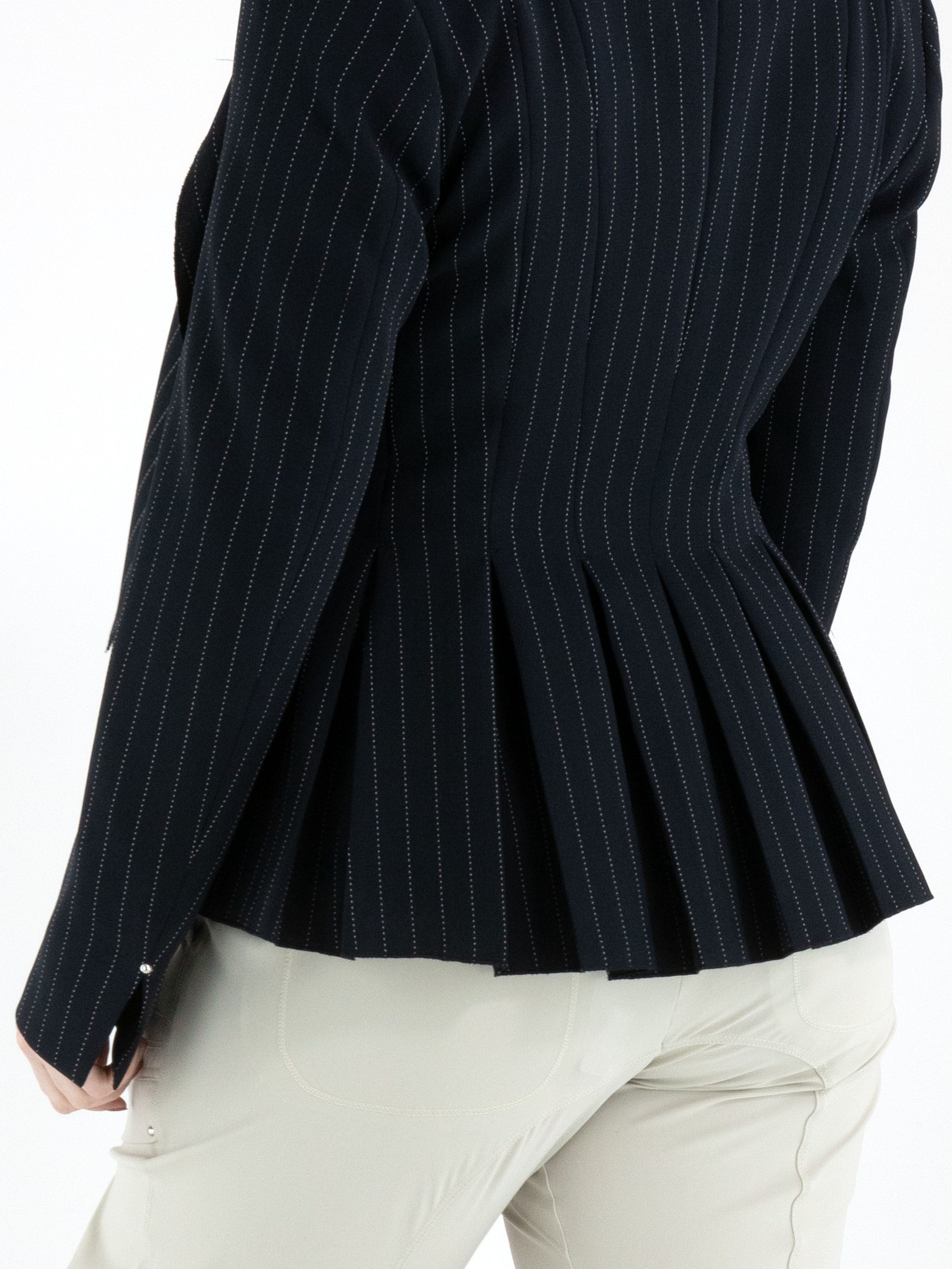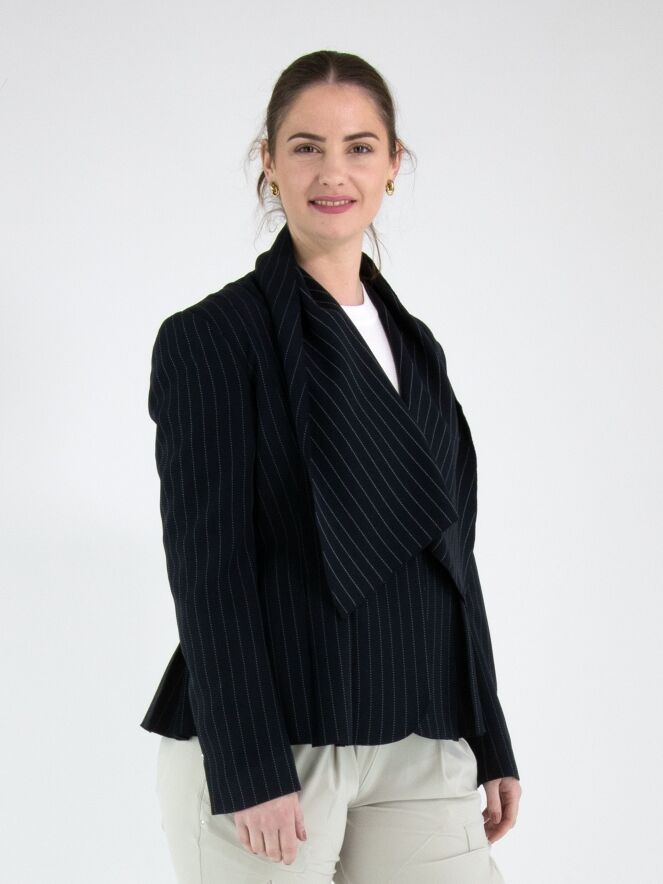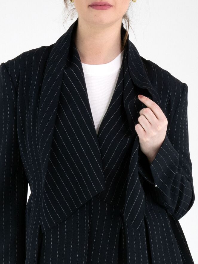 Un blazer de High à fines rayures craie de couleur bleu marine avec des coutures blanches. Le blazer est doté d’un large col châle et d’une fermeture à un bouton. À l’extrémité des manches longues se trouve une courte fente avec un clou décoratif argenté. Des poches fendues sont placées à hauteur de la taille. Au dos, plusieurs plis partent de la taille. Ce blazer ne doit pas être lavé.
