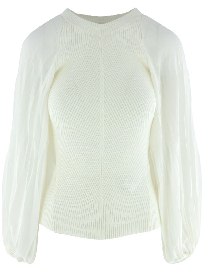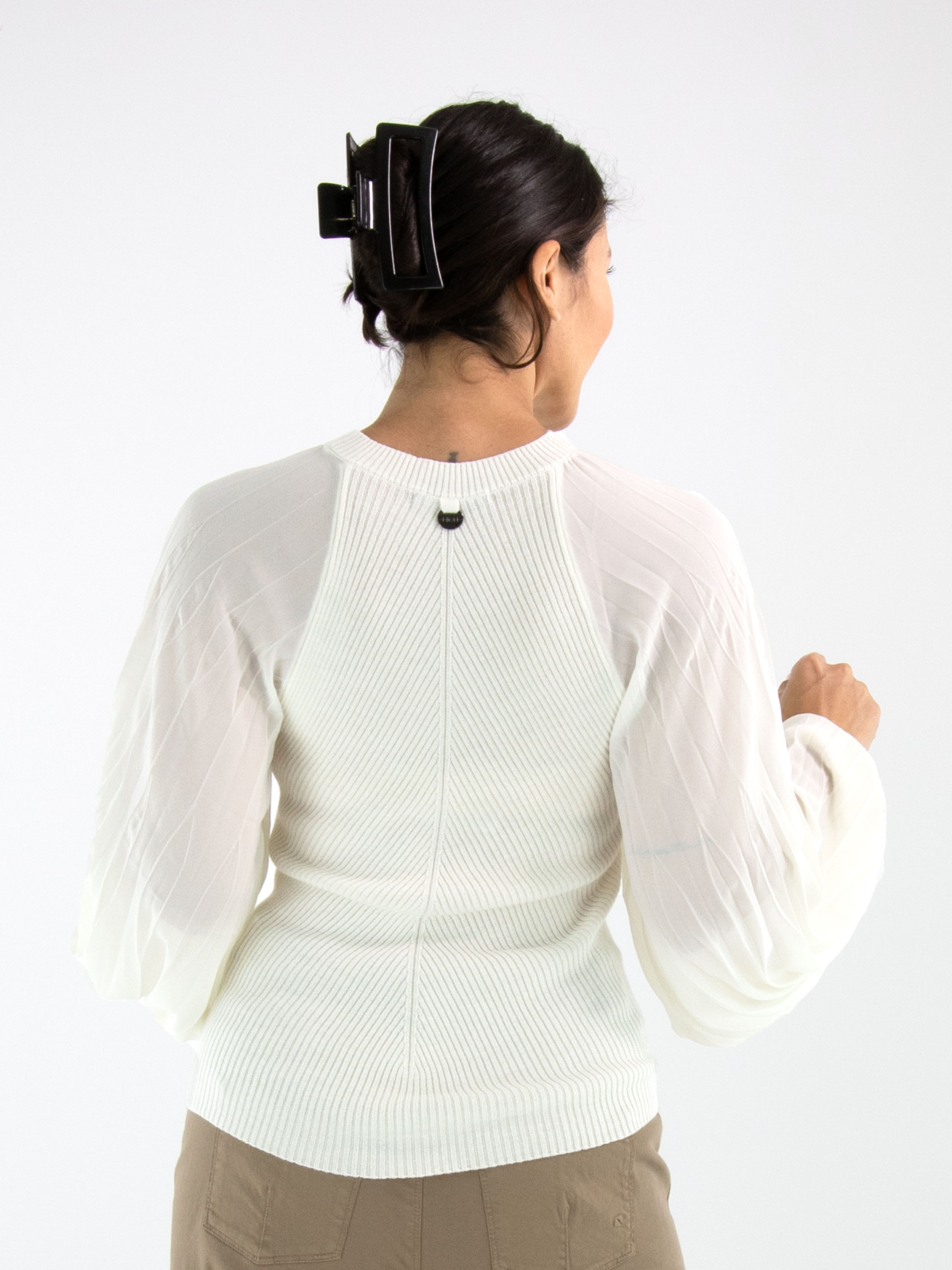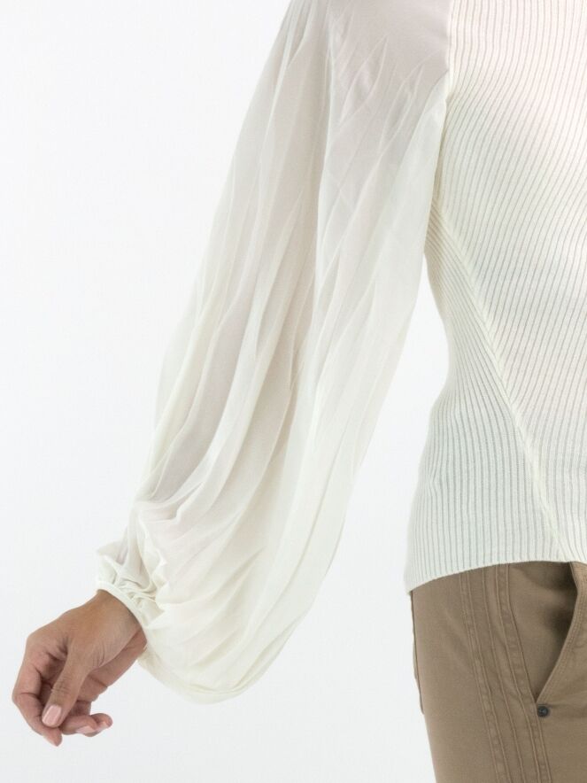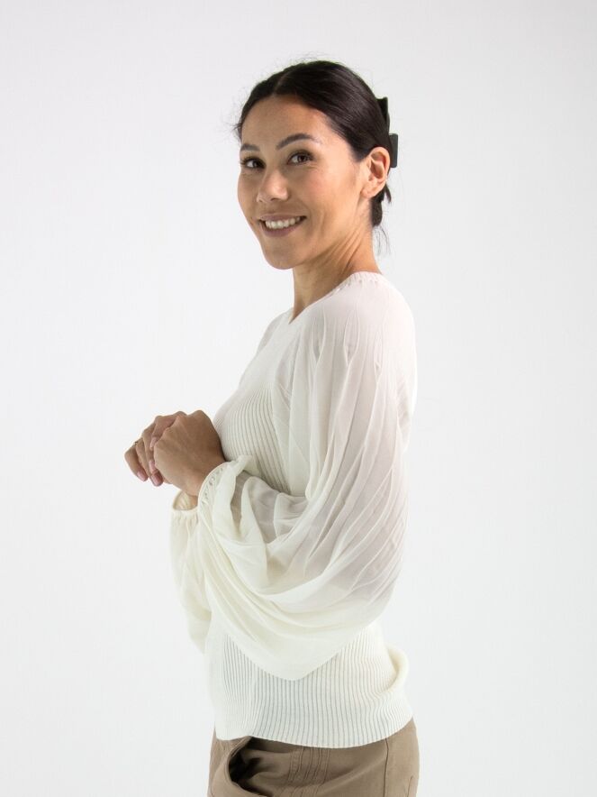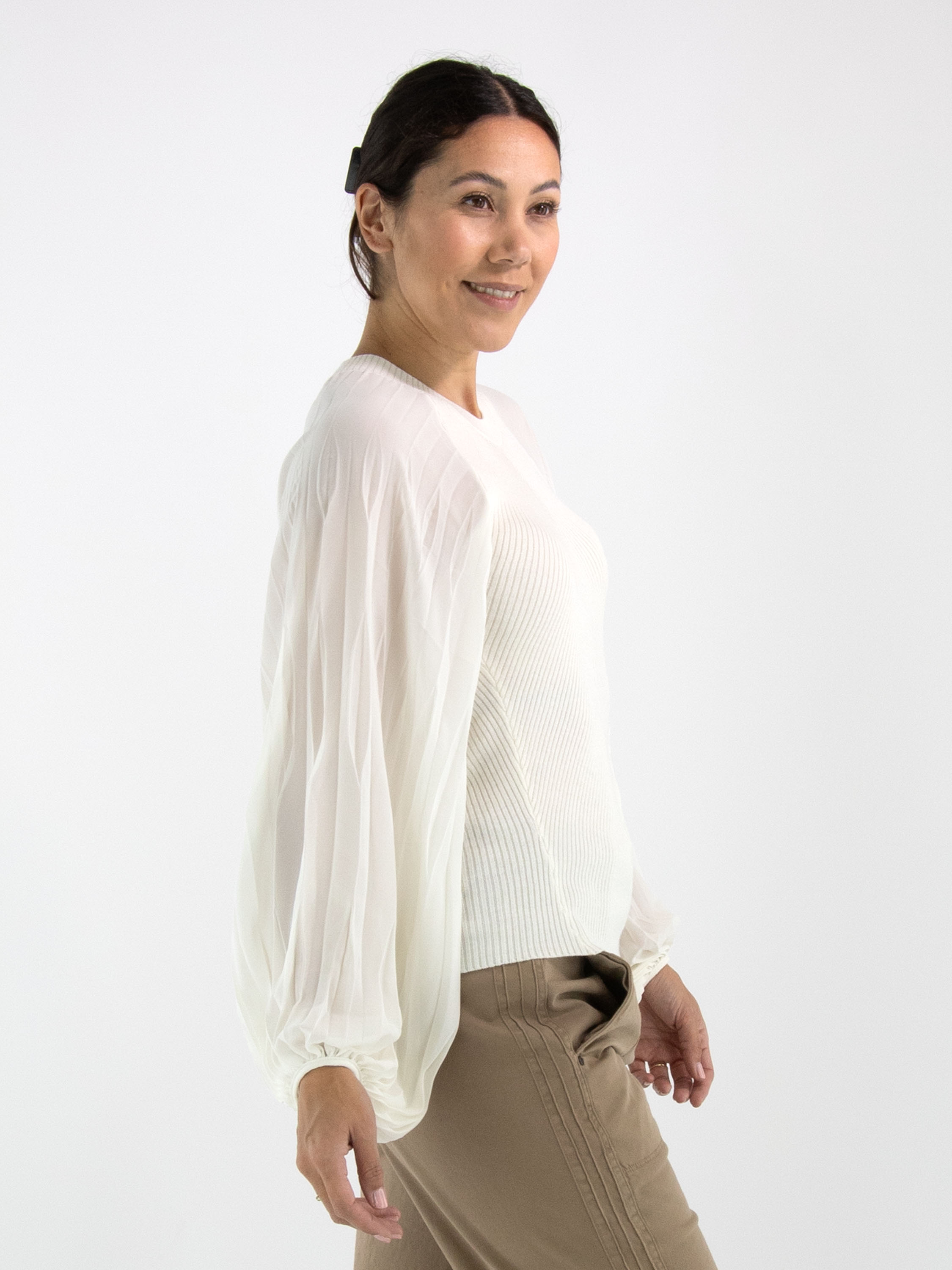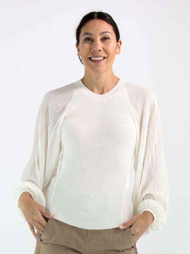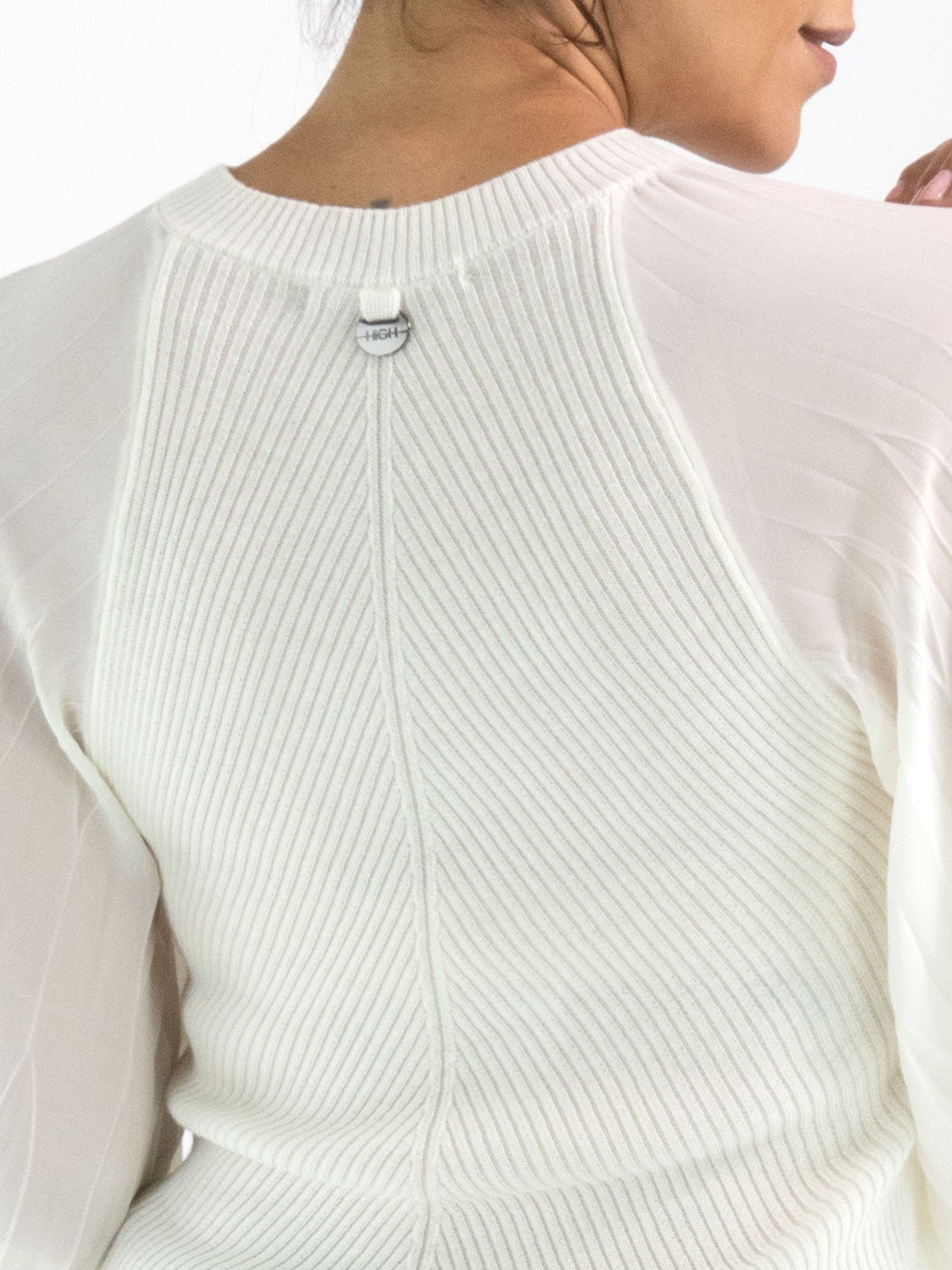 Un pull finement côtelé de High en blanc cassé. La structure côtelée s’étend depuis le centre en un élégant motif en arêtes de poisson. Les manches amples en voile sont terminées par un parement le long duquel le tissu est délicatement plissé, créant un effet aérien et féminin. Le pull présente une encolure ronde et peut être lavé à la main.