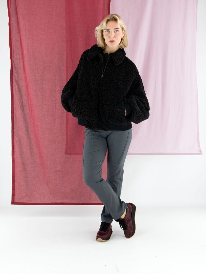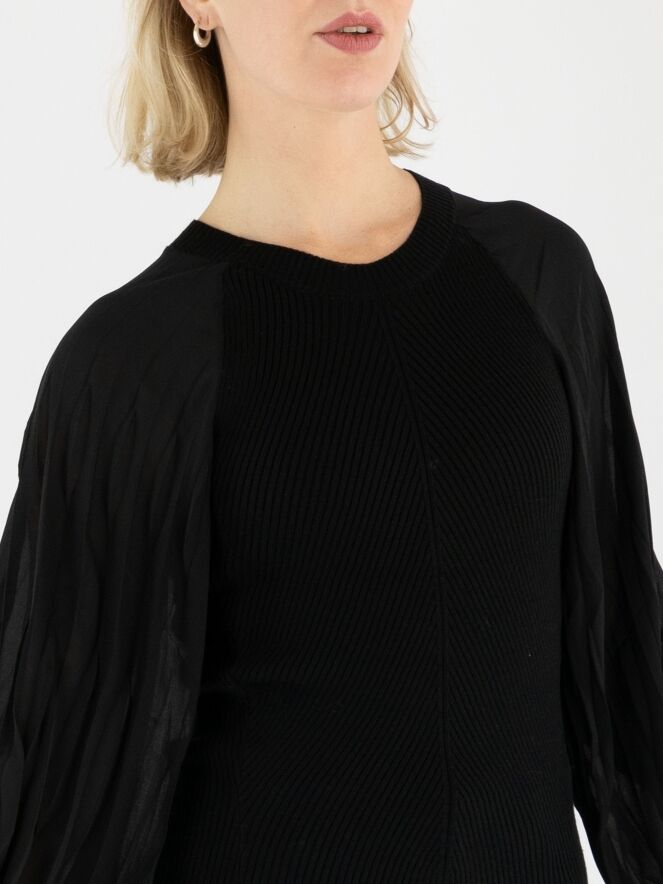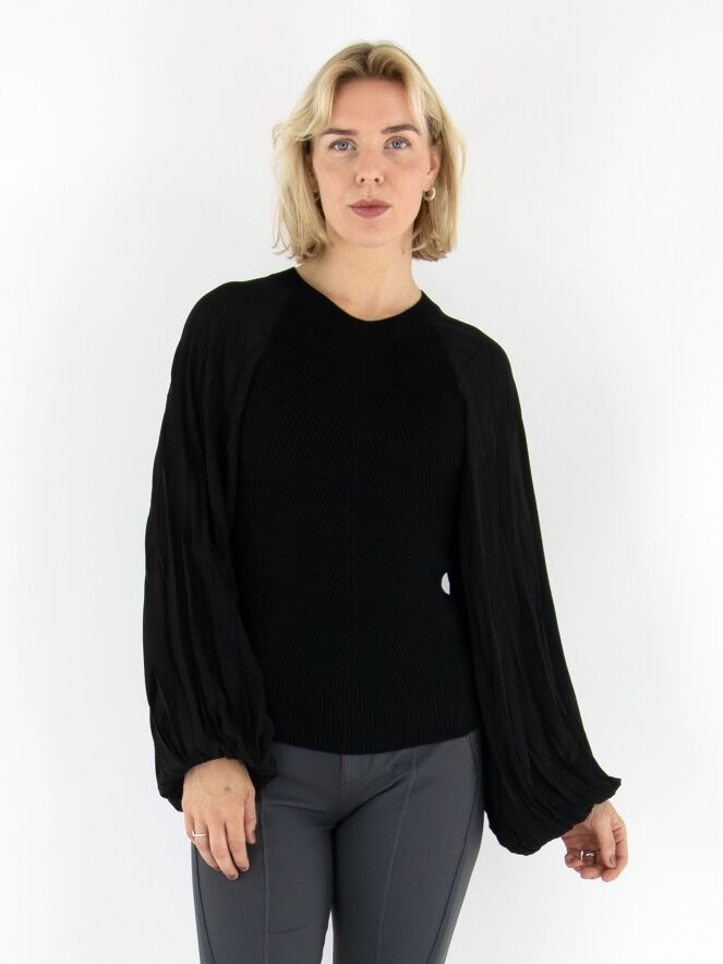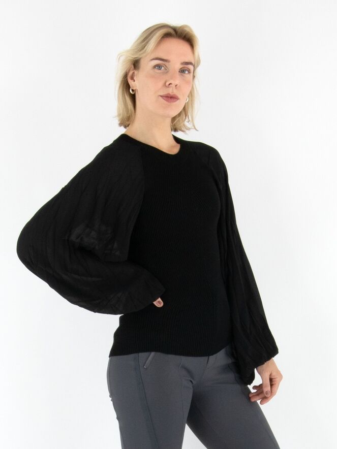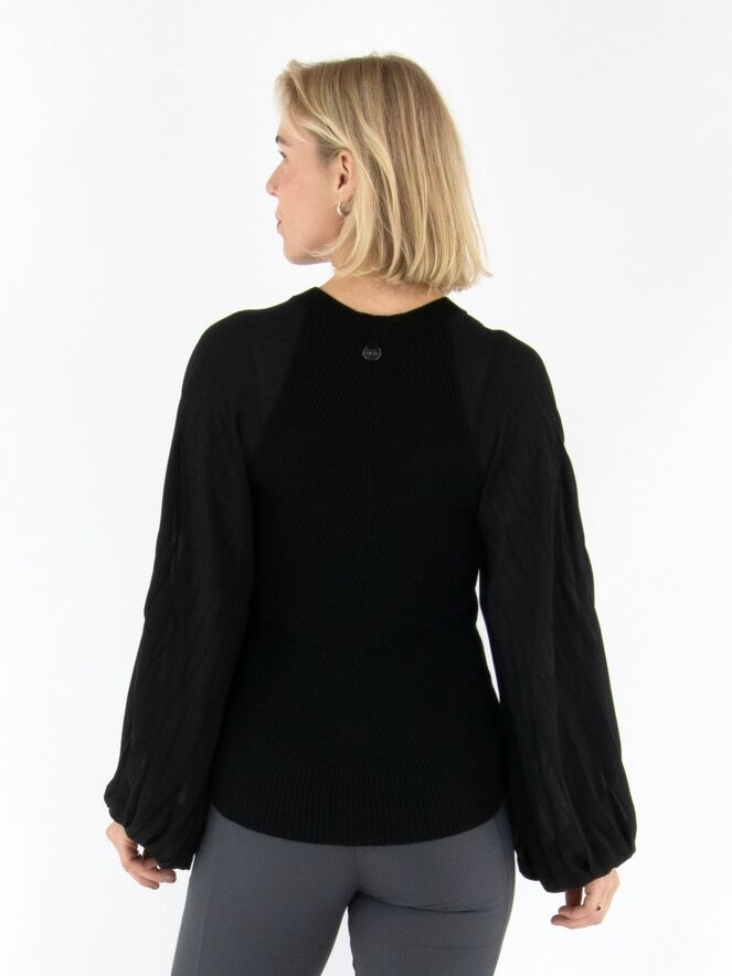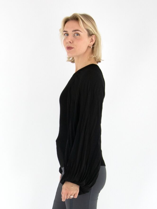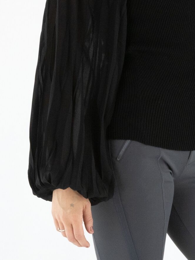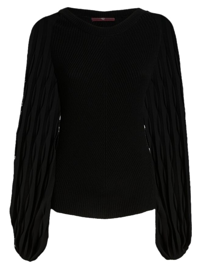 Un pull finement côtelé de High en noir. Les lignes côtelées partent du centre pour former une élégante structure en chevrons. Les manches amples en voile se terminent par un passepoil le long duquel le tissu est délicatement plissé, apportant une touche aérienne et féminine. Le pull présente une encolure ronde et peut être lavé à la main.