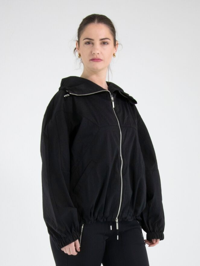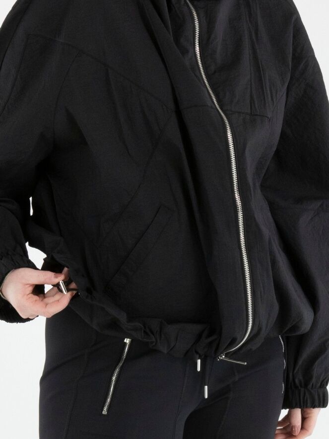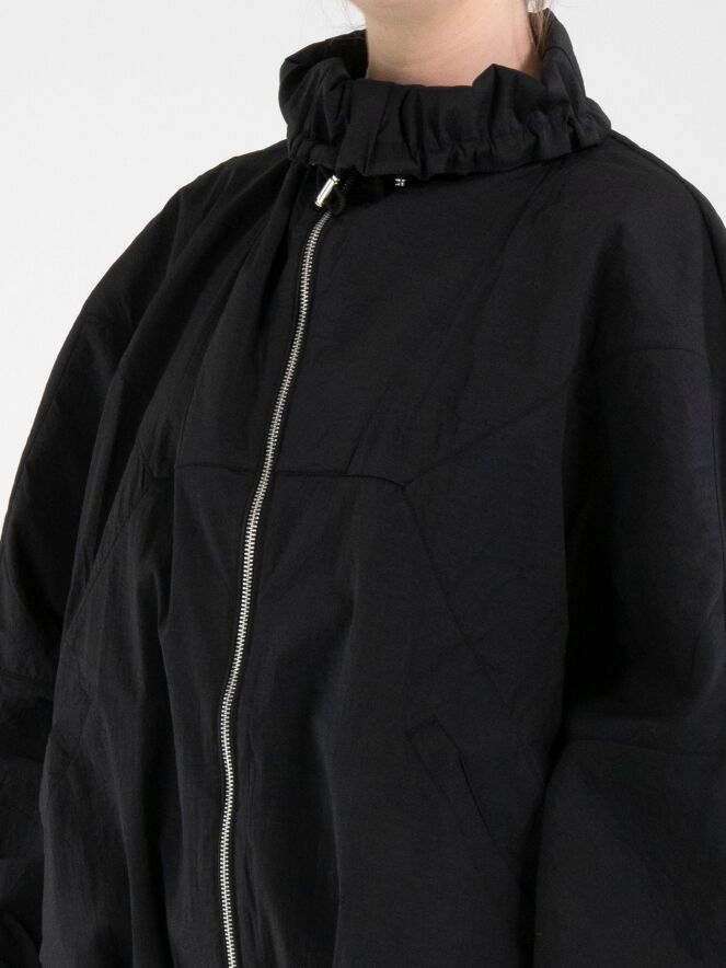 Un manteau de High de couleur noire. Un cordon passe dans une coulisse le long du bord du col et au bas du manteau, permettant de créer un effet plissé. Le bord des manches longues est fini par une bande élastique finement plissée. Le manteau est doté de fermetures zippées argentées et de poches fendues. Ce manteau peut être lavé à la main.