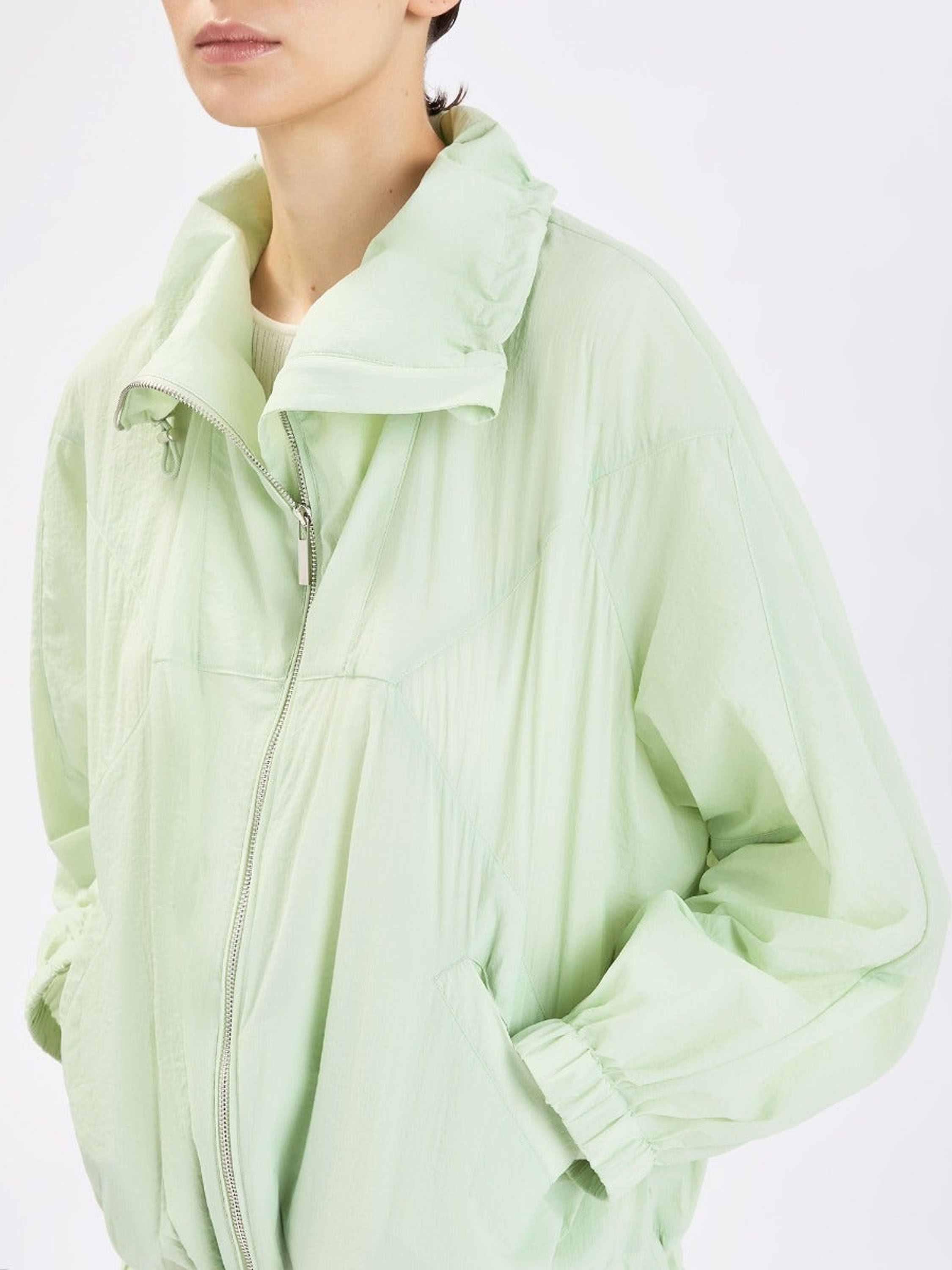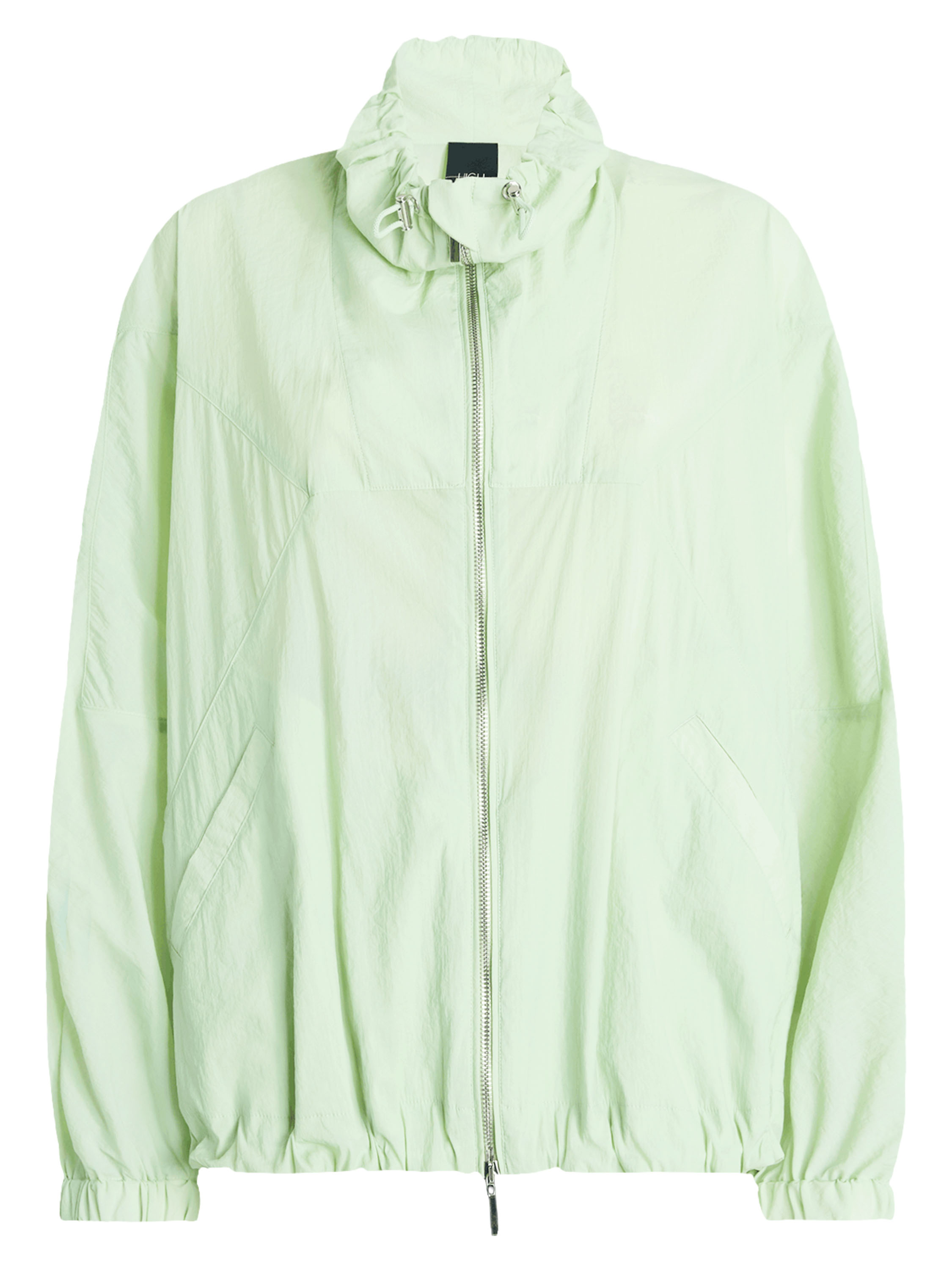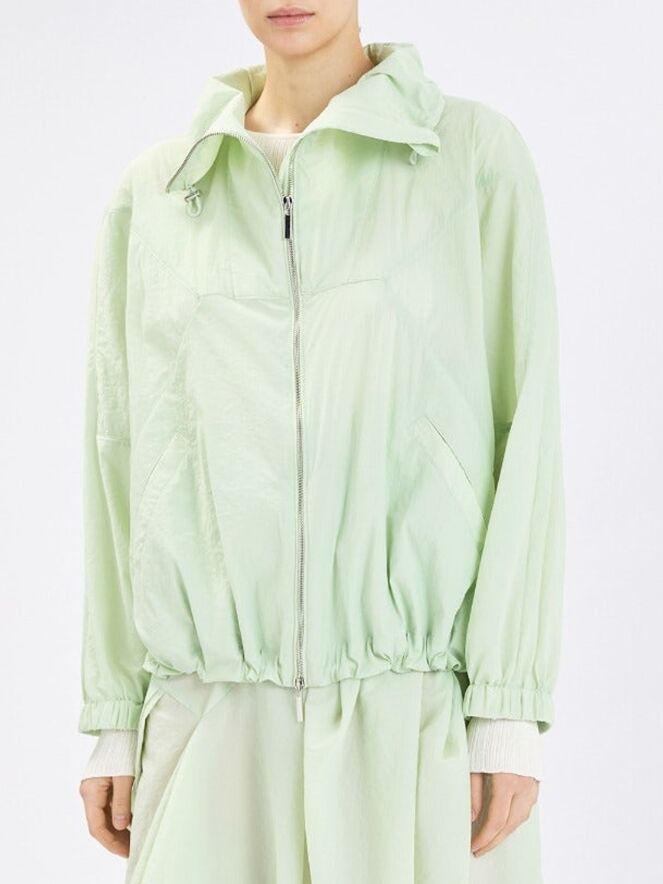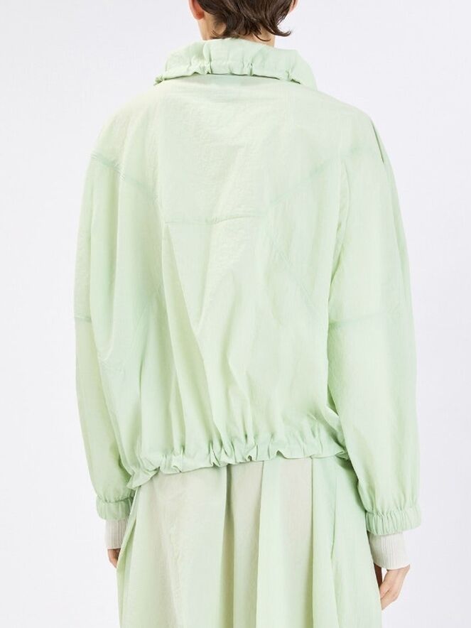 Un manteau de High de couleur vert menthe doux. Un cordon dans une coulisse est intégré dans le bord du col et à l’ourlet, permettant de créer un effet plissé. Le bord des manches longues est fini par une bande élastique finement plissée. Le manteau possède des fermetures zippées argentées et des poches fendues. Ce manteau peut être lavé à la main.