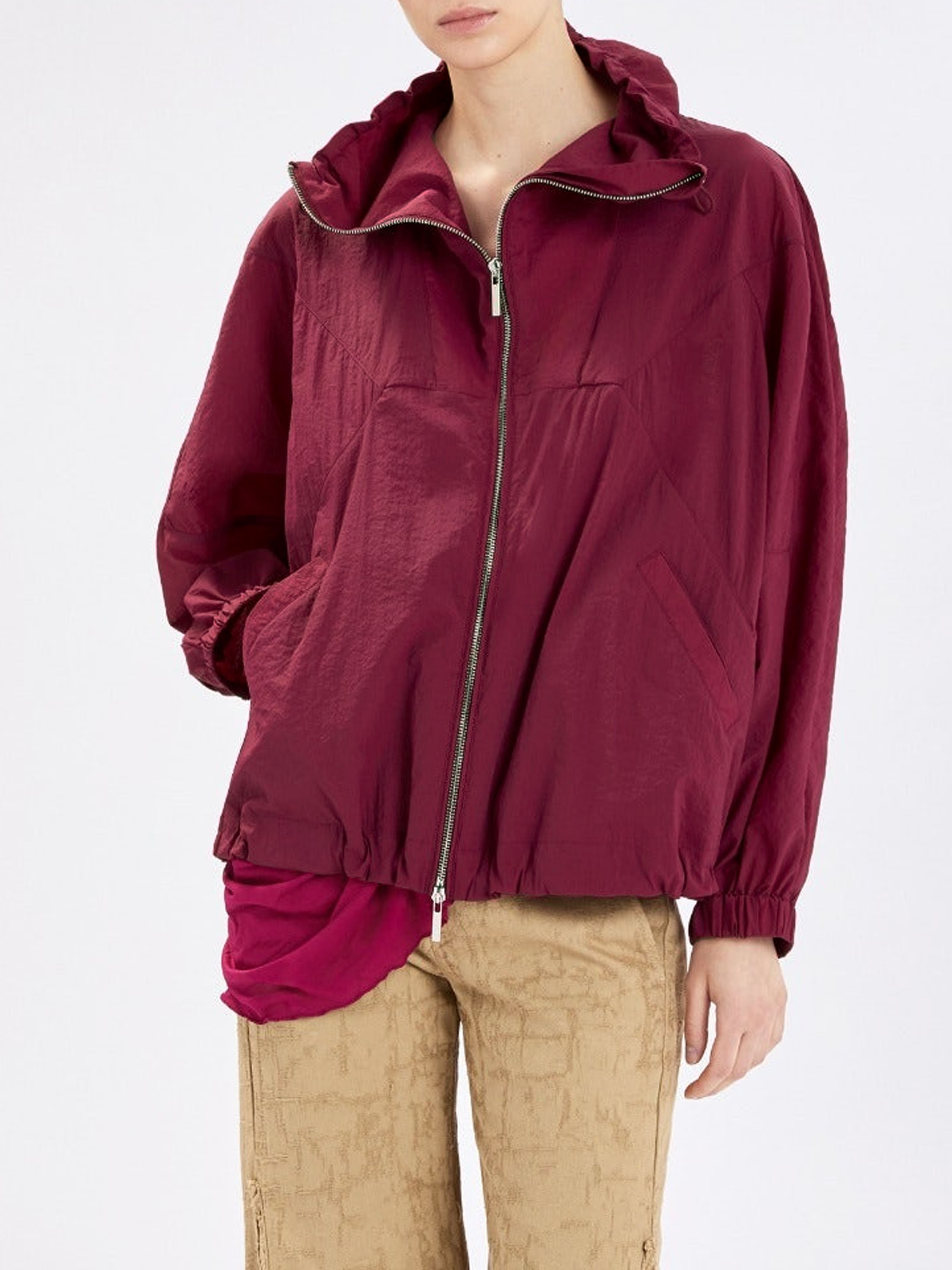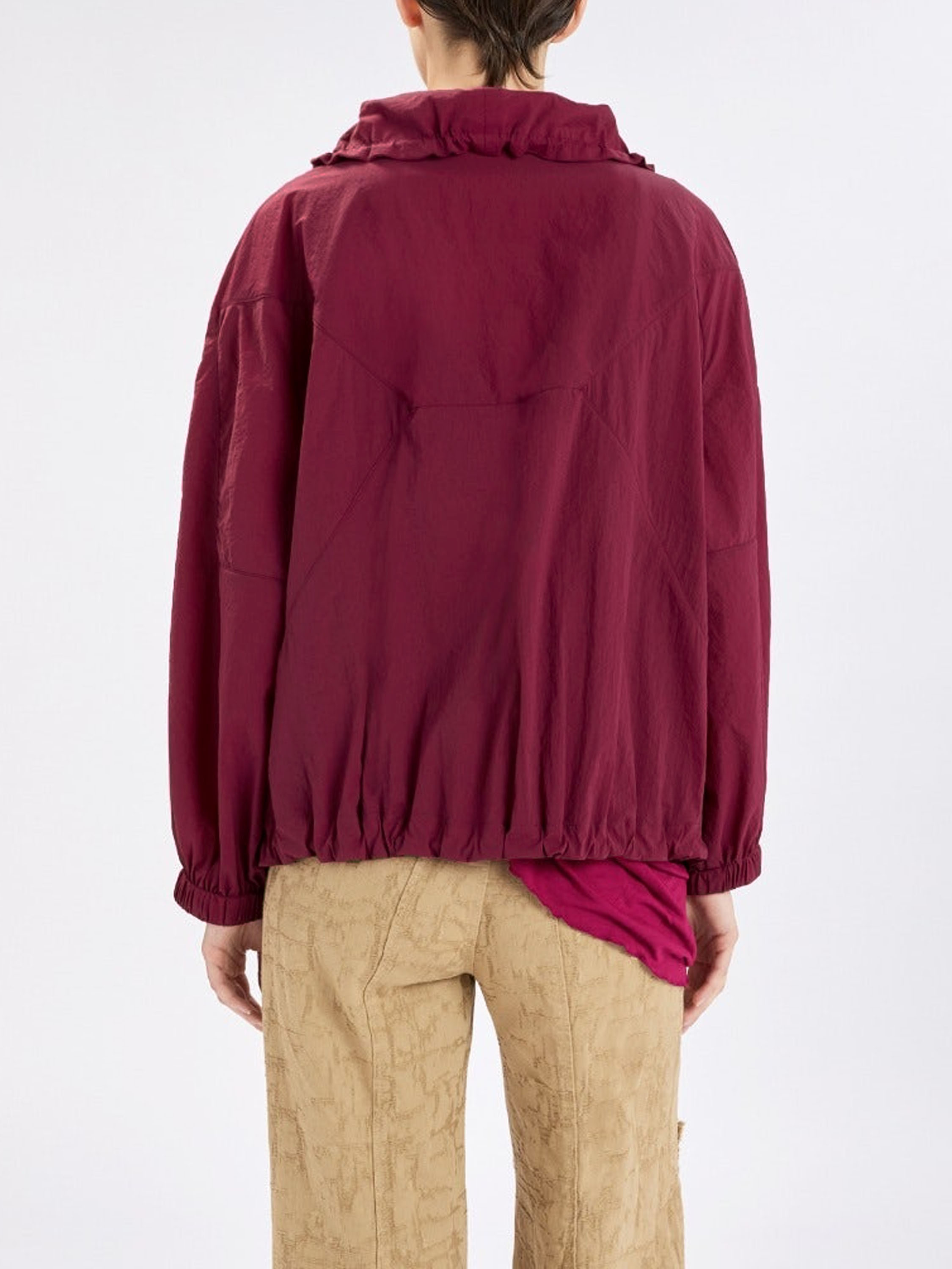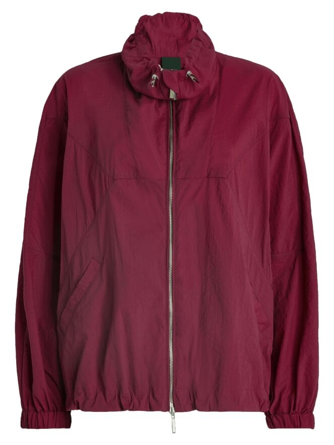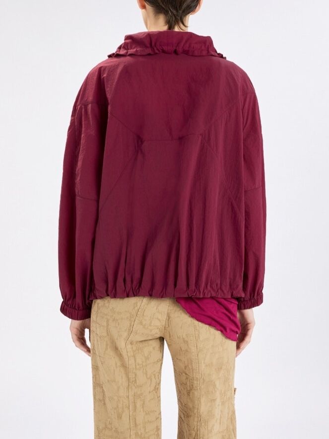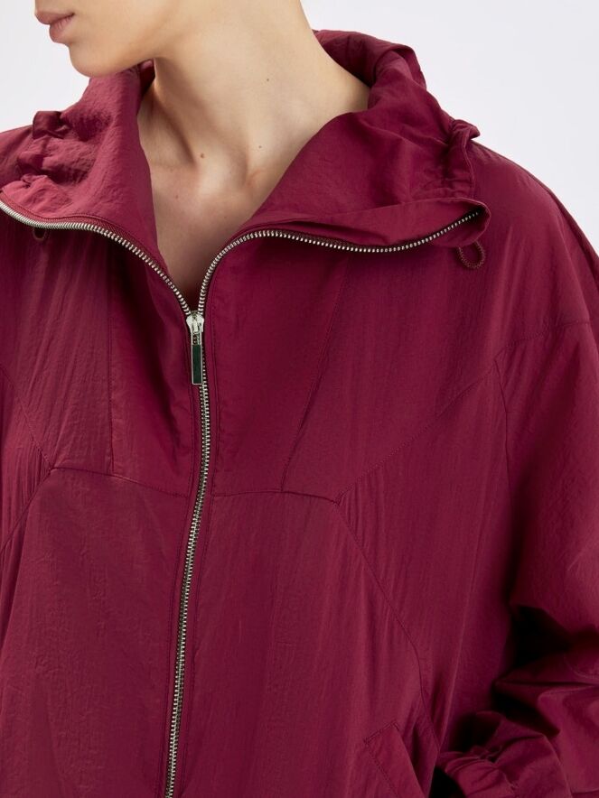 Un manteau de High de couleur framboise. Un cordon passe dans une coulisse le long du bord du col et au bas du manteau, permettant de créer un effet plissé. Le bord des manches longues est fini par une bande élastique finement plissée. Le manteau est doté de poches fendues avec fermeture zippée argentée. Ce manteau peut être lavé à la main.