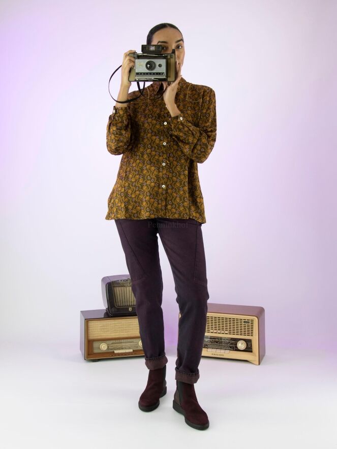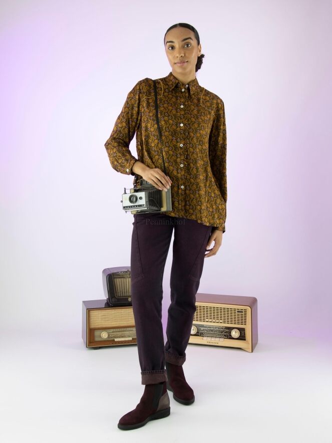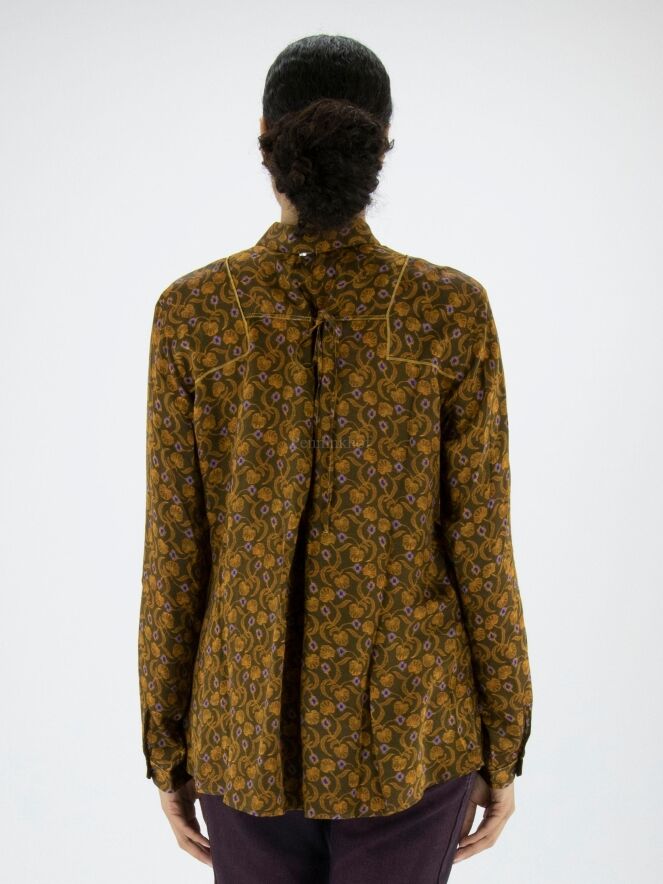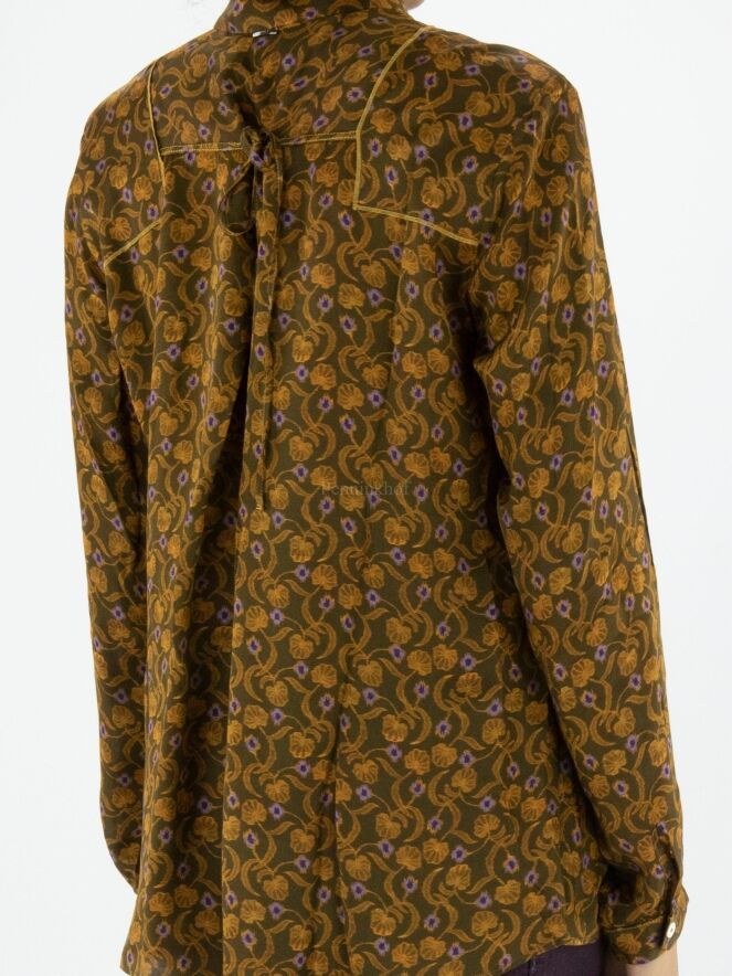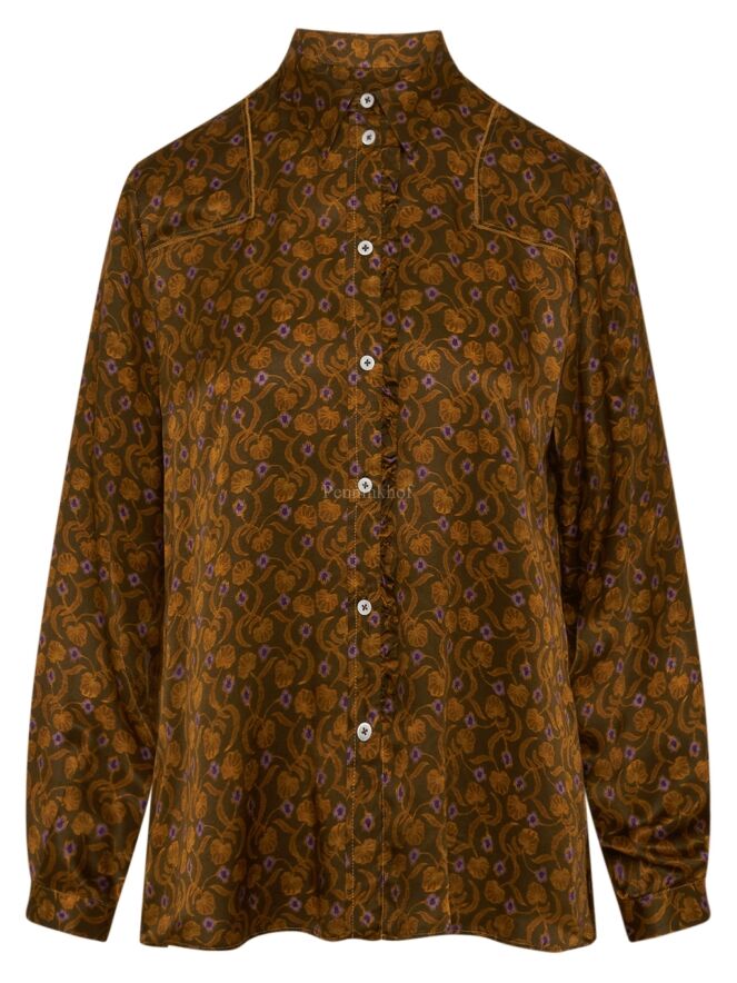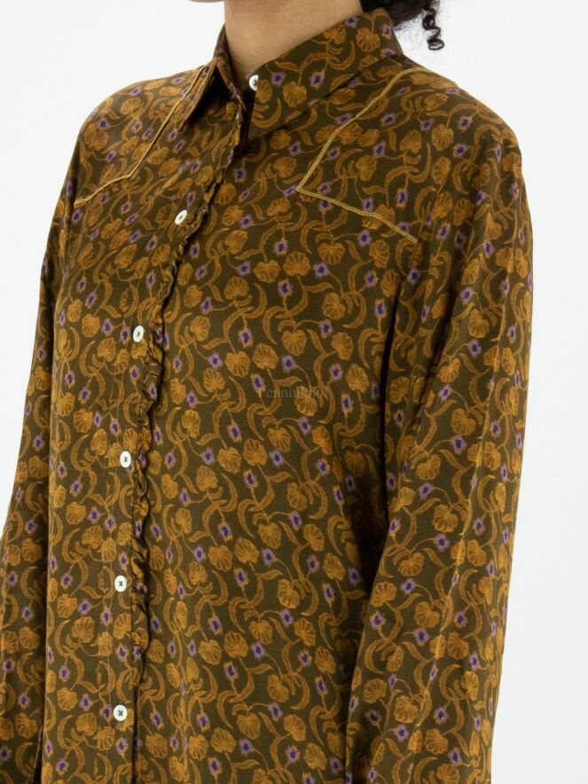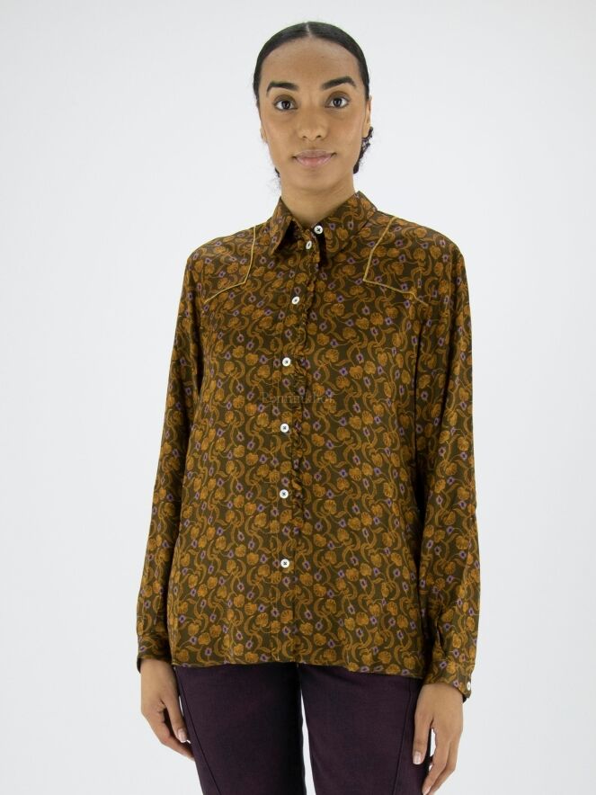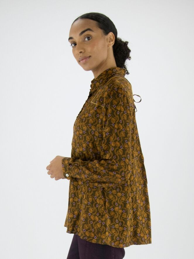Chemisier de High à l'imprimé floral et pétale aux couleurs orange et lilas sur fond vert olive. Le long de la fermeture se trouve une fine bordure plissée dans le même tissu que la blouse. Ce chemisier peut être lavé à la main.
