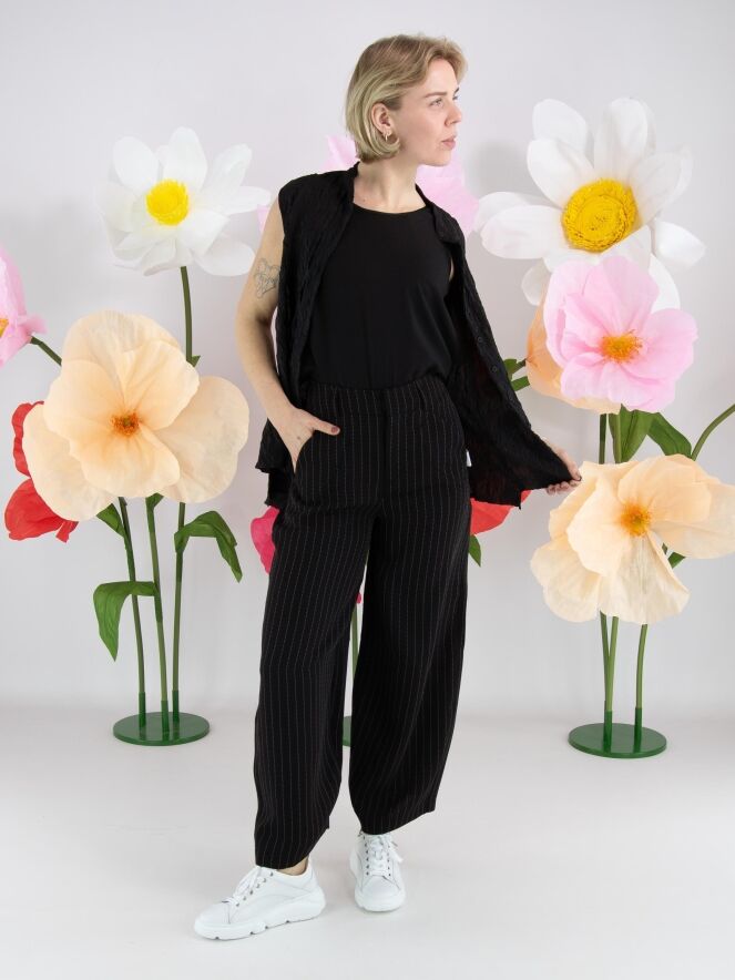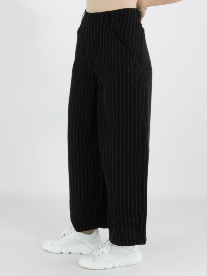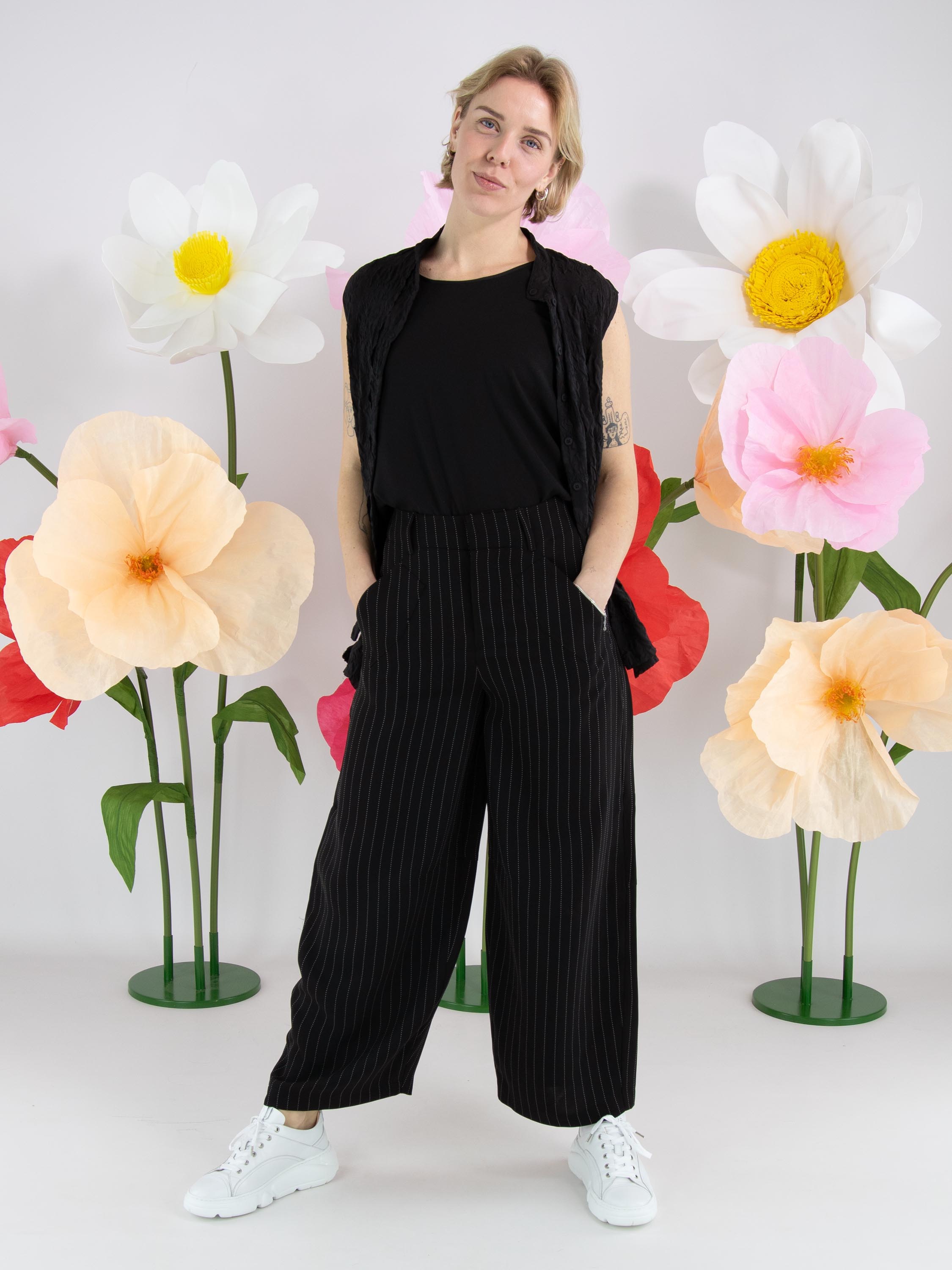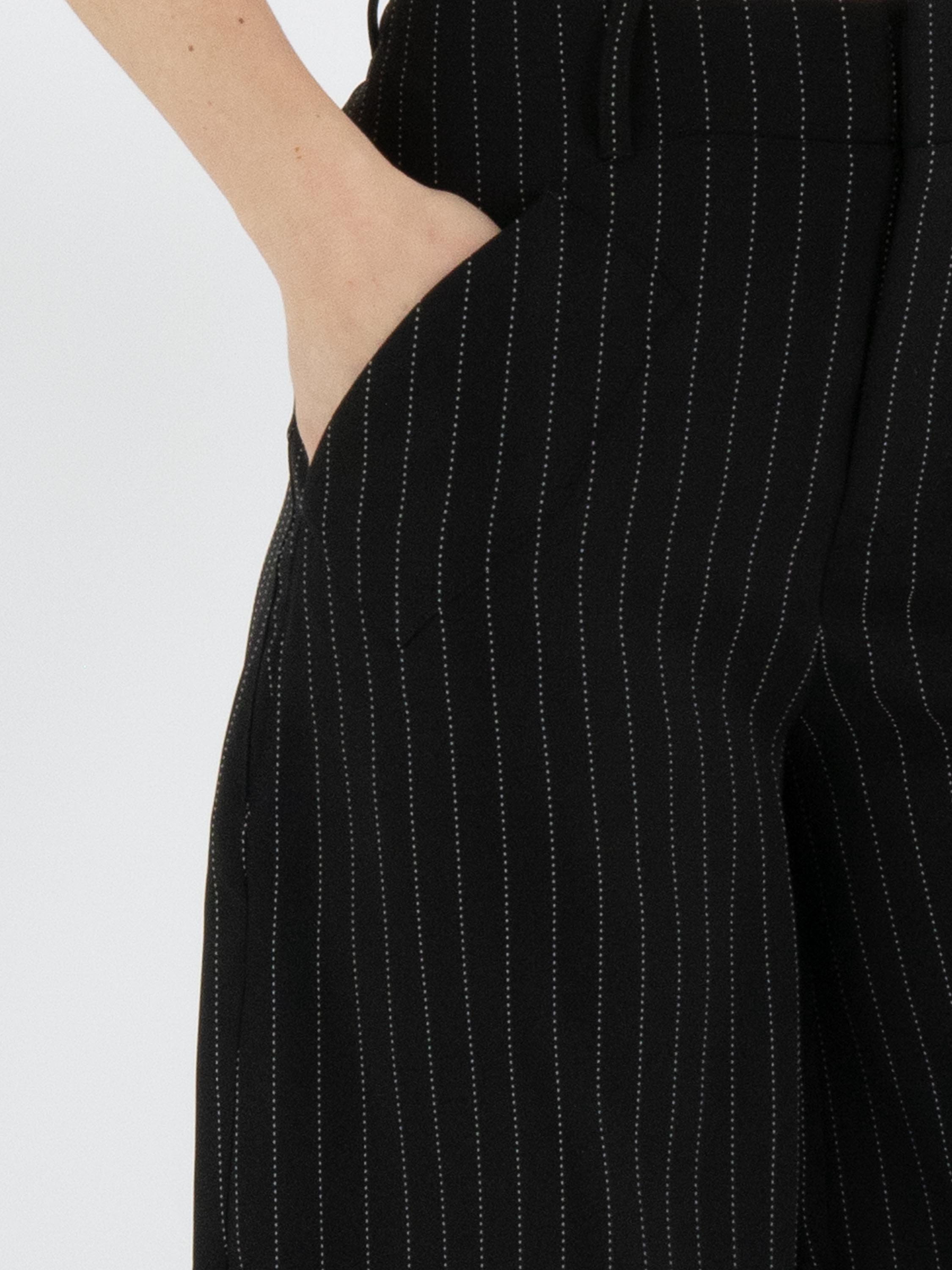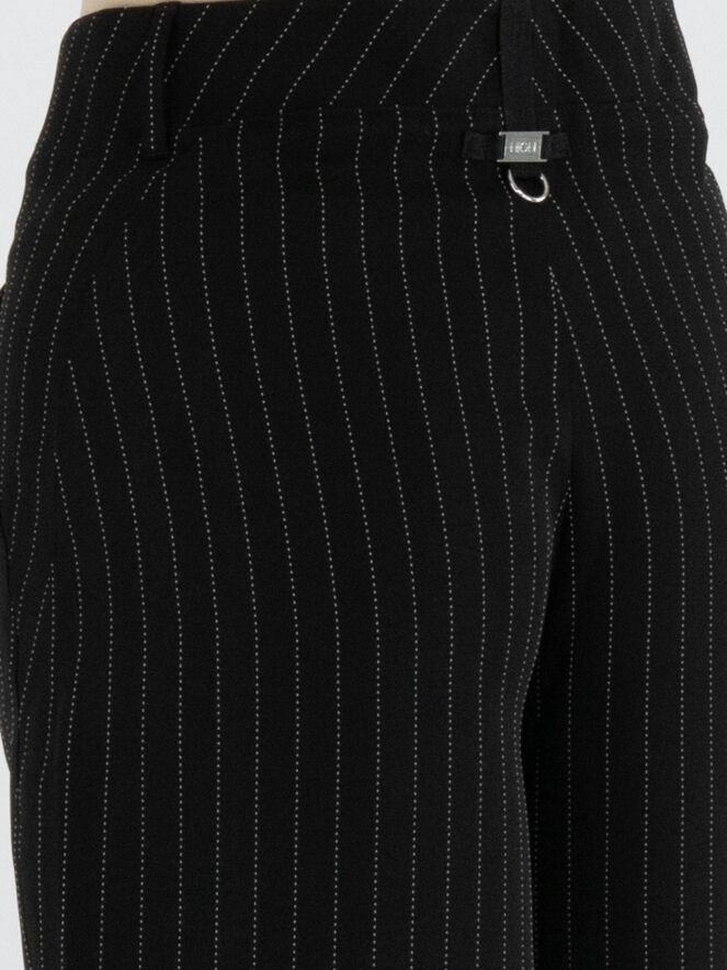 Un pantalon à fines rayures craie de High Tech en noir avec des coutures blanches. Au niveau du genou se trouve une couture horizontale. Le pantalon possède des poches fendues aux bords coupés en diagonale. Ce pantalon peut être lavé à la main.