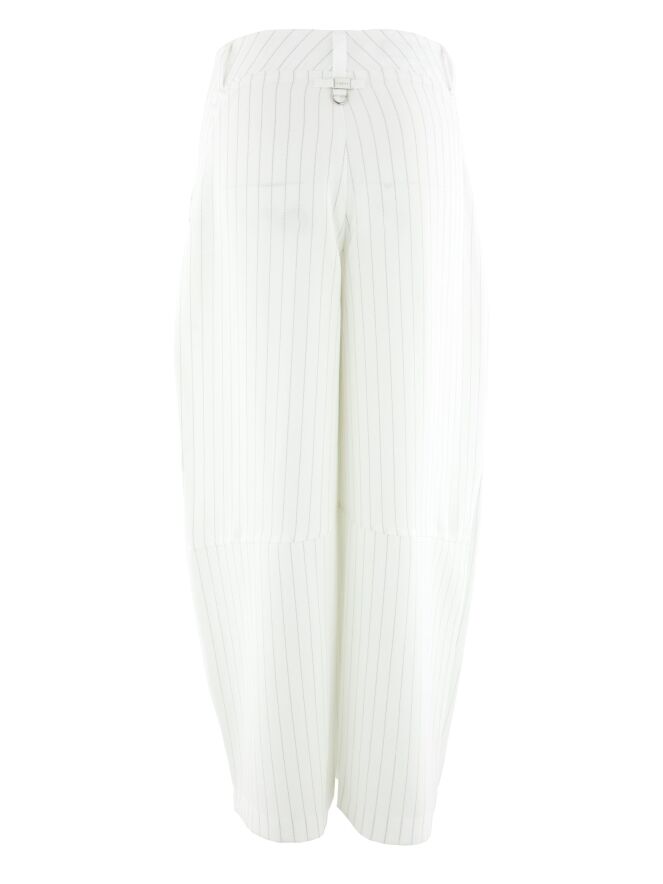 Un pantalon à rayures craie de High Tech en blanc cassé avec des surpiqûres noires. Une couture horizontale se situe au niveau du genou. Le pantalon possède des poches fendues aux bords coupés en diagonale. Ce pantalon peut être lavé à la main.