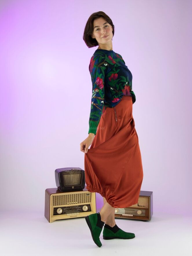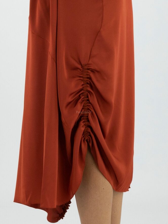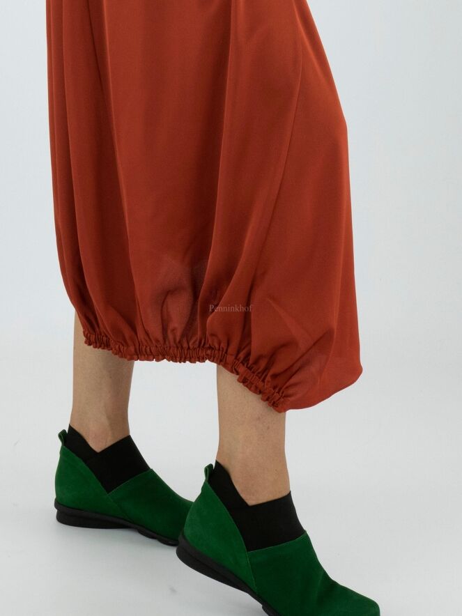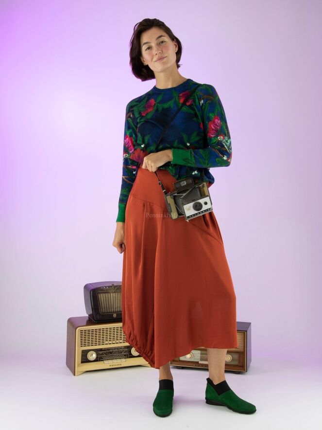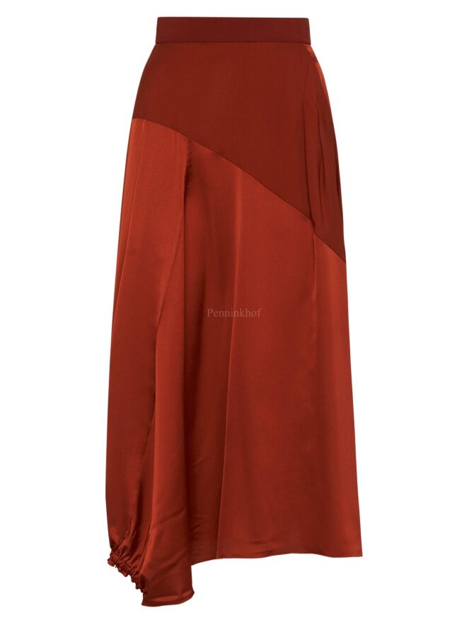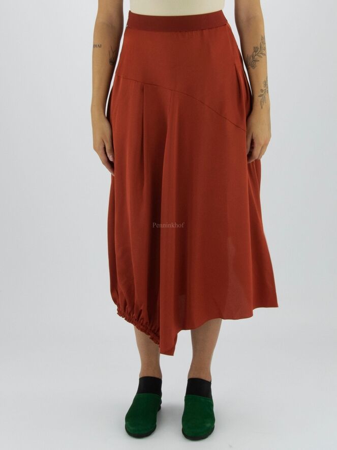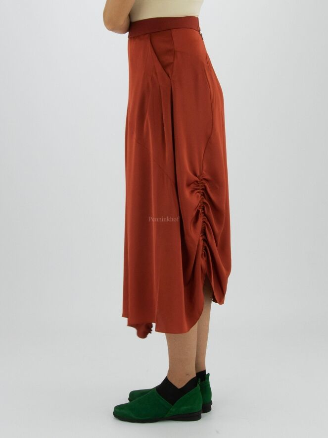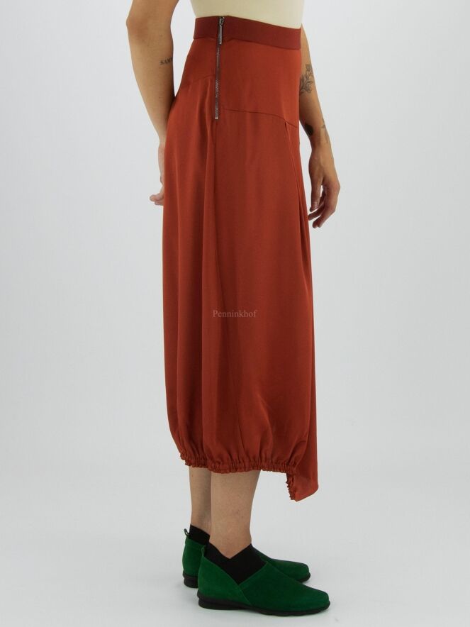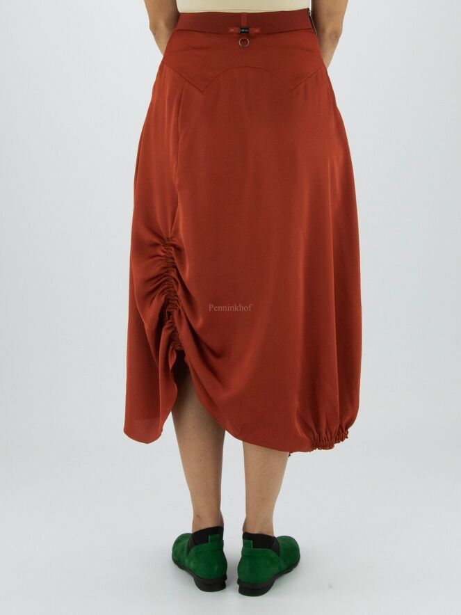 Jupe de couleur rouille de la marque High. La taille est élastiquée. Au dos, sur le côté gauche, une couture verticale à plis fins est réalisée à partir de la hauteur du genou. Sur le côté droit se trouve une fermeture à glissière à partir de la taille et sur le côté gauche se trouve une pochette à glissière. Cette jupe peut être lavée à la main.