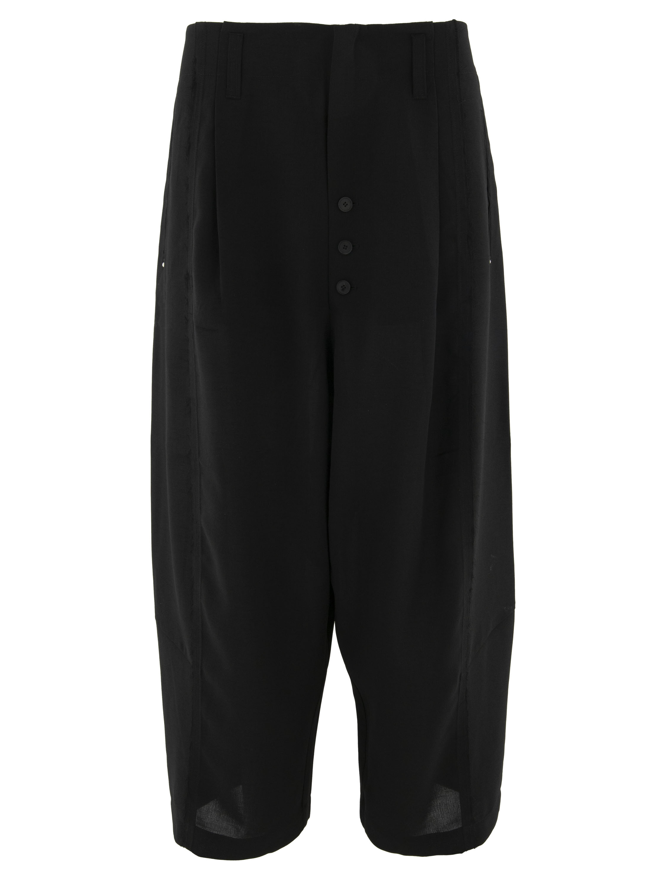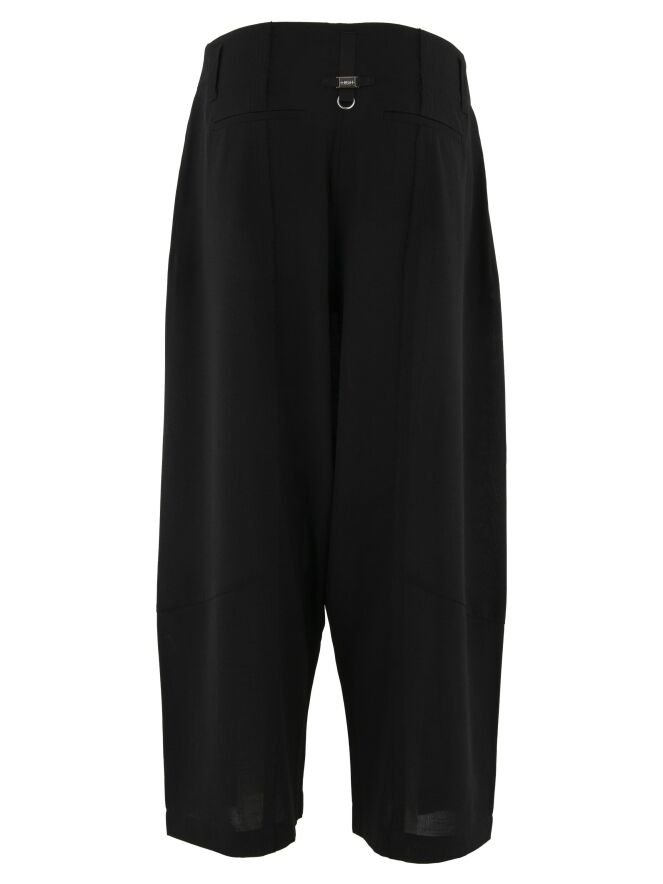 Un pantalon large de High en noir. Le pantalon est doté d’une fermeture éclair invisible avec des boutons en dessous. La double couture au centre des jambes est finement effilochée le long des bords. Deux plis plats partent de la taille. Le pantalon possède des poches latérales et peut être lavé à la main.