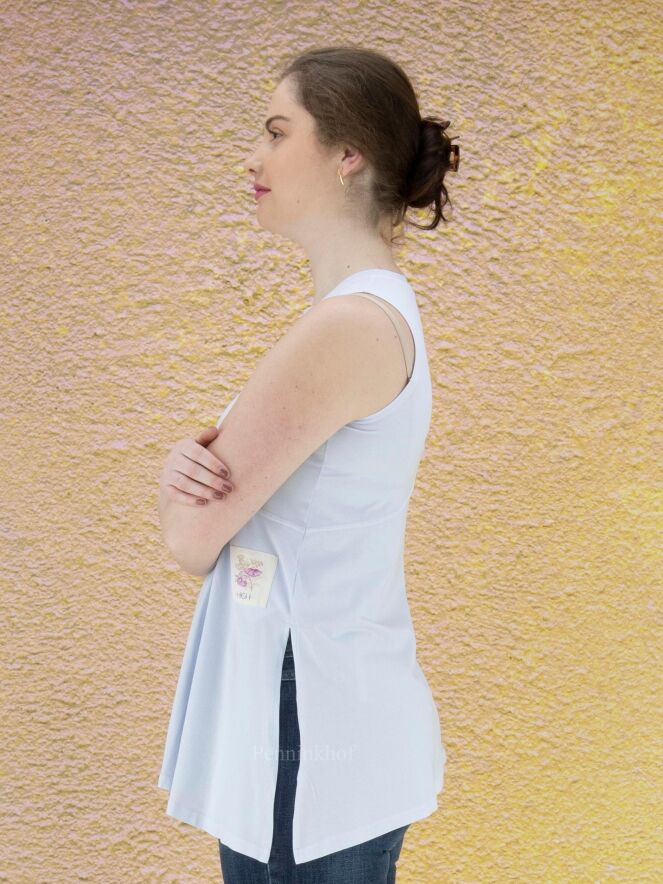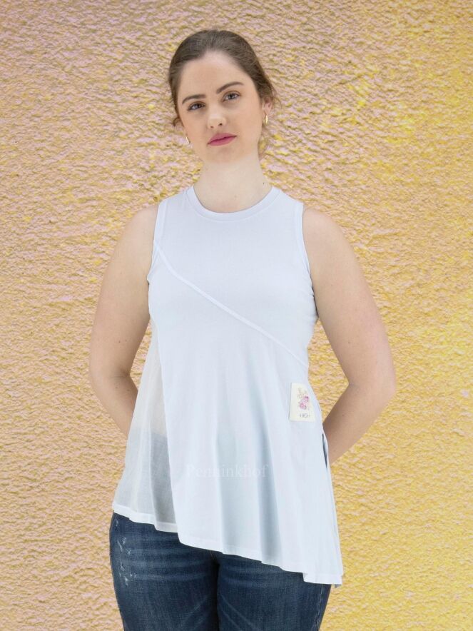 Top à la coupe diagonale de la marque High, de couleur bleu lavande. Le côté gauche est légèrement transparent. Le bas du top est coupé en diagonale qui est accentuée par une profonde fente sur le côté droit. Ce top a une ligne A. Le col ras-du-cou et les emmanchures sont bordées de côtes. Lavage à la main.