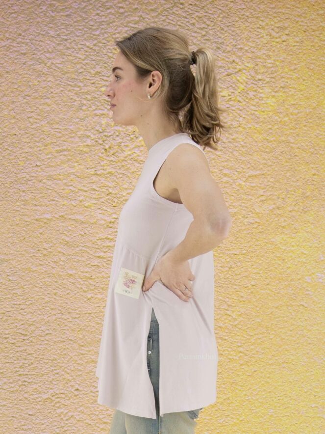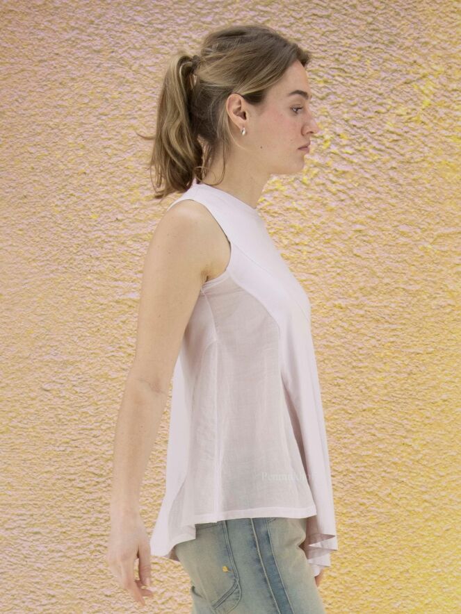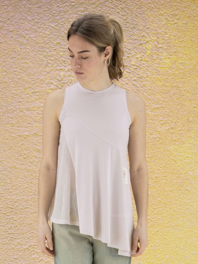 Top à la coupe diagonale de la marque High, de couleur lilas. Le côté gauche est légèrement transparent. Le bas du top est coupé en diagonale qui est accentuée par une profonde fente sur le côté droit. Ce top a une ligne A. Le col ras-du-cou et les emmanchures sont bordées de côtes. Lavage à la main.