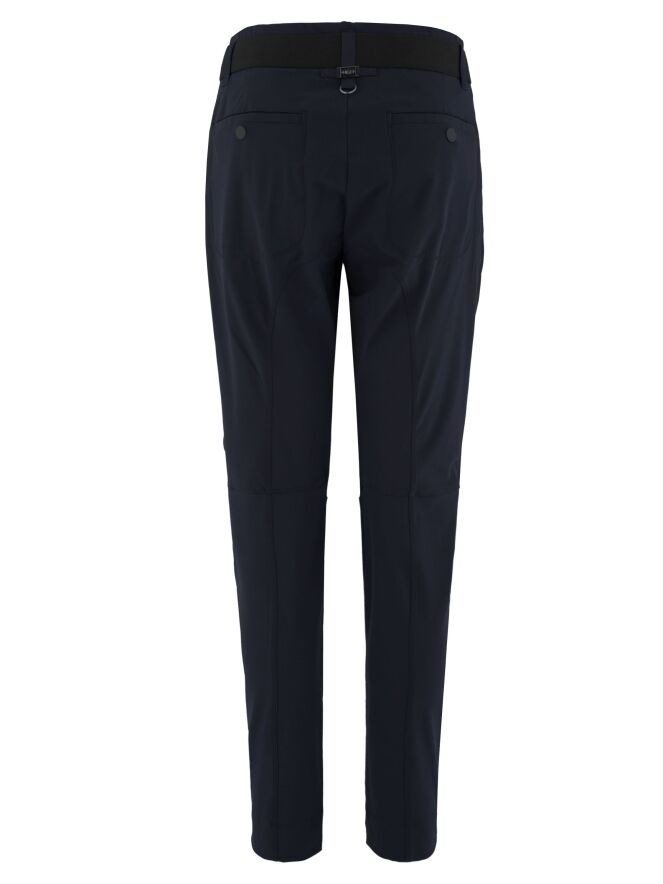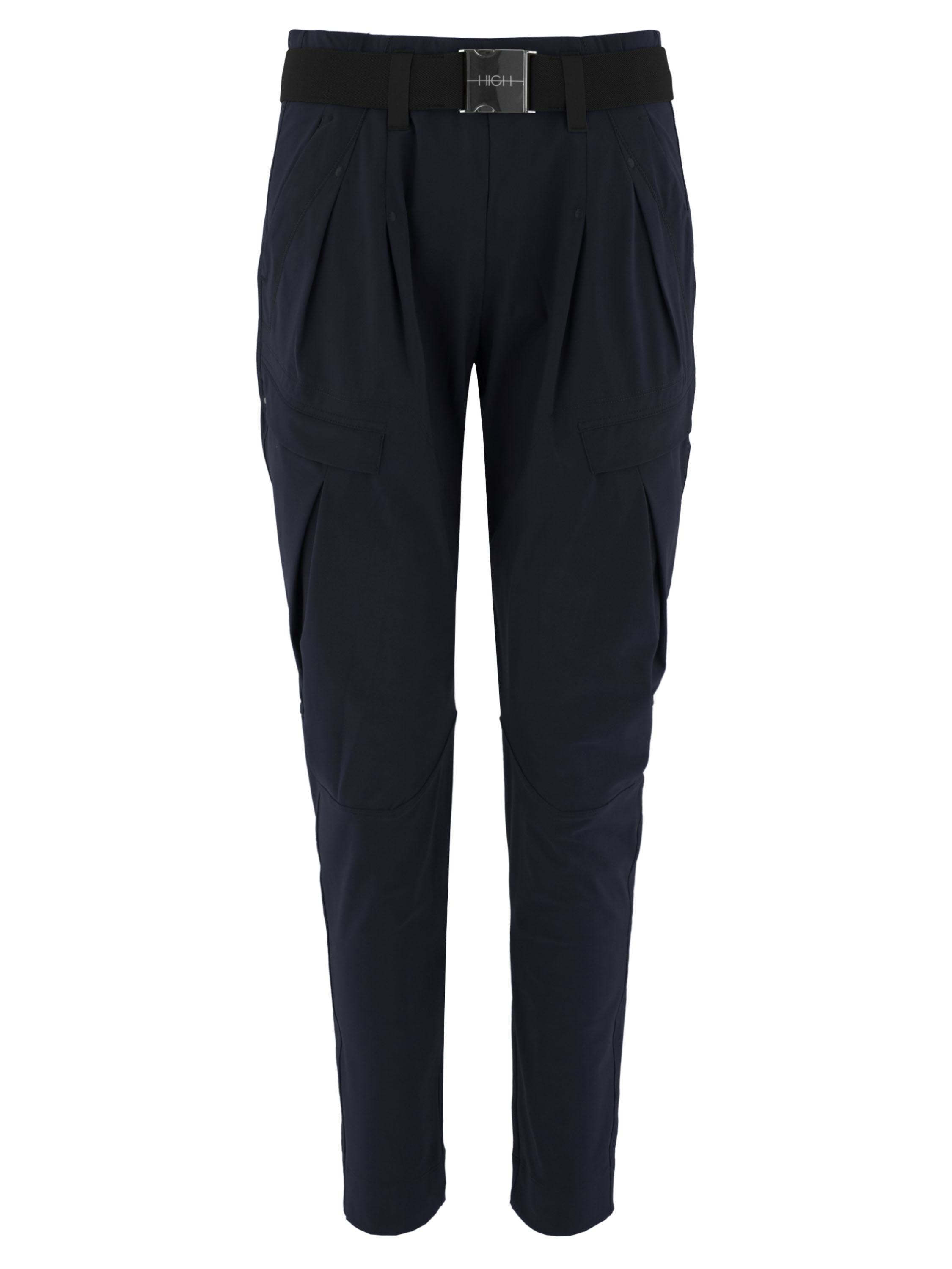 Un pantalon de High en bleu marine. La taille est dotée d’une ceinture élastique avec une boucle rectangulaire argentée, sous laquelle se trouvent plusieurs plis de ceinture. Un pli longe l’extérieur du haut de la jambe. Le pantalon possède des poches latérales et peut être lavé à la main.