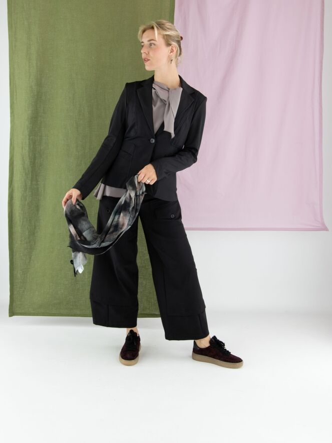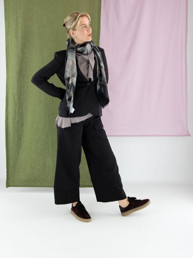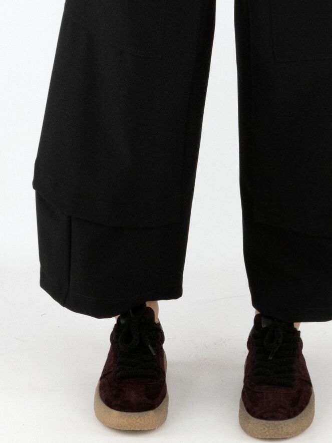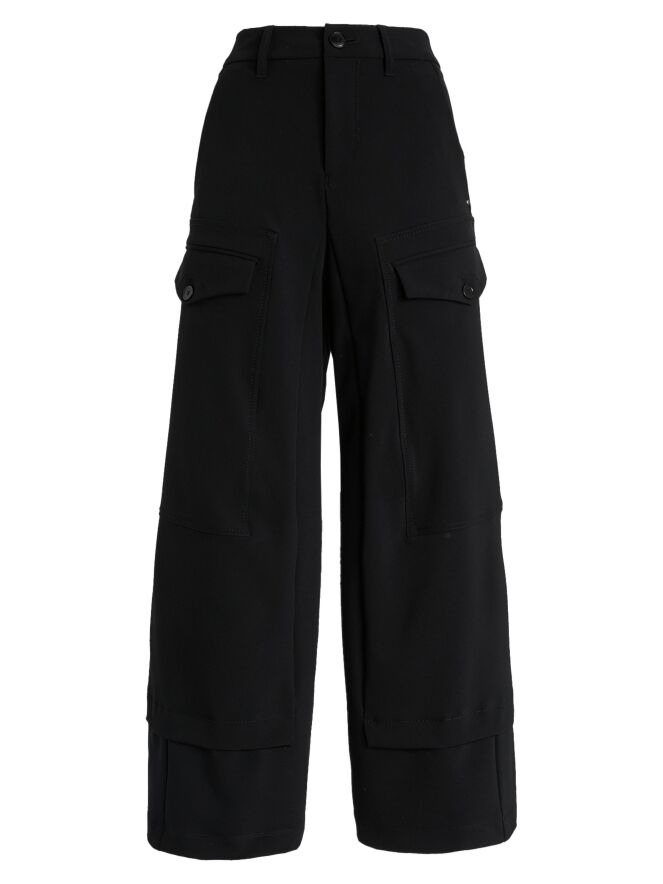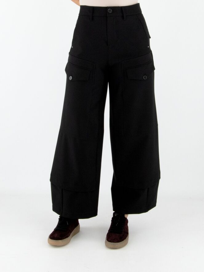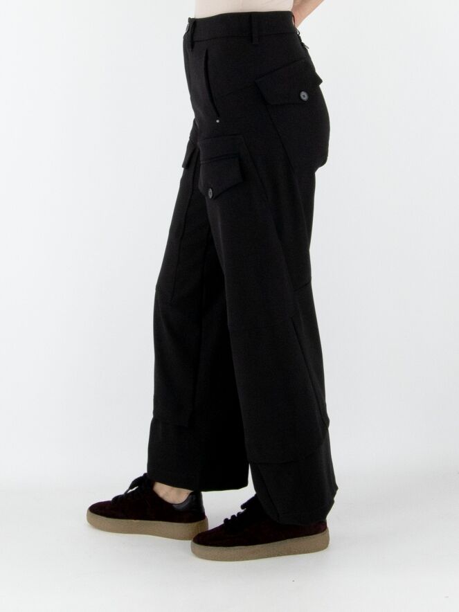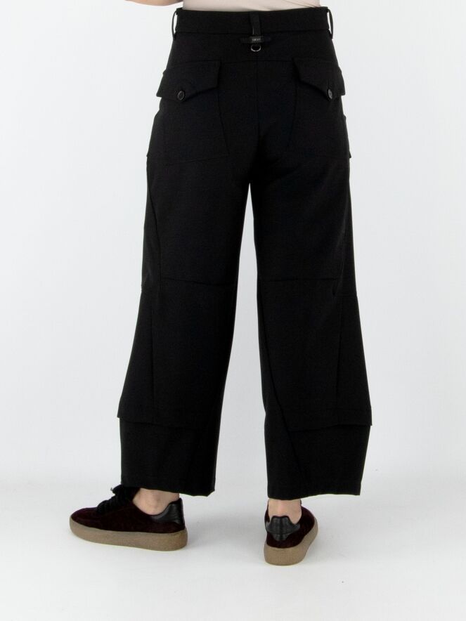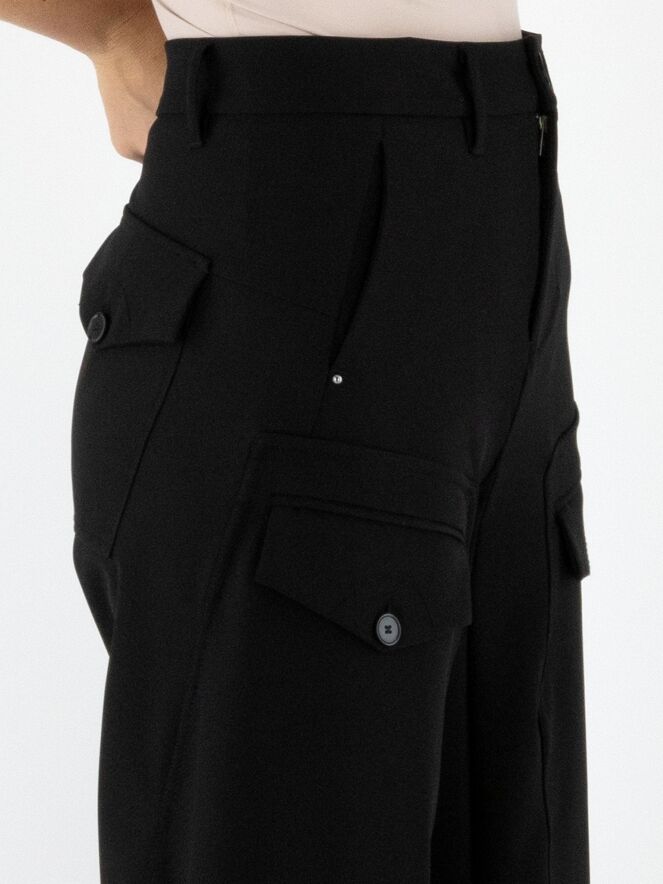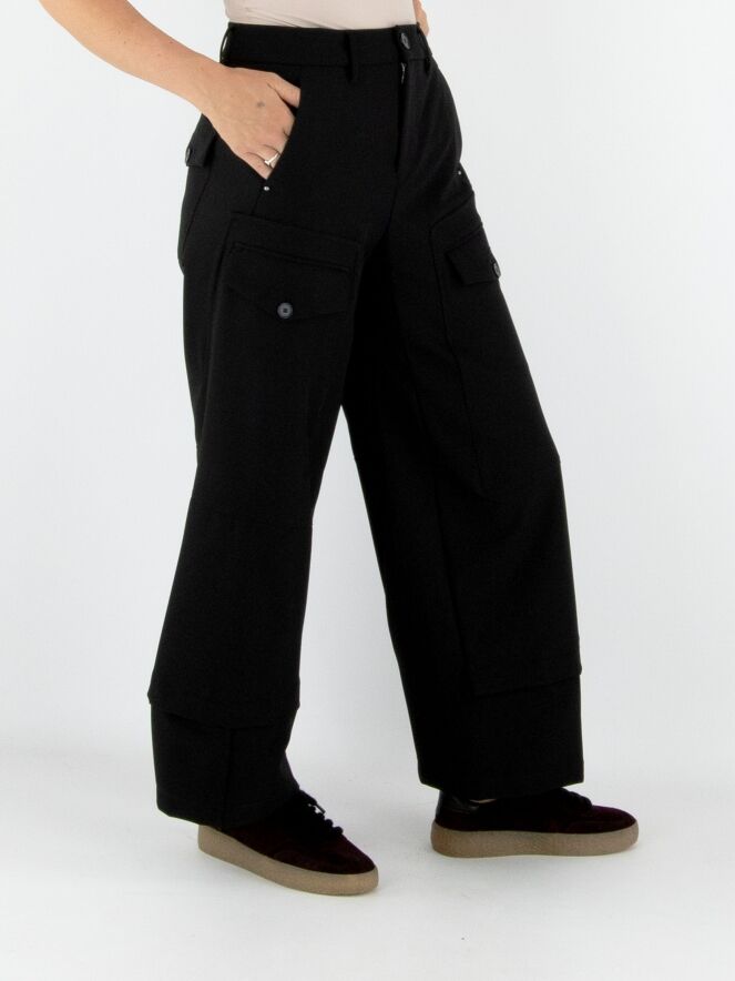 Pantalon High en noir. Deux poches à rabat avec fermeture par bouton sont placées sur le haut des cuisses. Des poches latérales se trouvent sous la taille. Une patte croisée au bas des jambes crée l’illusion d’un second tissu apparaissant sous le pantalon. Ce pantalon peut être lavé à 30 degrés.