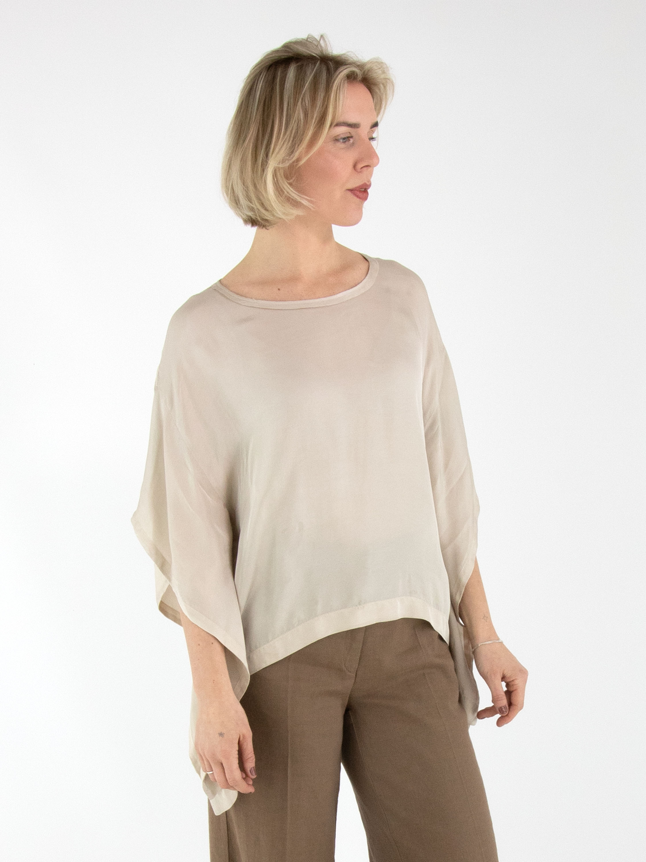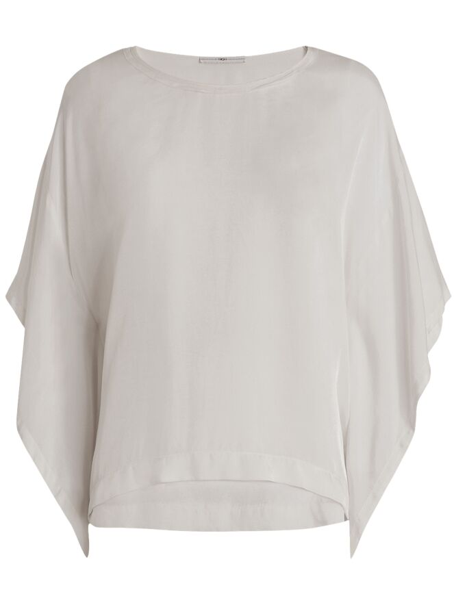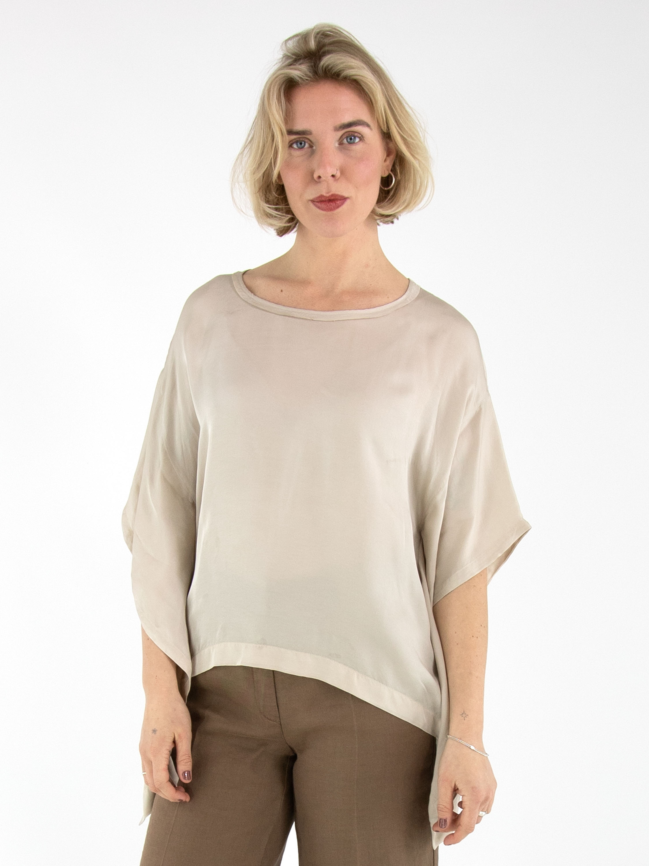 Un haut en satin mat de High dans une teinte beige. Le haut présente une encolure ronde et des manches chauve-souris. Ce haut peut être lavé à 30 degrés.