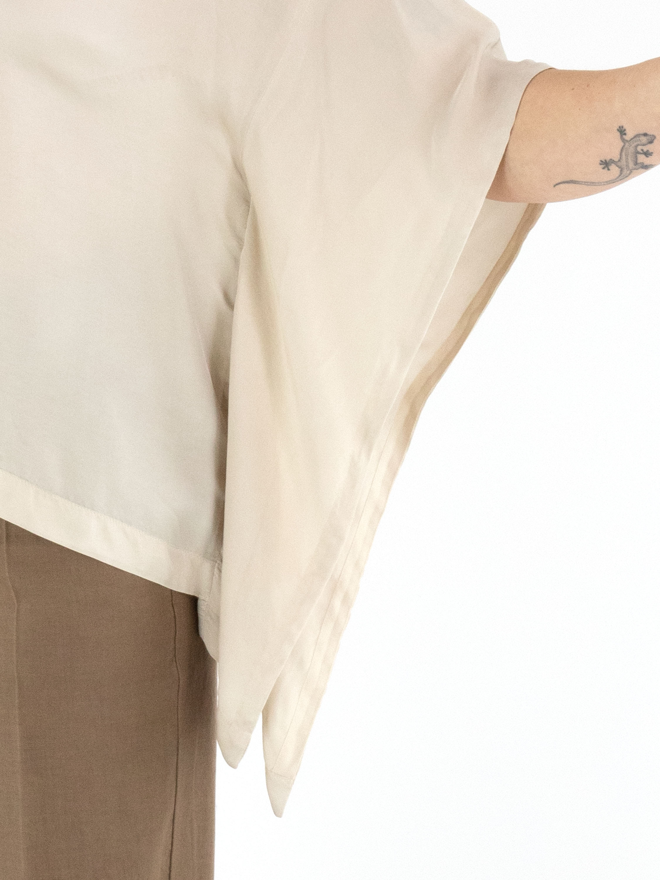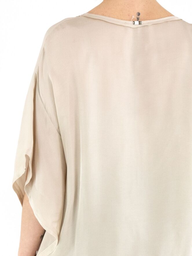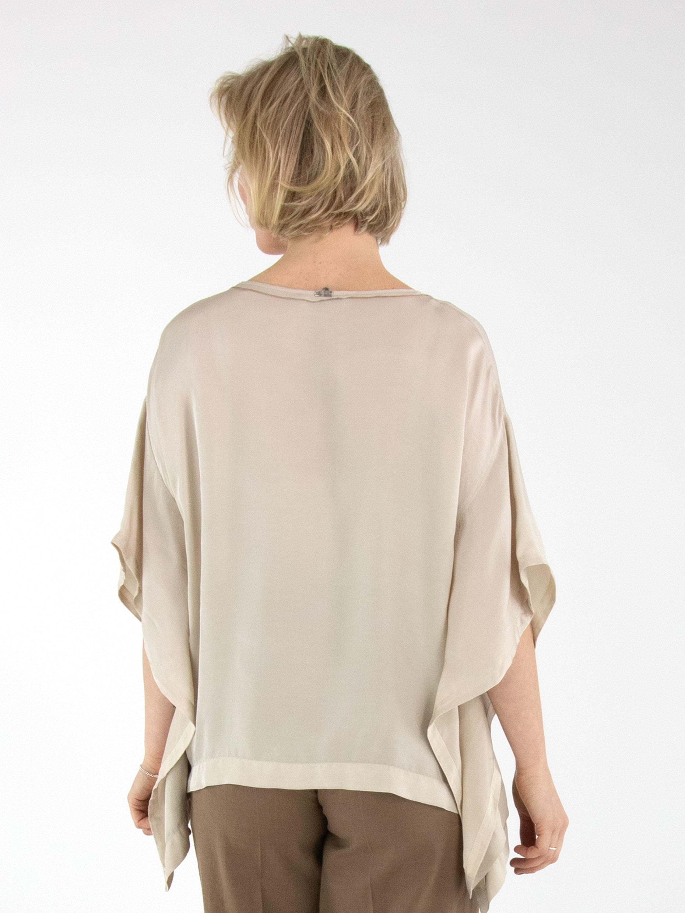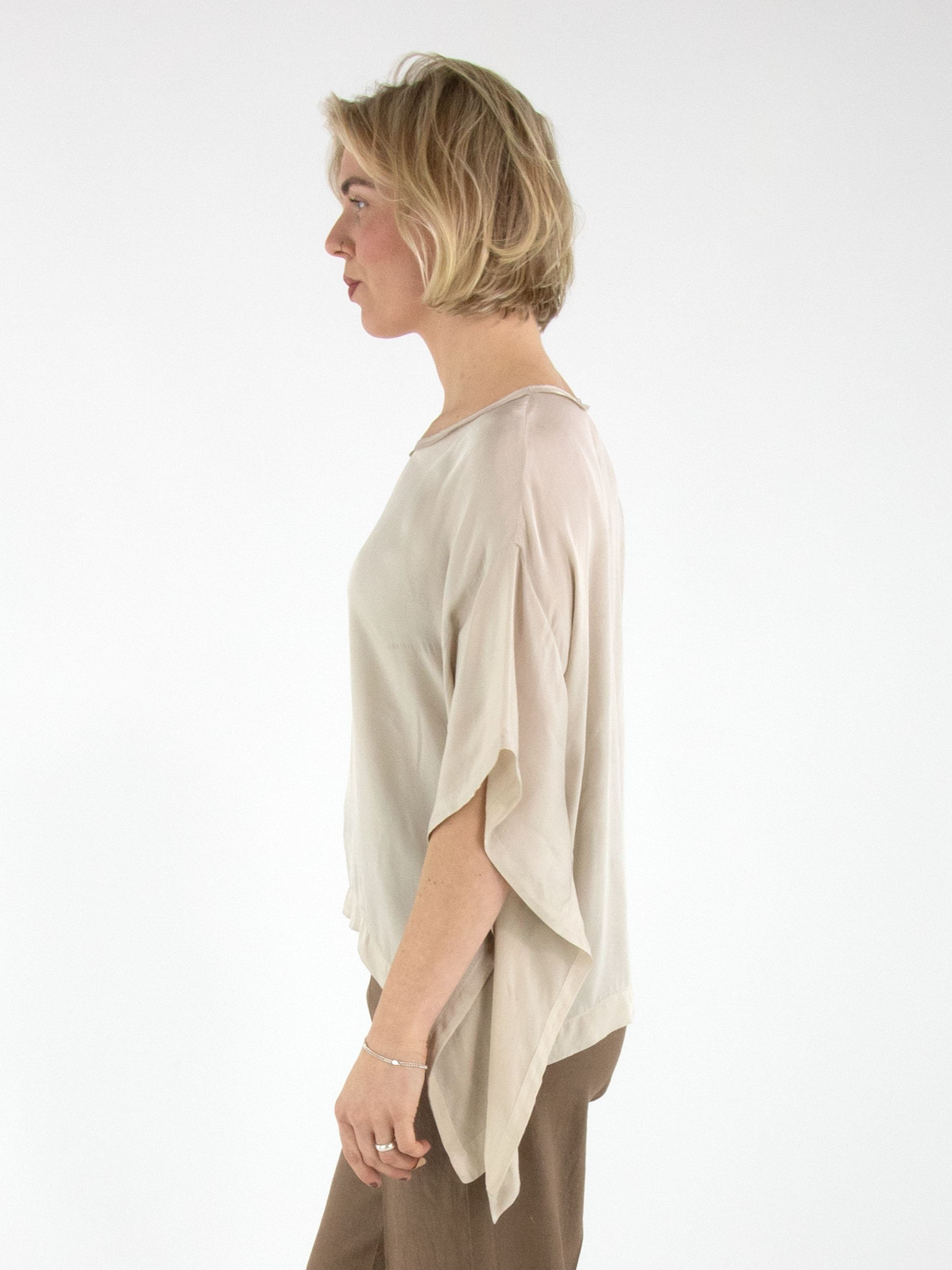 Un haut en satin mat de High dans une teinte beige. Le haut présente une encolure ronde et des manches chauve-souris. Ce haut peut être lavé à 30 degrés.
