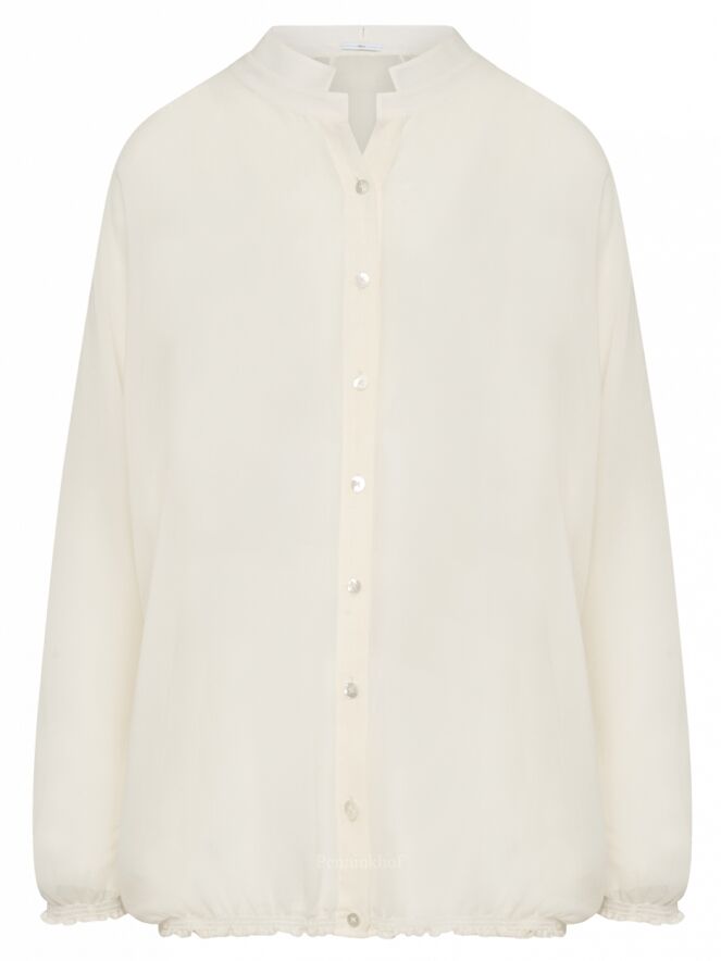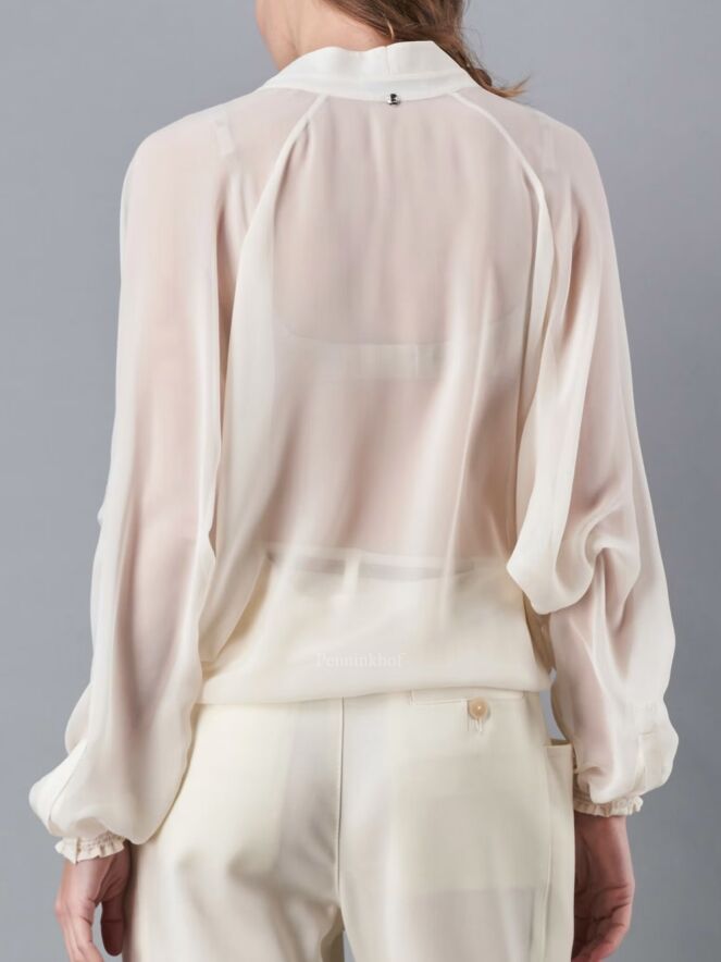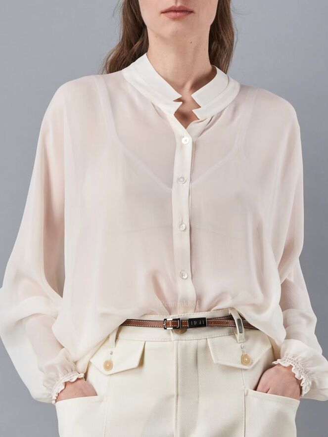 Luxueuse chemise ample semi-transparente de la marque High, de couleur blanc crème. La base et les extrémités des manches sont ornées couture élastique à volant. La chemise est dotée d'un col montant à découpe d'où part la patte de boutonnage. Lavage déconseillé.