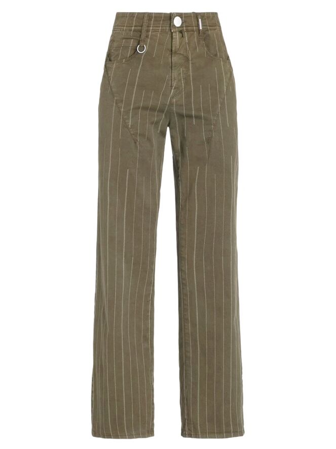 Pantalon de High avec un imprimé à fines rayures dans deux nuances de vert olive. Ce modèle 5 poches présente des poches arrondies, dont part un pli subtil se prolongeant en une couture diagonale vers le haut de la jambe, apportant une touche moderne et raffinée. Ce pantalon de créateur exclusif peut être lavé à 30 degrés.
