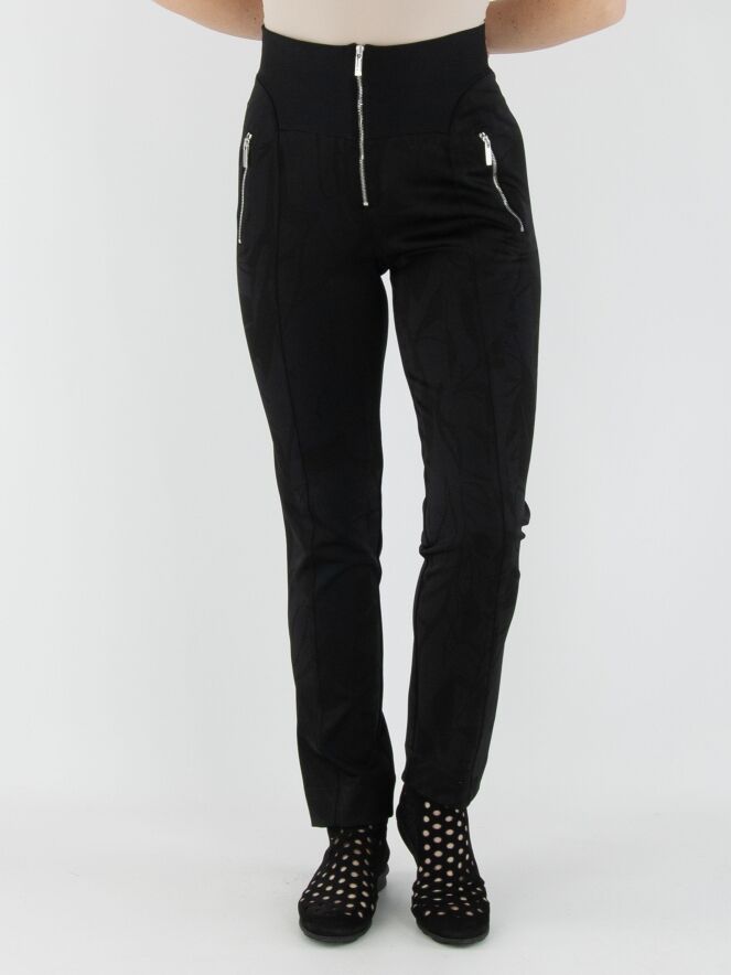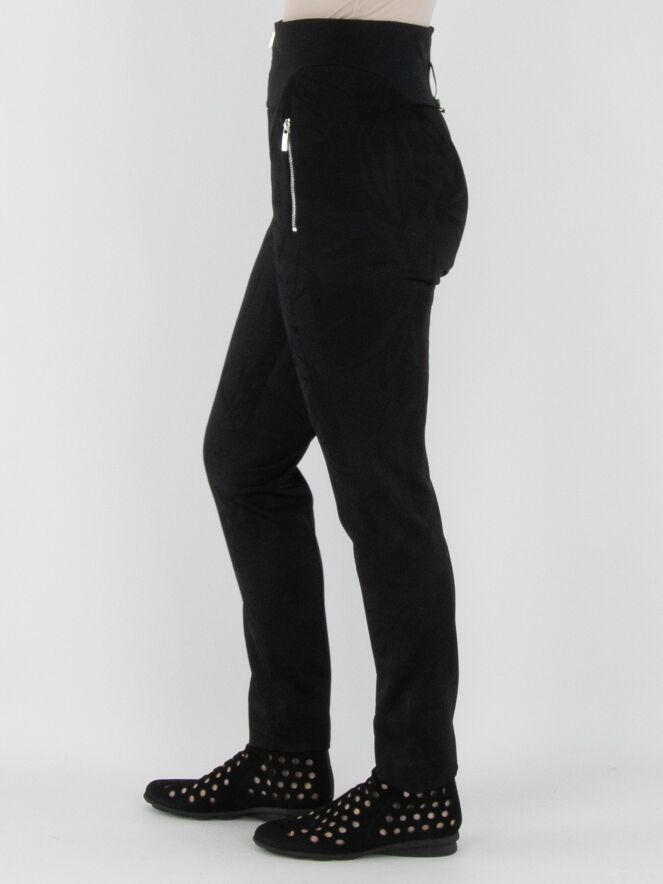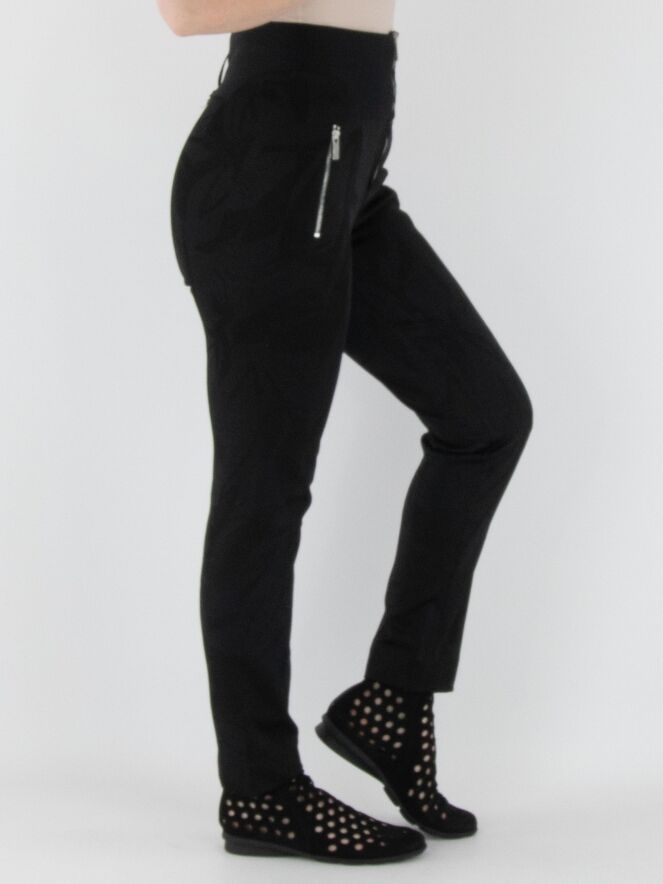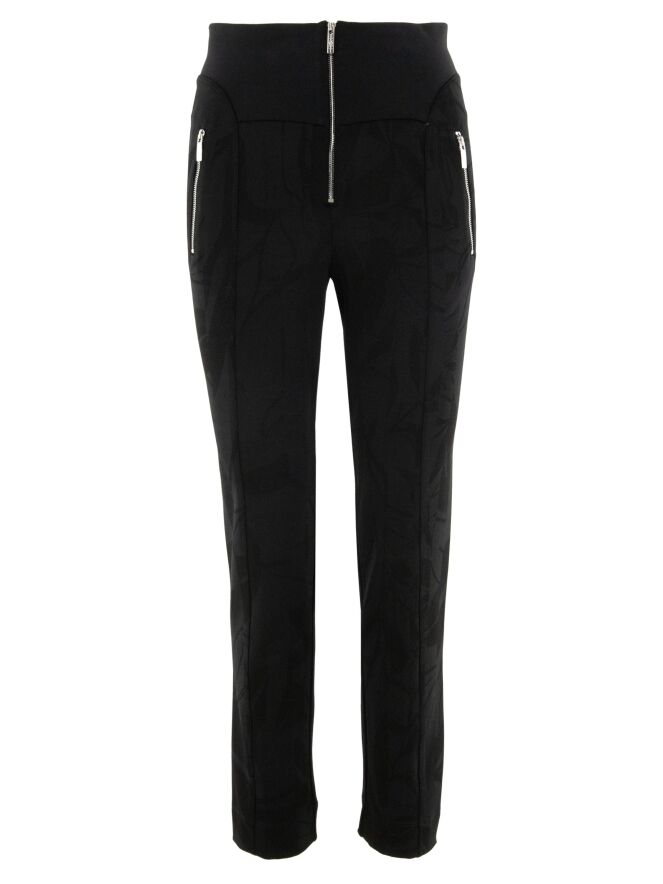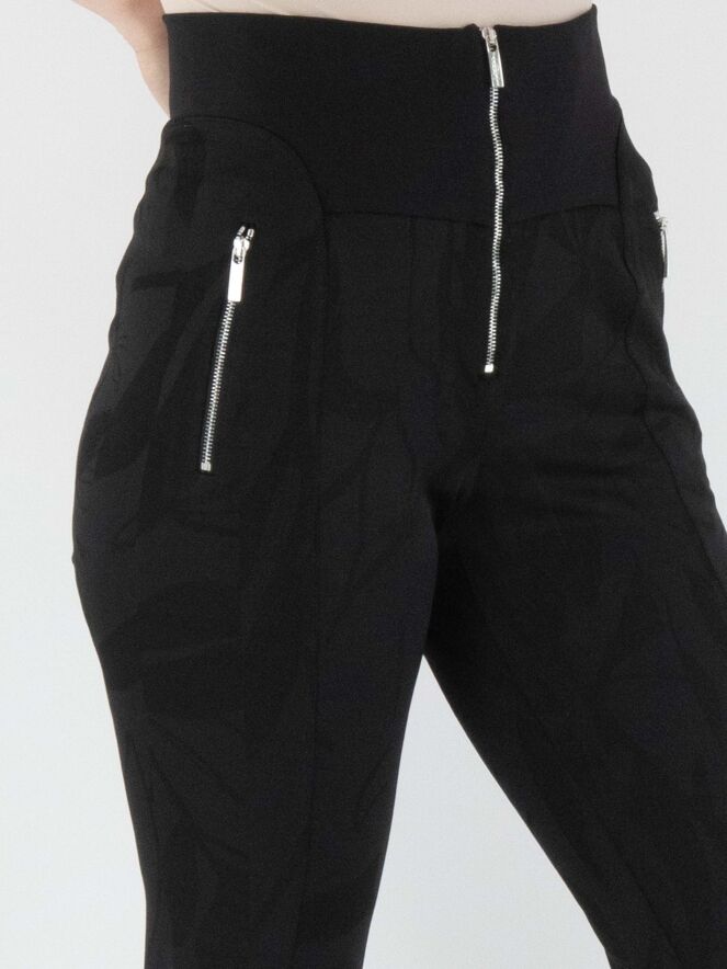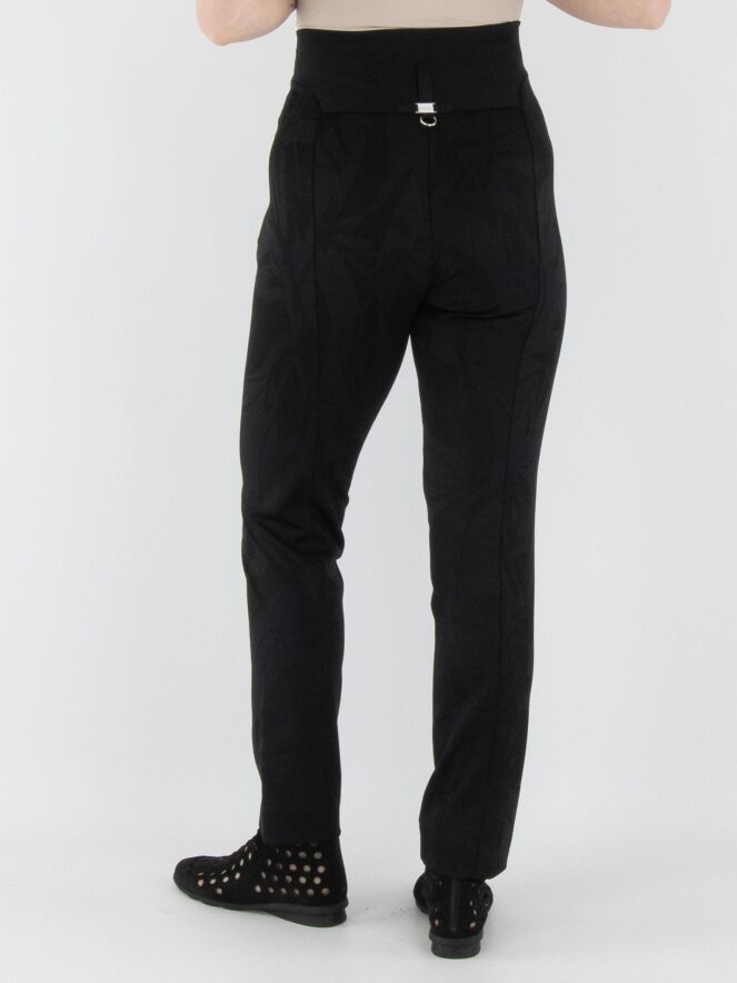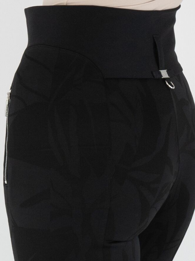 Un pantalon taille haute de High en noir, avec un imprimé feuillage graphique intégré dans le tissu. La taille est dotée d'une large bande en tricot finement côtelée avec une fermeture éclair au centre. Ce pantalon doit être lavé à la main.
