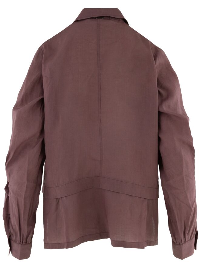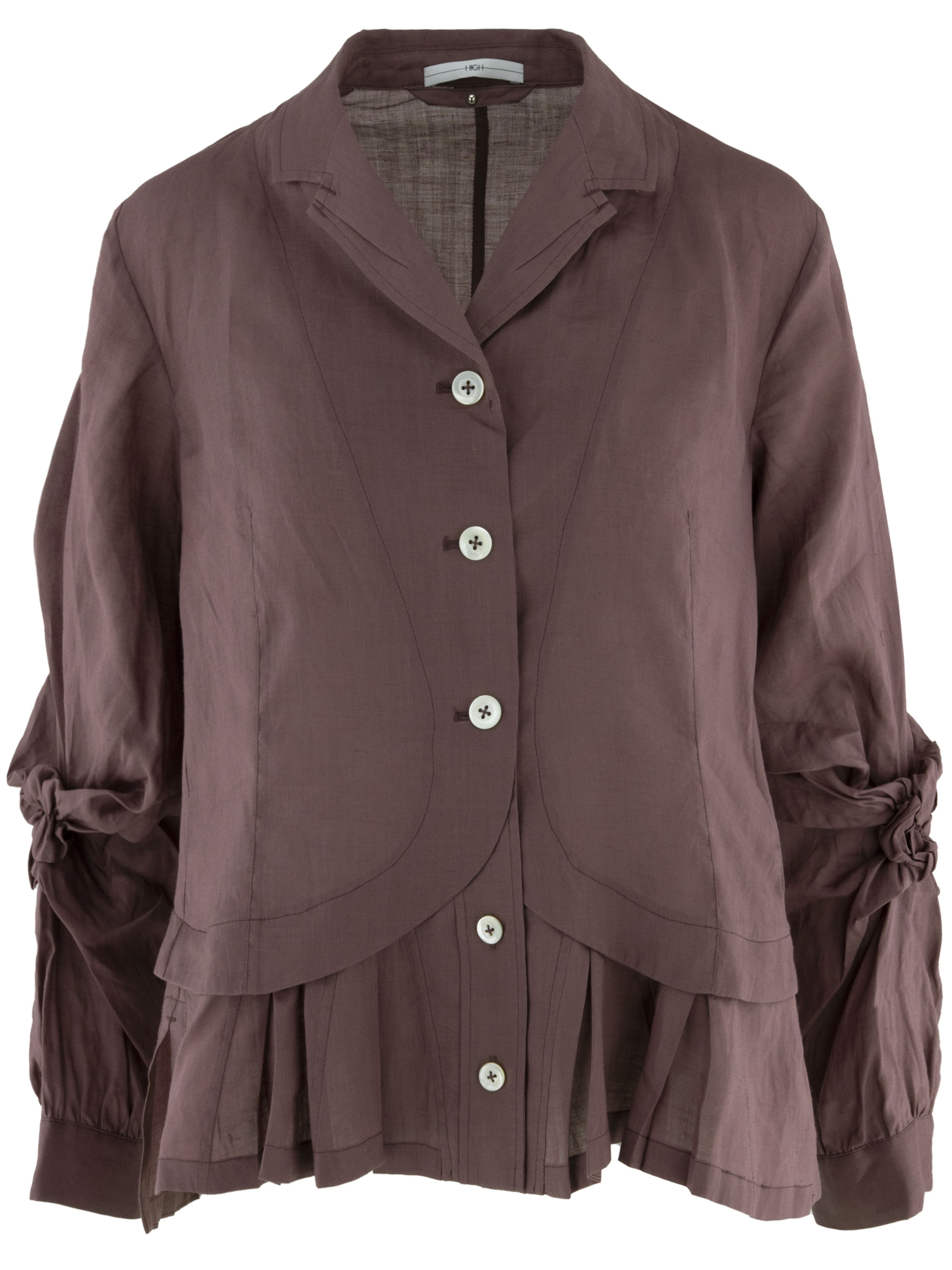 Une blouse de High en mauve. Un court détail plissé est intégré dans le col. Dans le bas, une couture arrondie se prolonge vers les côtés, sous laquelle une seconde matière est ajoutée avec plusieurs plis. À l’arrière, cette seconde matière est lisse et sans plis. Les manches longues présentent, au niveau du coude, une couture plissée formant une fleur. Cette blouse peut être lavée à la main.