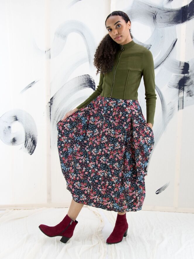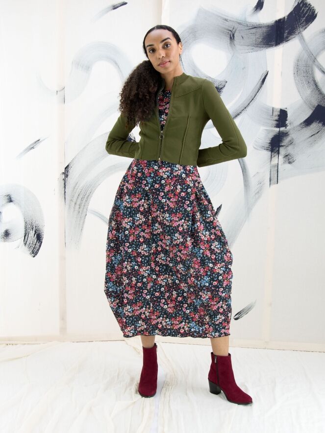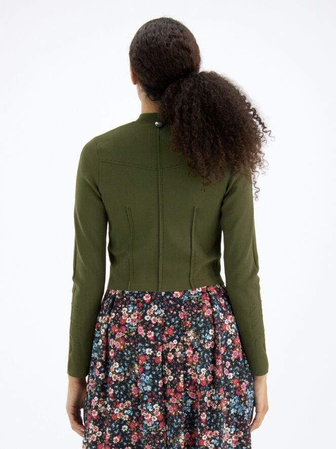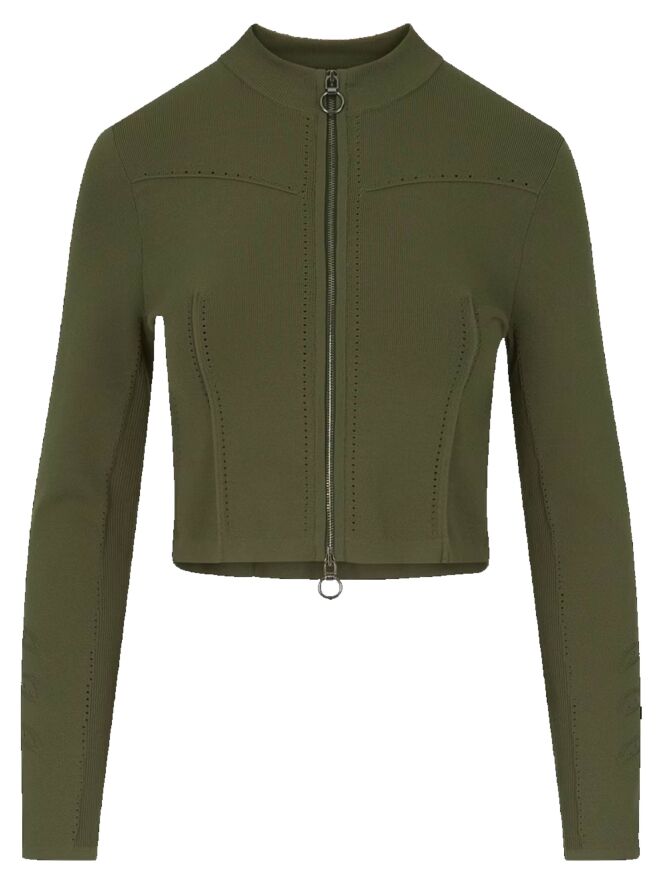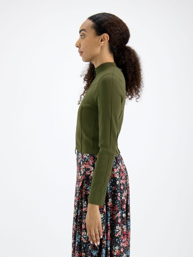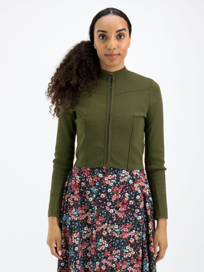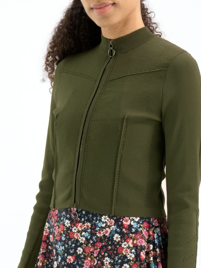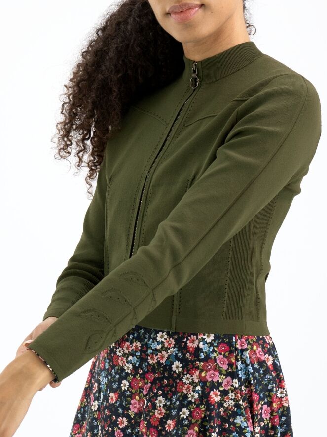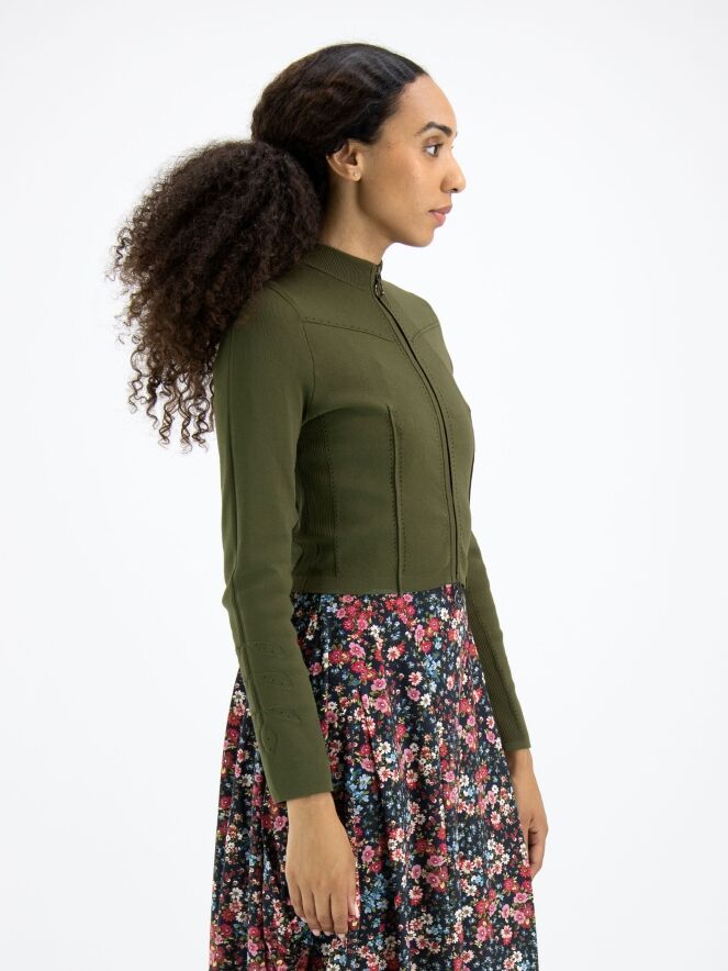 Un gilet court de High en vert olive. Le gilet présente plusieurs coutures décoratives inversées le long desquelles se trouvent des lignes ajourées. Le bord du col rond est doté d'un bord côtelé finement tricoté. La partie inférieure des manches longues est en tissu élastique finement côtelé. Aux extrémités des manches, il y a un motif ajouré en forme de feuilles. Le gilet se ferme par une fermeture éclair et peut être lavé à la main.