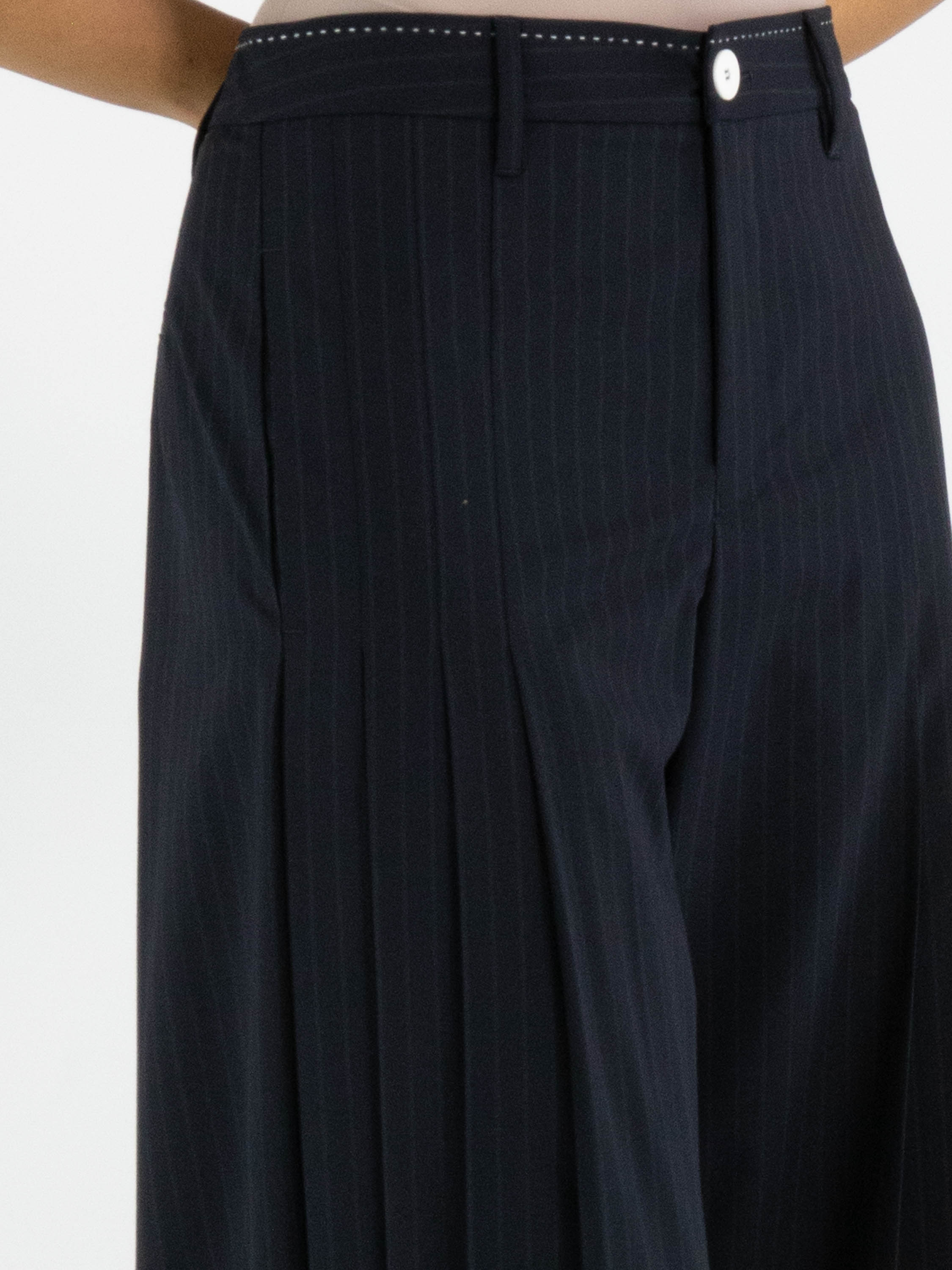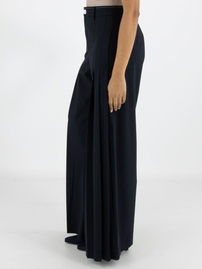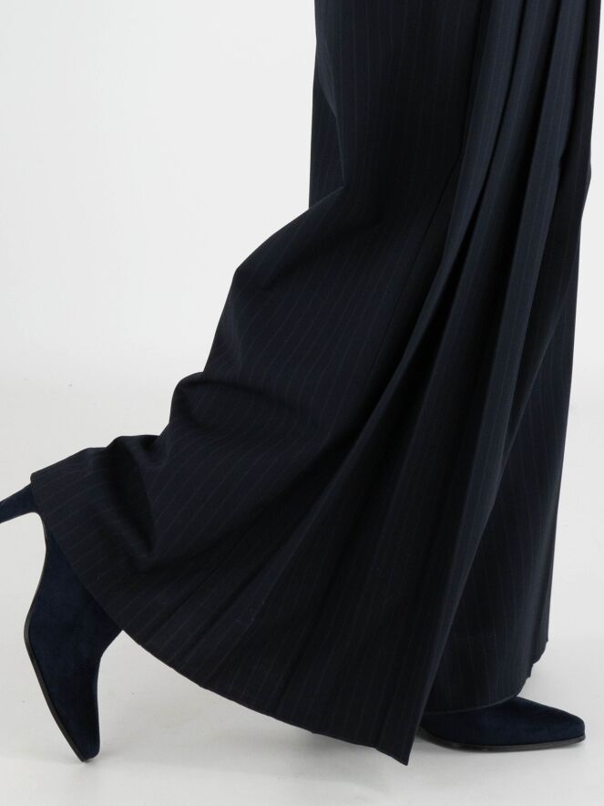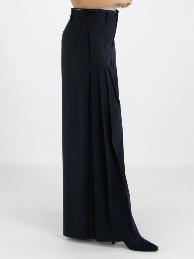 Un pantalon ample de High en tissu à fines rayures dans une teinte bleu marine. À l’avant, au niveau des hanches, plusieurs plis de chaque côté descendent vers les jambes, créant un effet plissé. Ce pantalon ne doit pas être lavé.