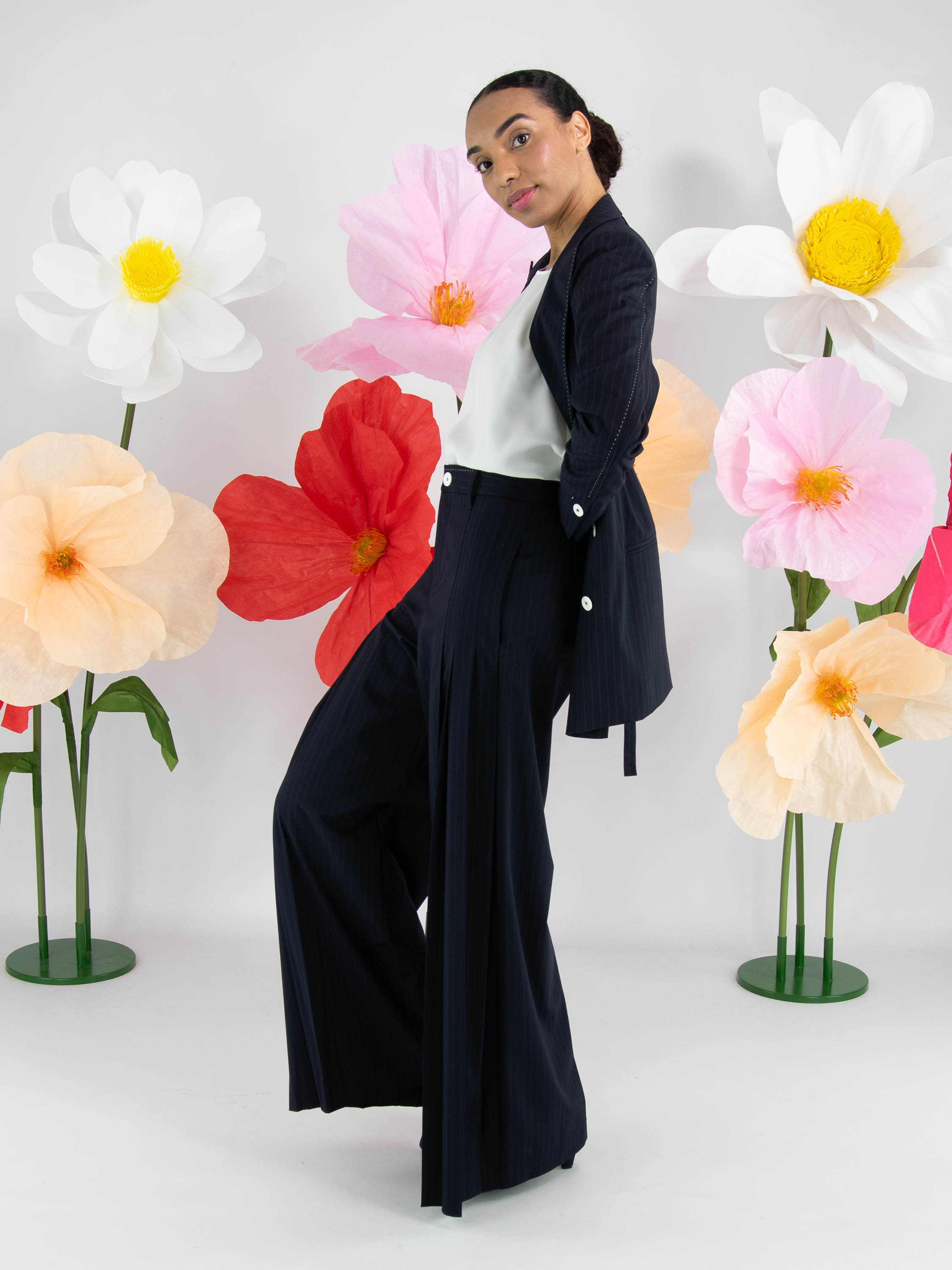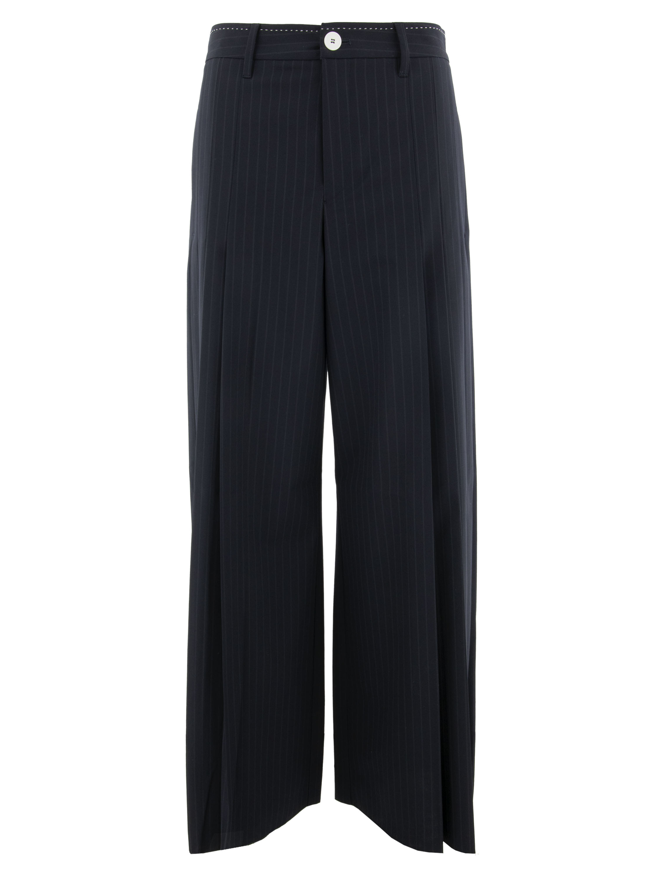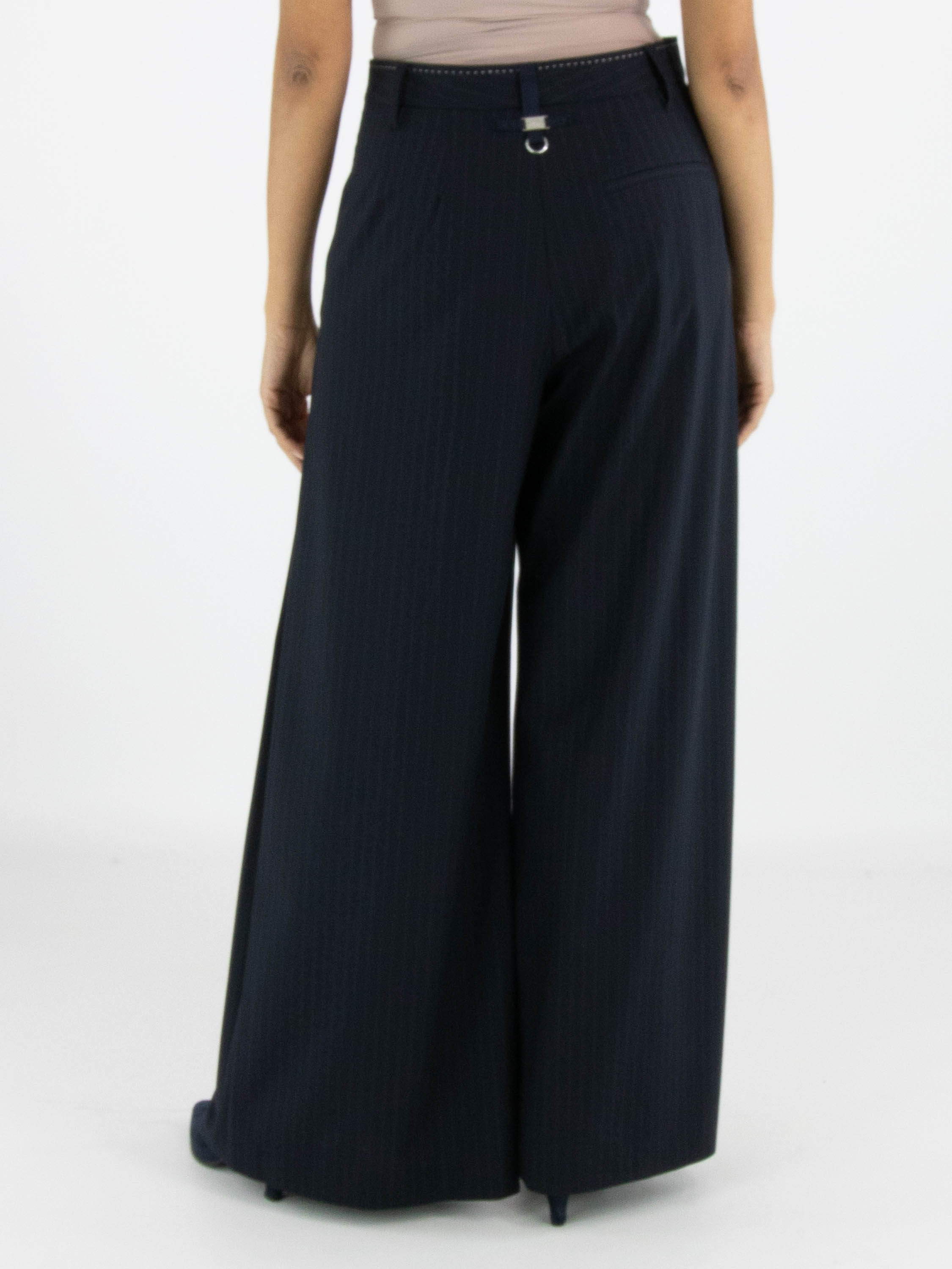 Un pantalon ample de High en tissu à fines rayures dans une teinte bleu marine. À l’avant, au niveau des hanches, plusieurs plis de chaque côté descendent vers les jambes, créant un effet plissé. Ce pantalon ne doit pas être lavé.