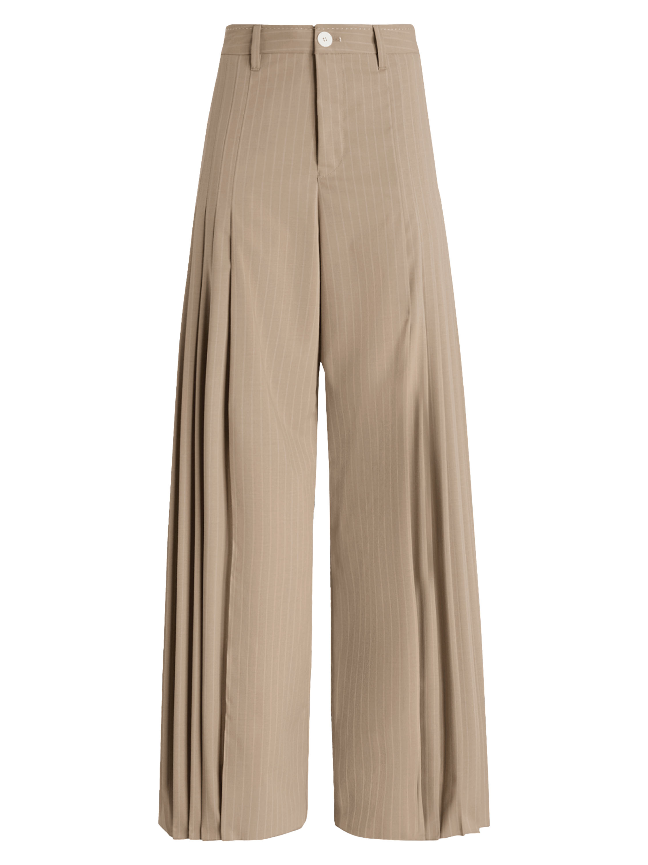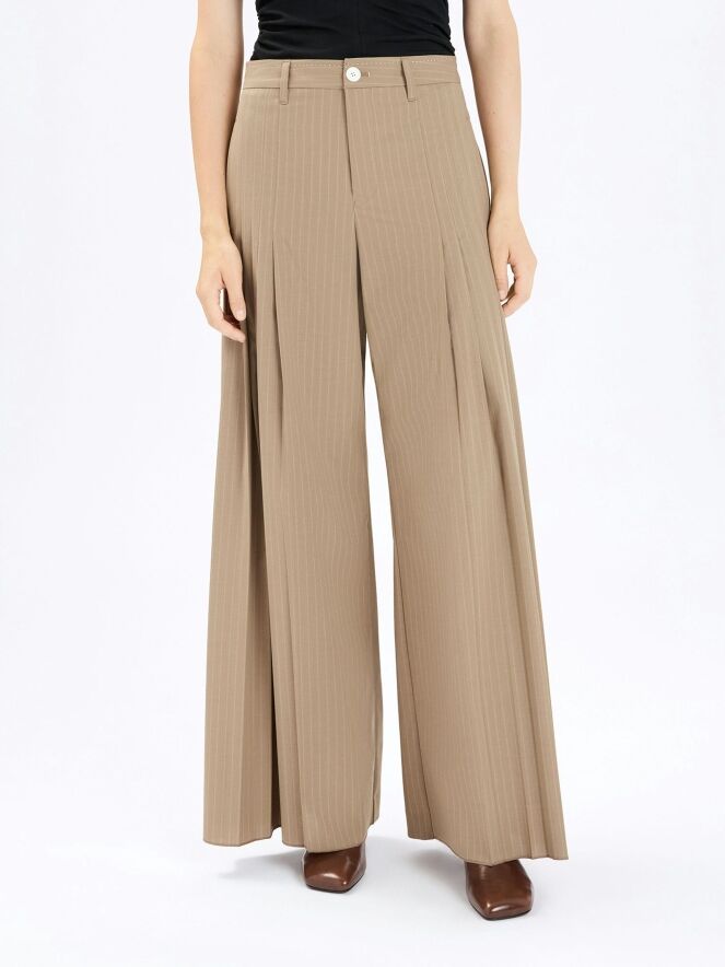 Pantalon large de High dans une élégante structure à fines rayures craie de couleur camel. Depuis l’avant au niveau des hanches, plusieurs plis descendent de chaque côté et se prolongent vers les jambes en un subtil effet plissé. Il en résulte une silhouette fluide, féminine et contemporaine. Ce pantalon de créateur exclusif ne doit pas être lavé.