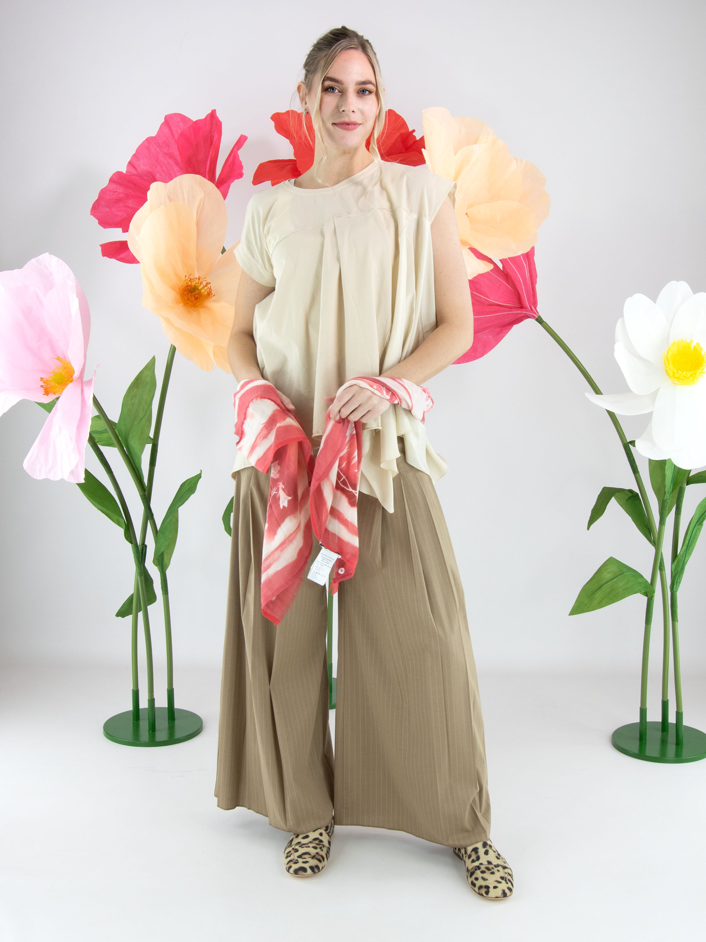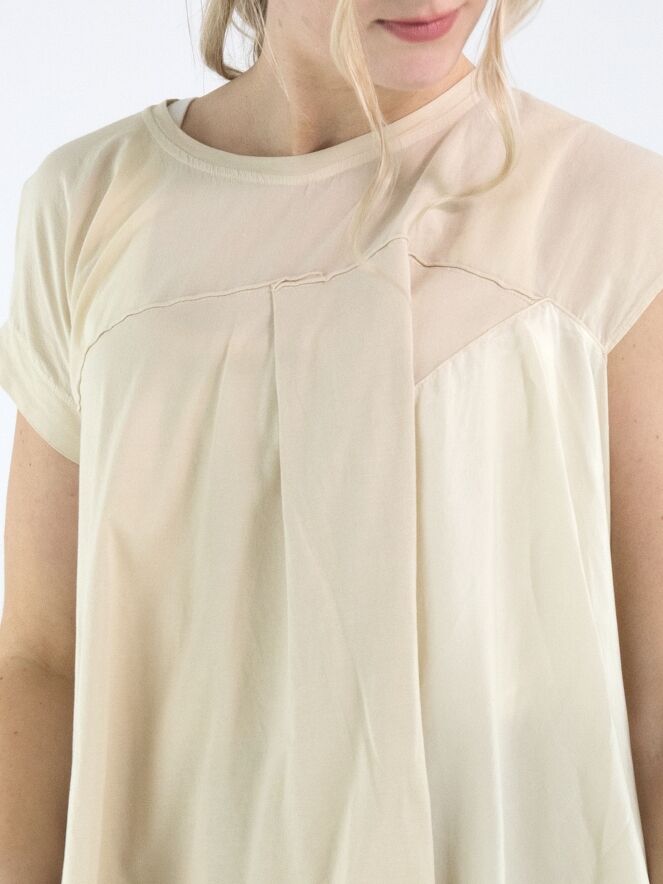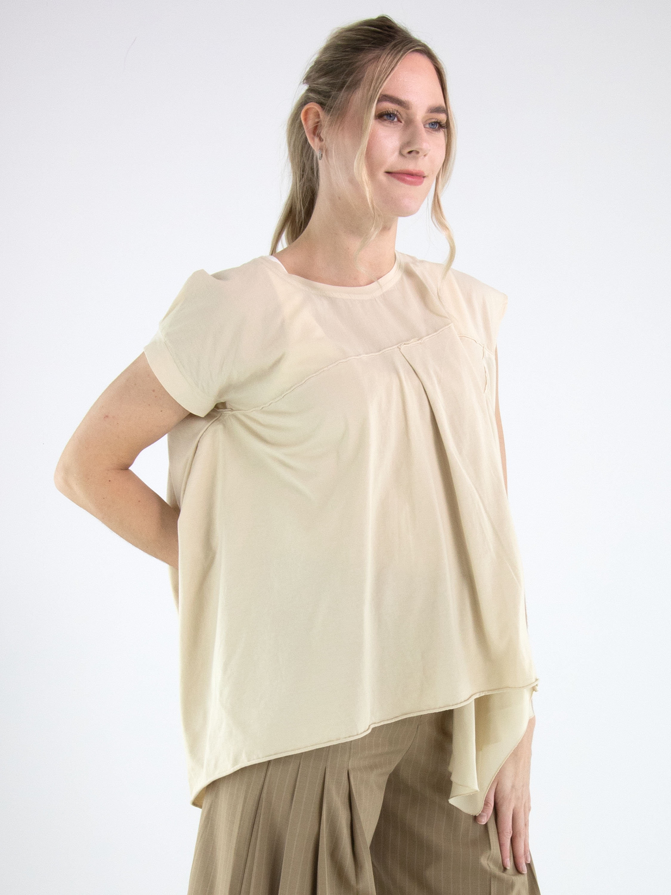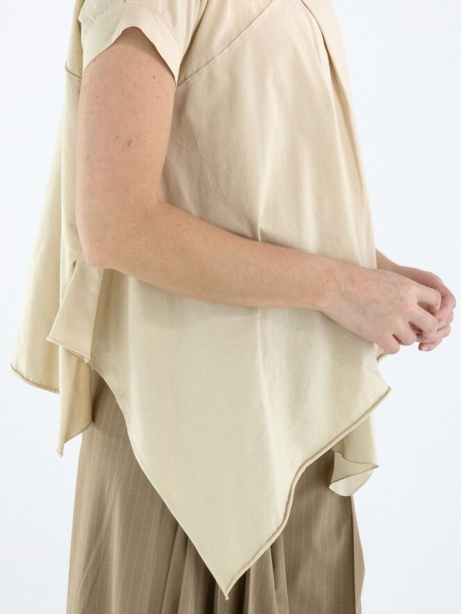 Top de High dans une élégante teinte sable. Une couture discrète au-dessus de la poitrine apporte de la structure au modèle. Les panneaux gauche à l’avant et à l’arrière sont réalisés en satin mat, créant un contraste raffiné de matières. Conçu en coupe A, les côtés tombent plus longs que la partie centrale, offrant une silhouette fluide et contemporaine. Ce top de créateur exclusif doit être lavé à la main.