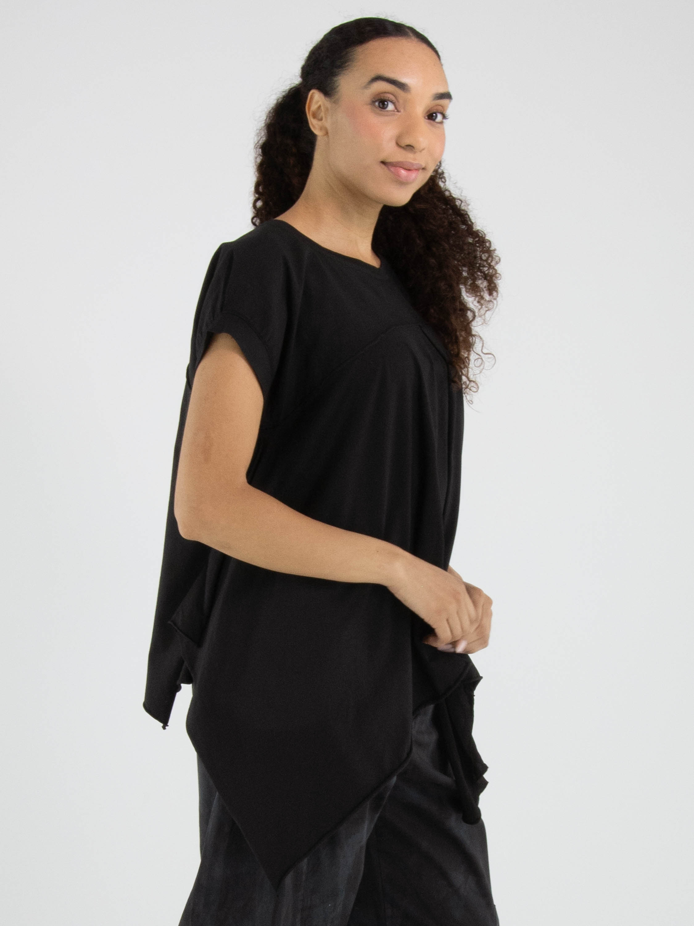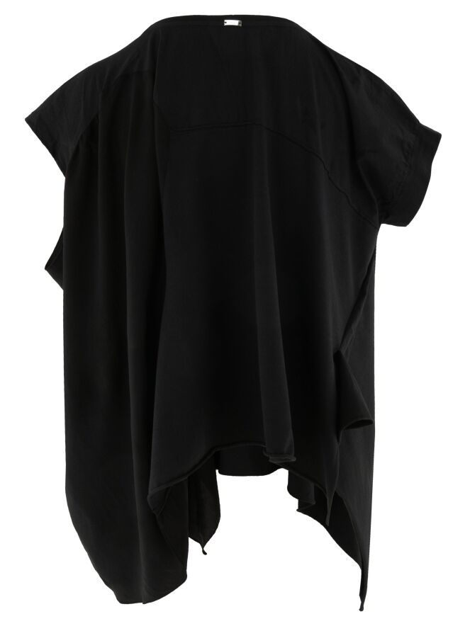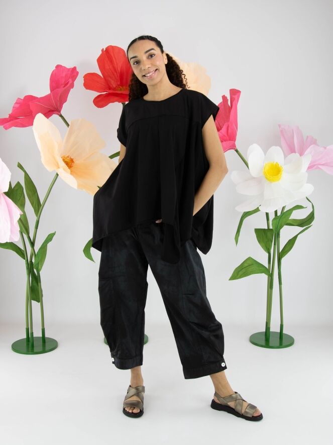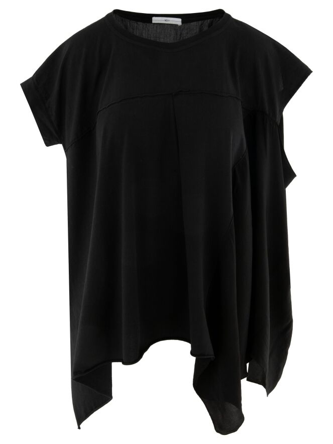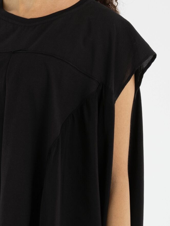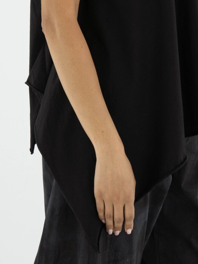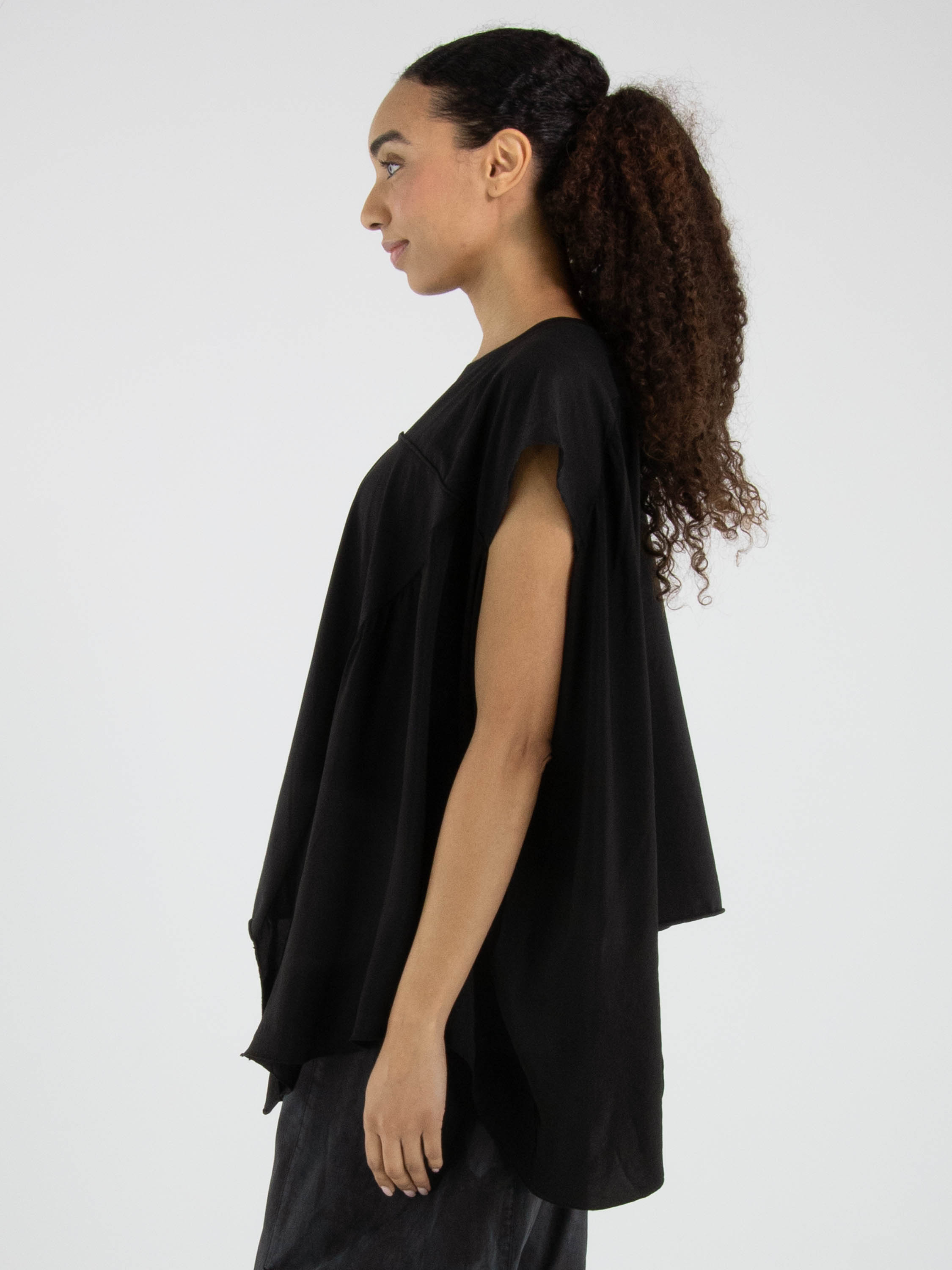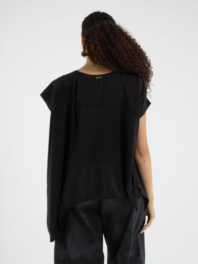 Top de High en noir. Une couture subtile au-dessus de la poitrine structure délicatement le modèle. Les parties gauche à l’avant et à l’arrière sont réalisées en satin mat, créant un contraste élégant de textures. Conçu en ligne A, avec des côtés plus longs que le centre, il offre une silhouette fluide et contemporaine. Ce top de créateur exclusif doit être lavé à la main.