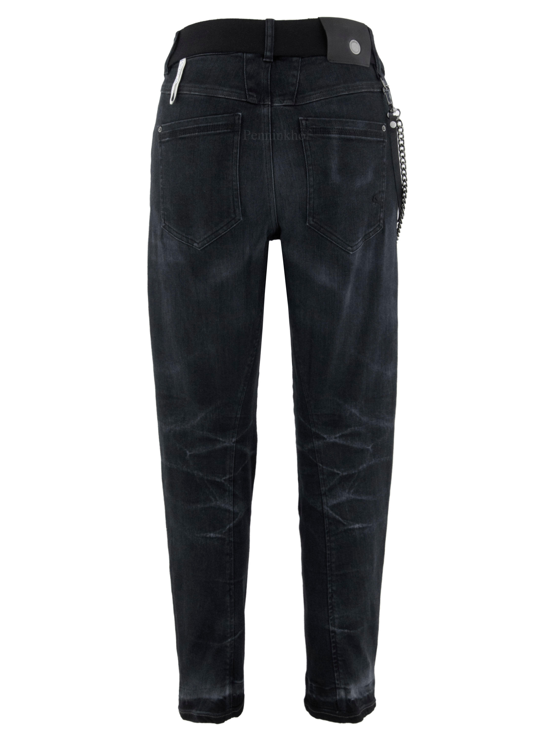Jean délavé de High en noir. À la taille se trouve une ceinture élastiquée avec une boucle carrée de couleur nickel. Une chaîne part du passant droit de la ceinture et s'étend jusqu'à l'arrière. Ce jeans peut être lavé à 30 degrés.