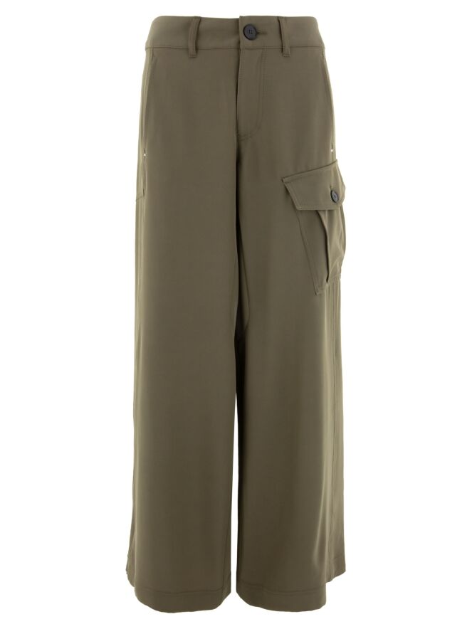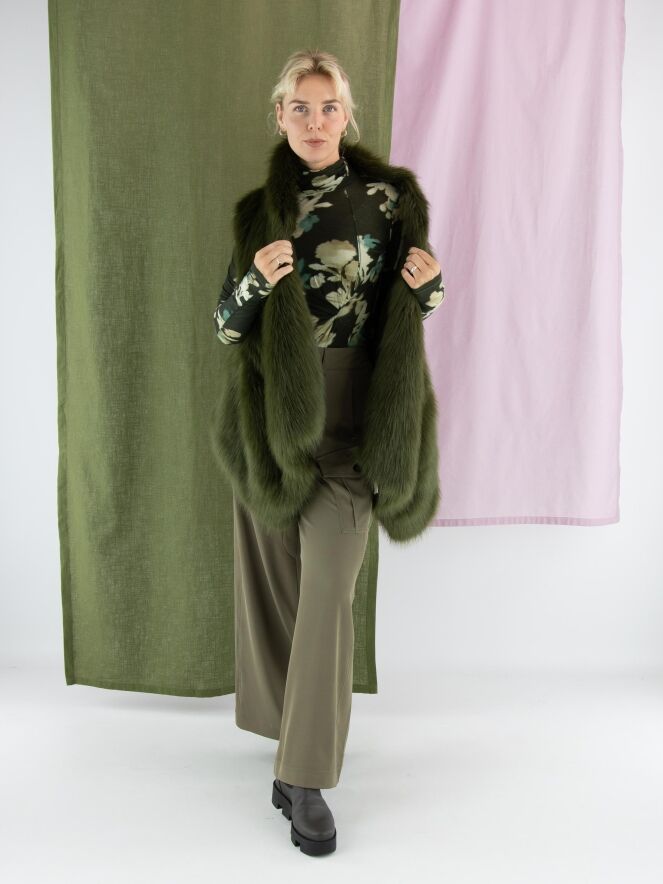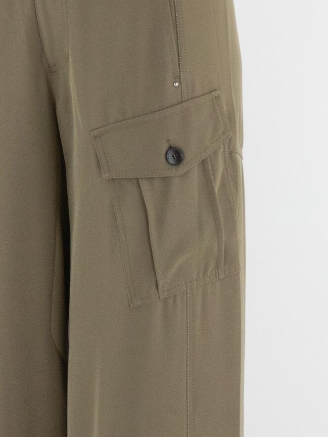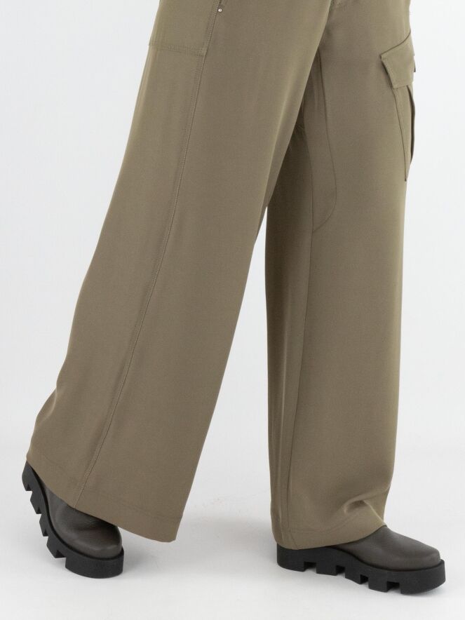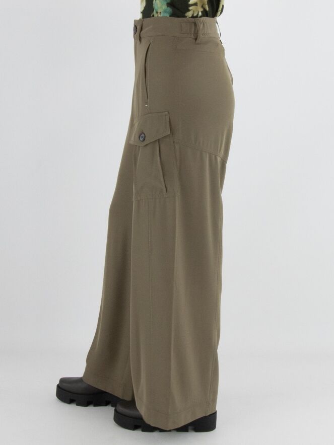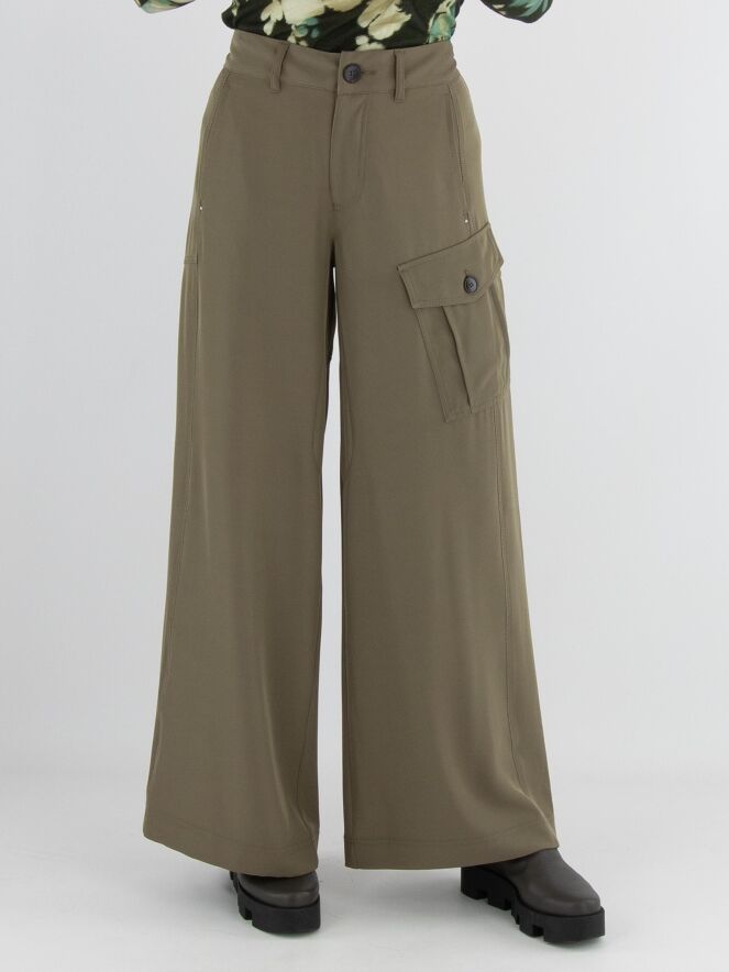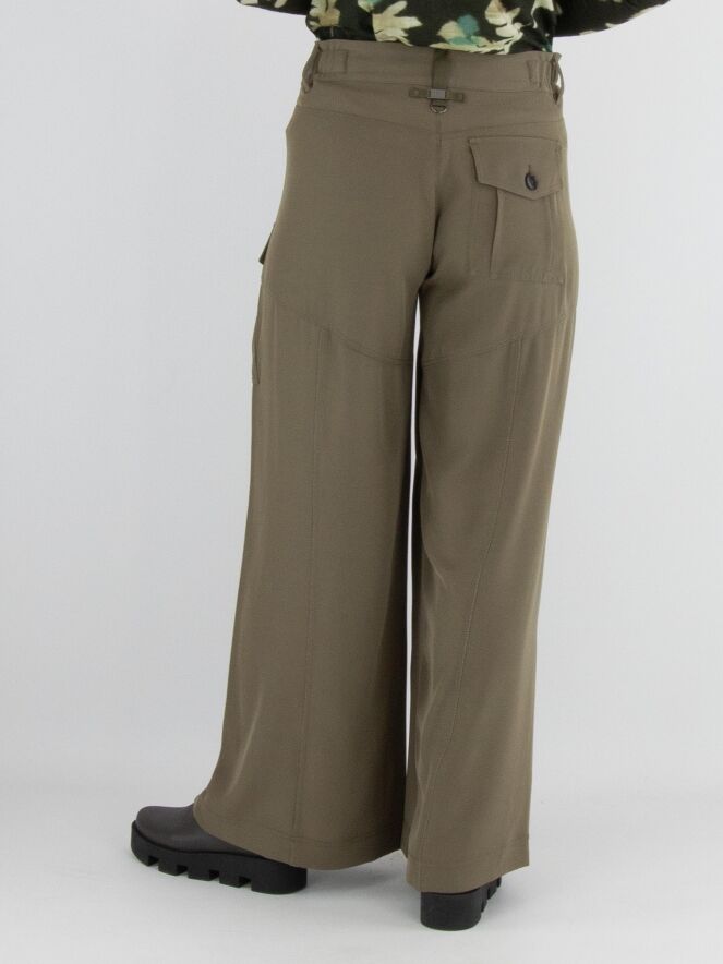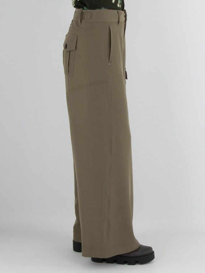 Pantalon de la marque High en vert olive. La taille est dotée de petits empiècements élastiques sur les côtés. Sous la hanche, une poche décorative est placée sur la cuisse droite. Les coutures verticales sont réalisées avec un fil blanc. Ce pantalon peut être lavé à 30 degrés.