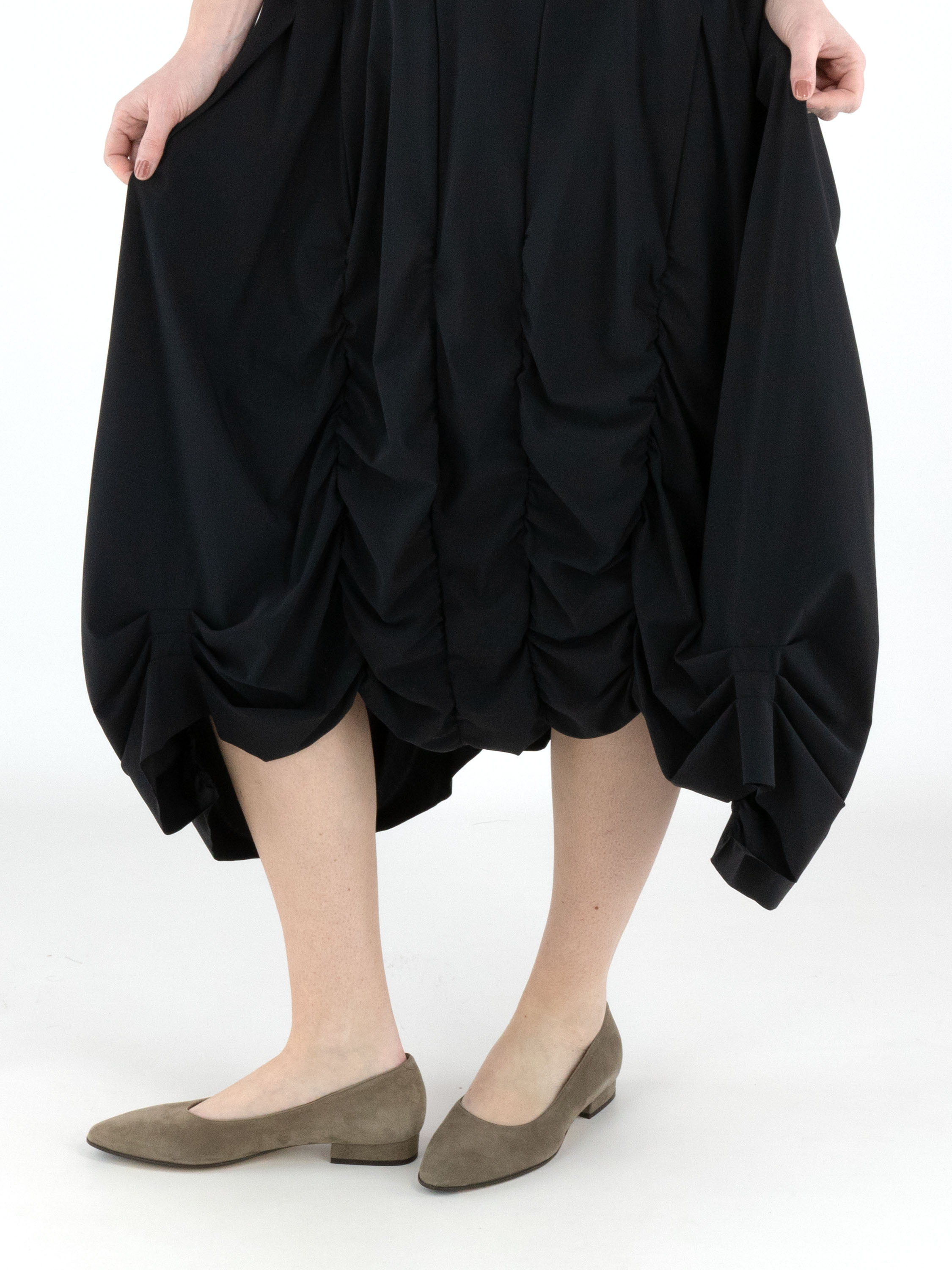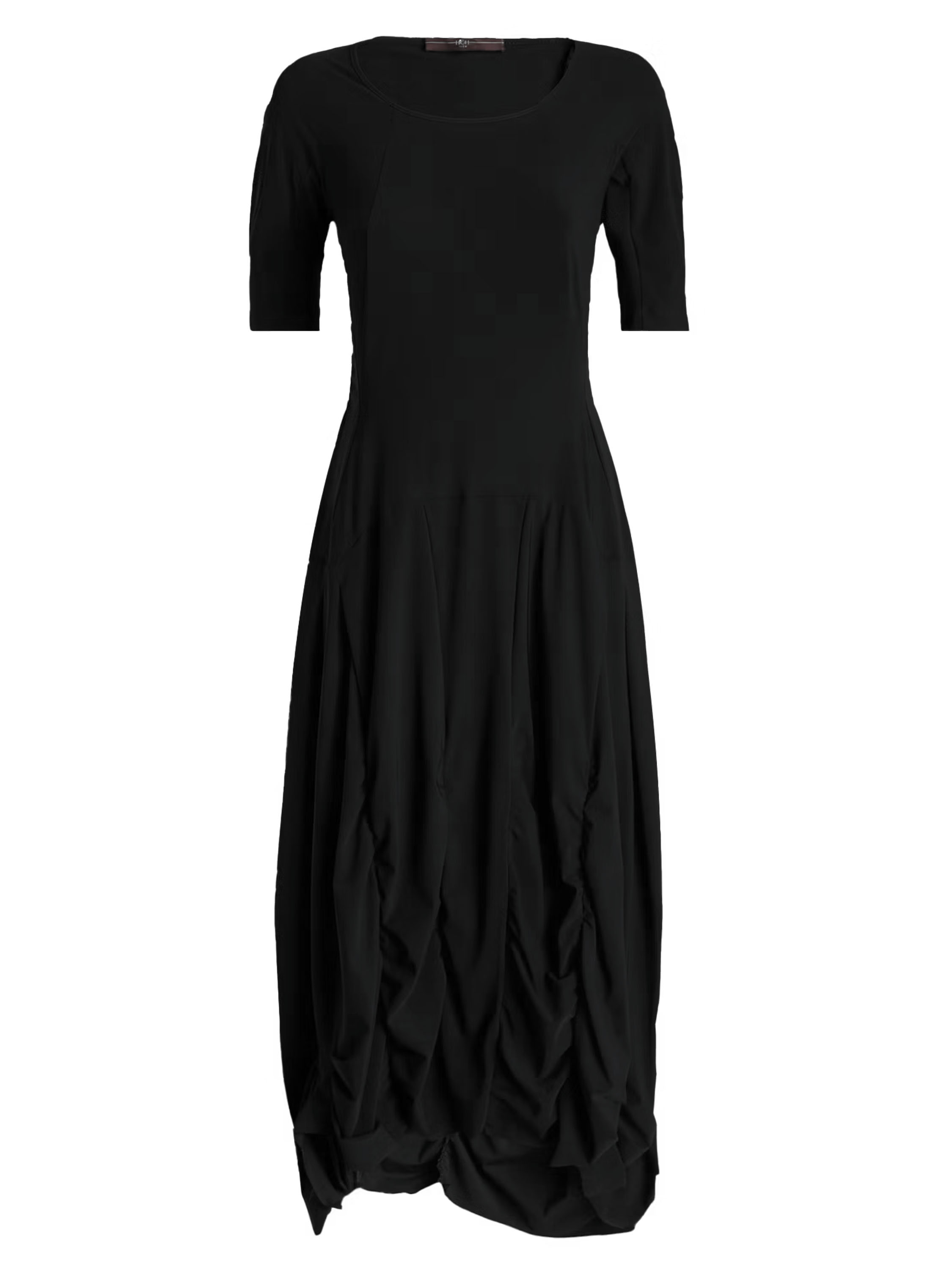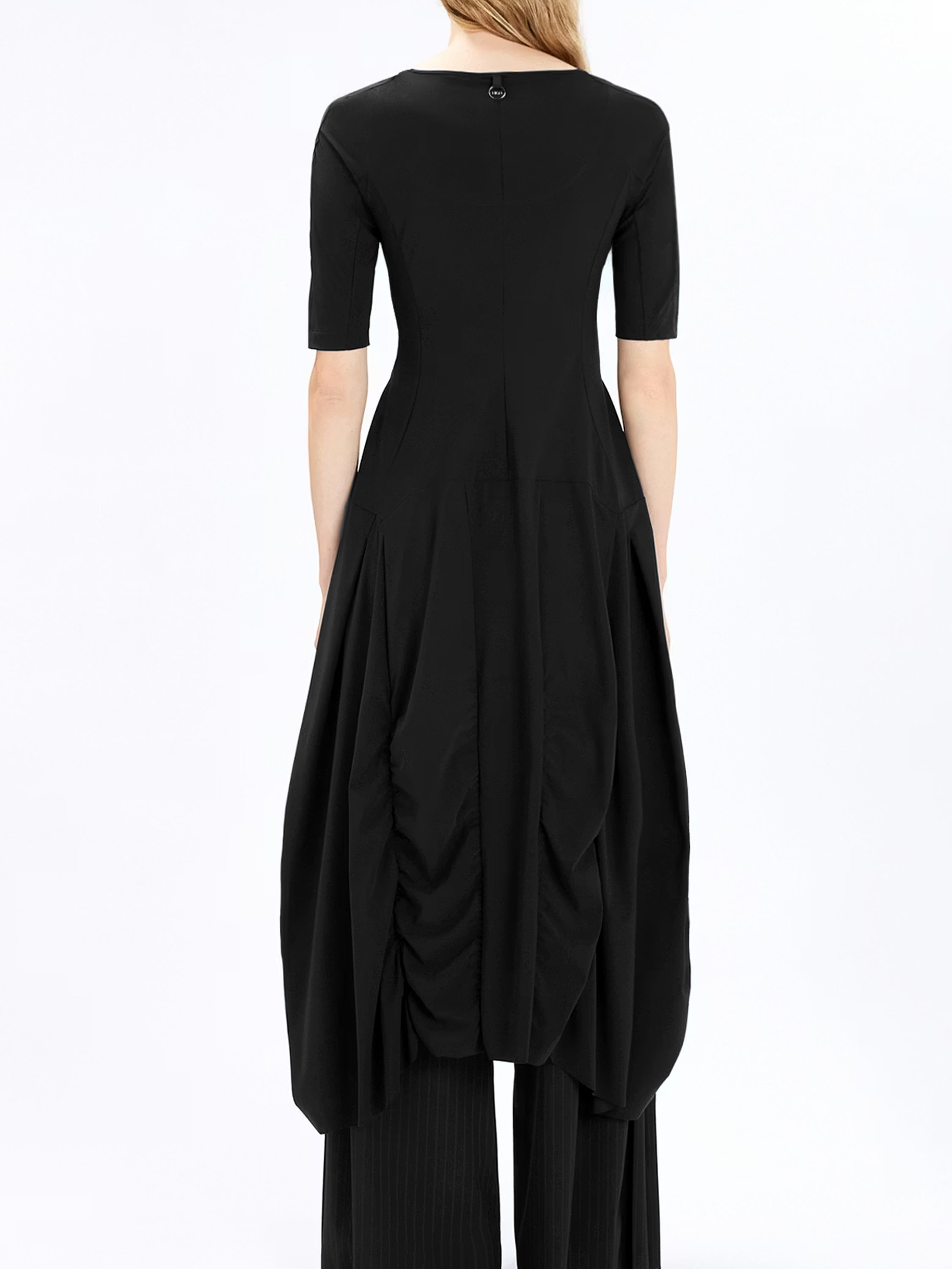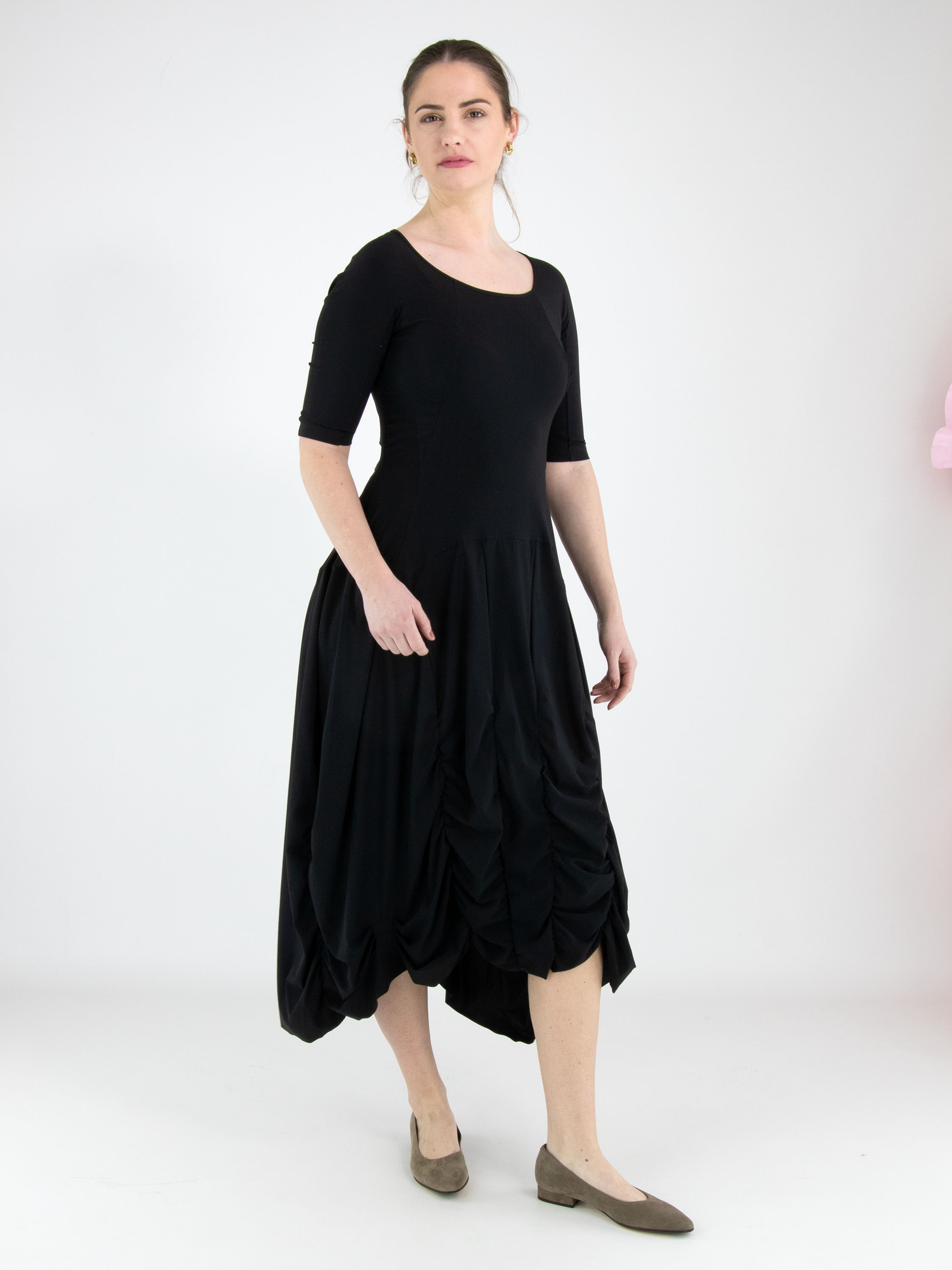 Une robe de High Tech de couleur noire. La robe possède une large encolure ronde et des manches courtes. À partir de la taille, plusieurs coutures verticales longent le tissu plissé, créant un effet smocké. Cette robe peut être lavée à 30 degrés.