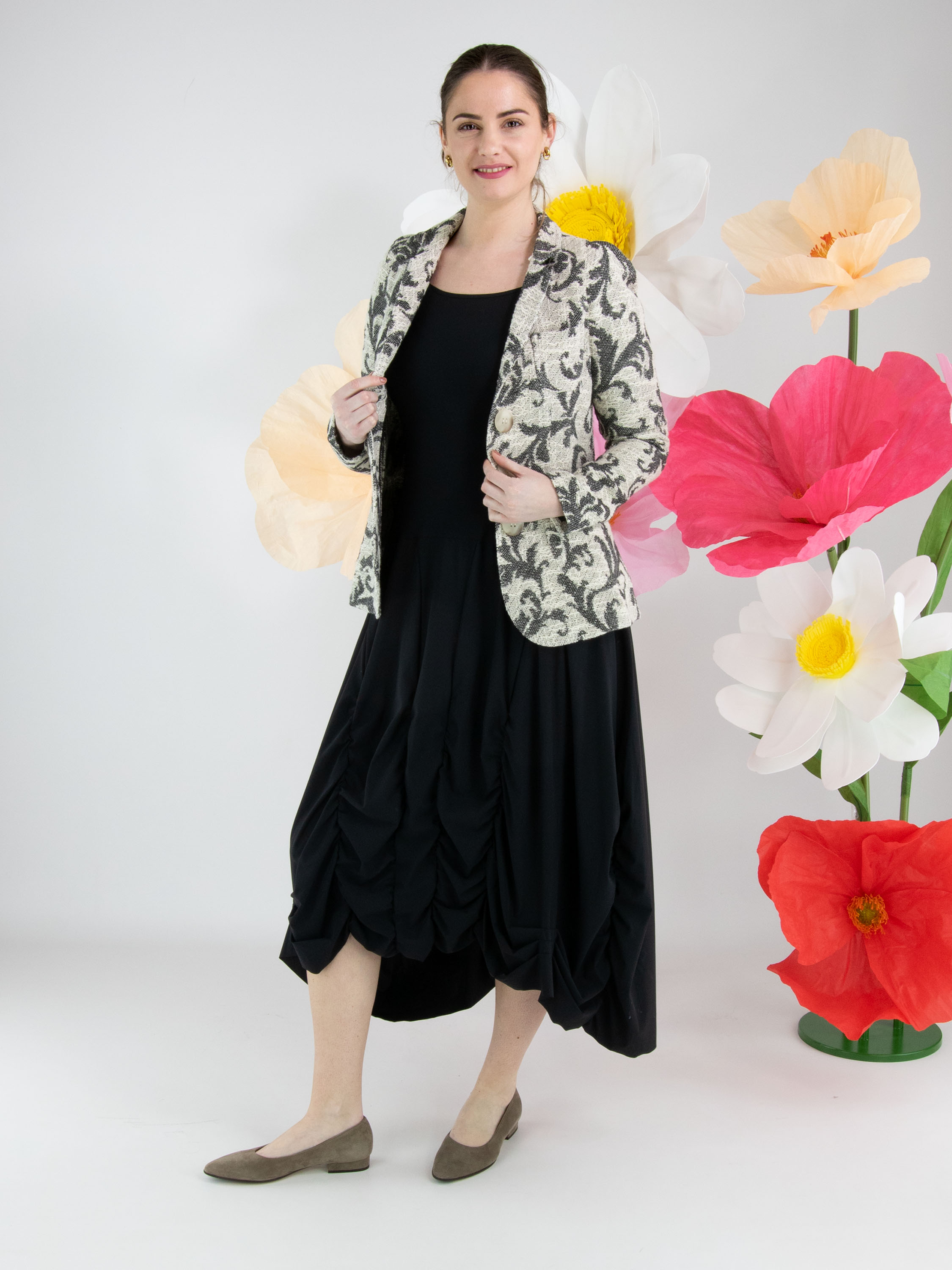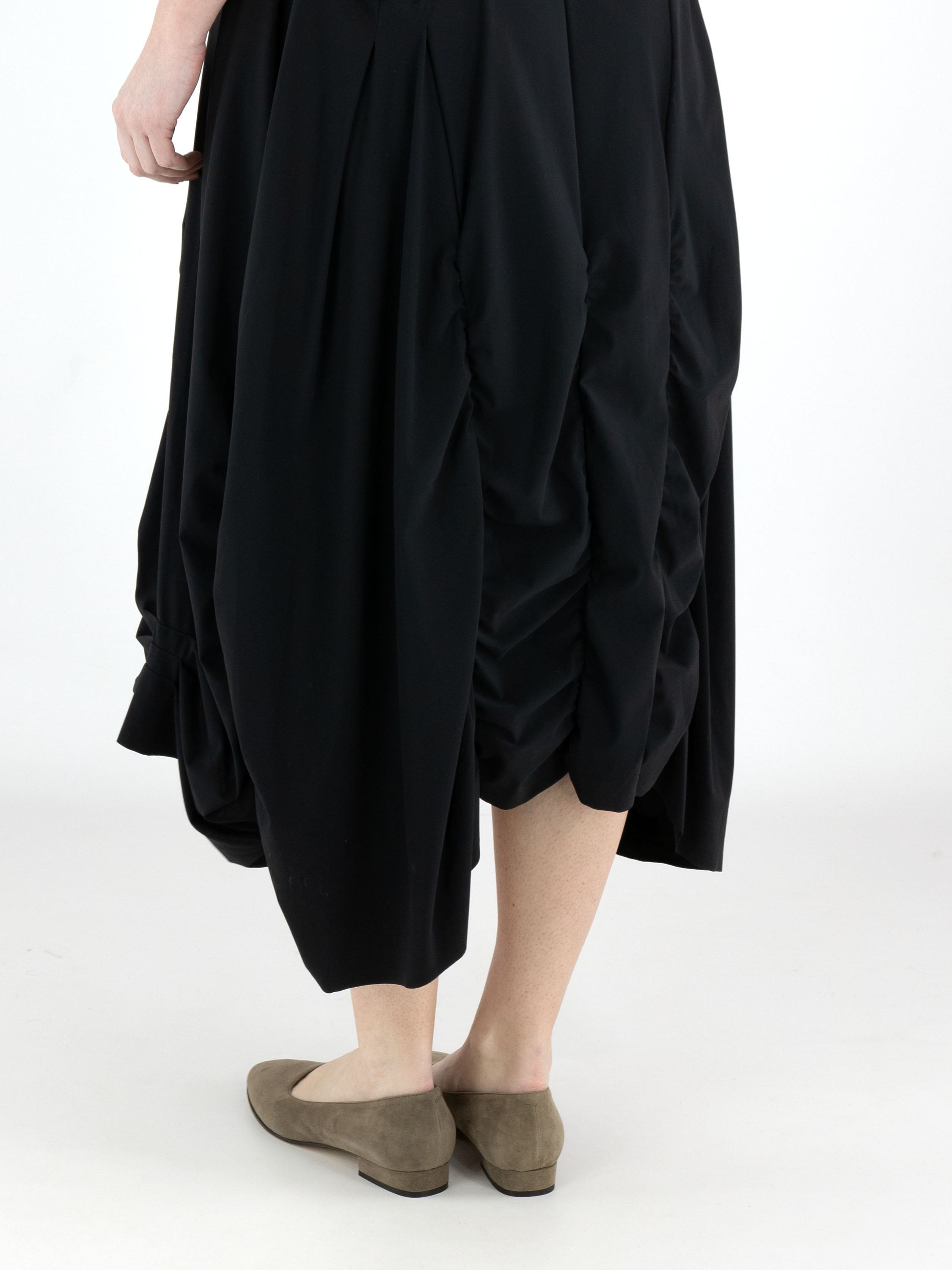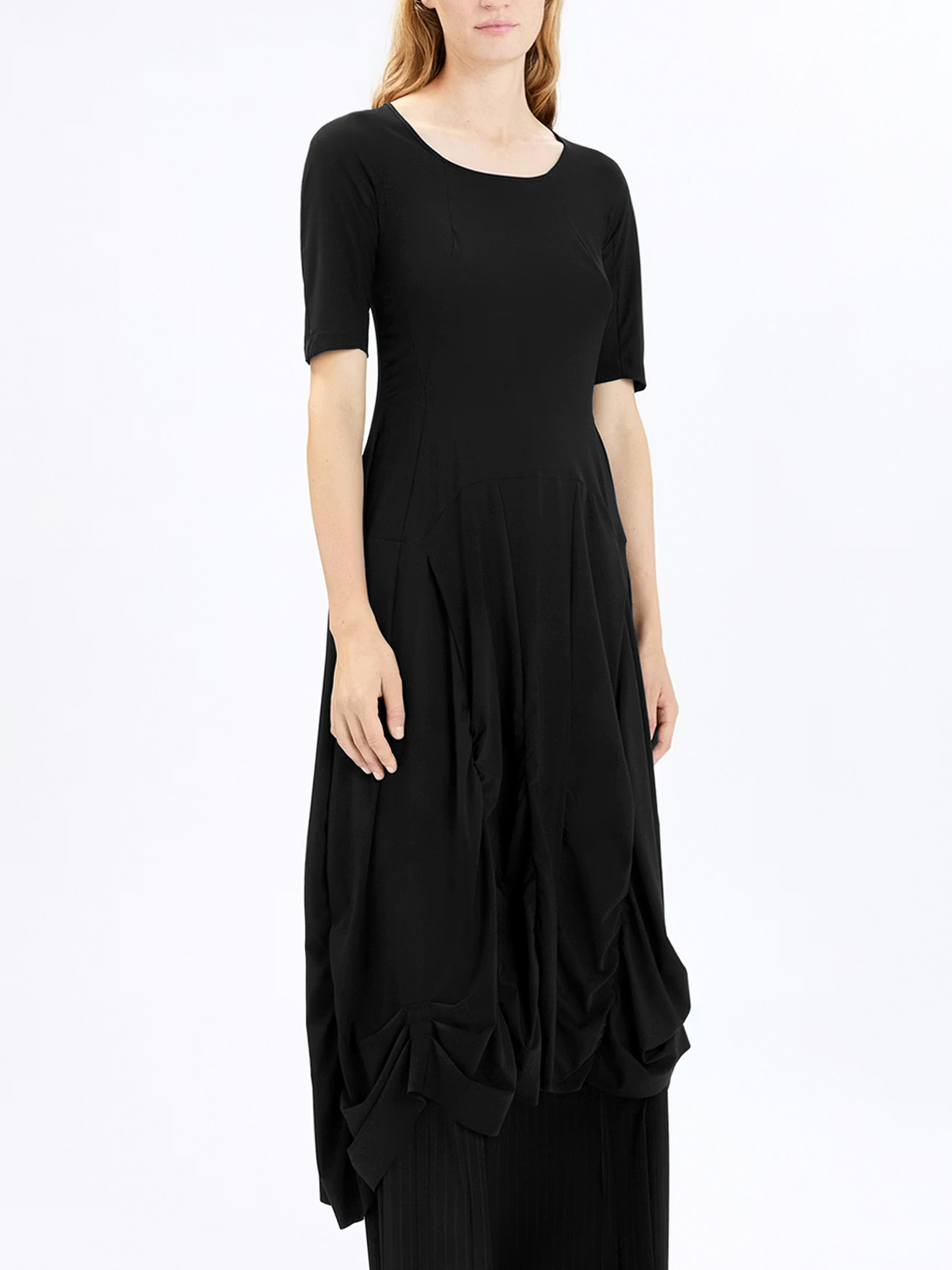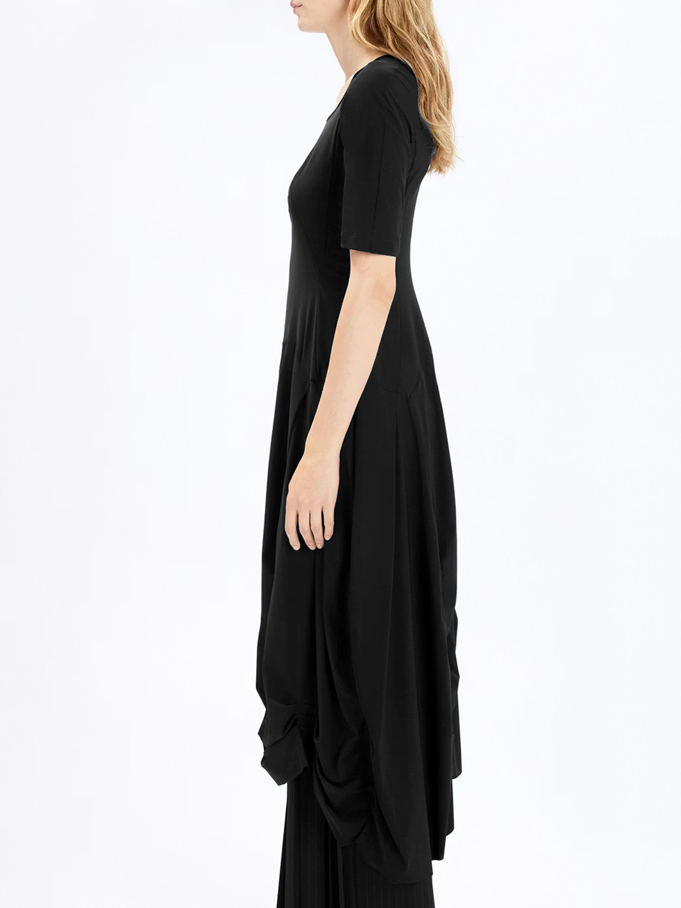 Une robe de High Tech de couleur noire. La robe possède une large encolure ronde et des manches courtes. À partir de la taille, plusieurs coutures verticales longent le tissu plissé, créant un effet smocké. Cette robe peut être lavée à 30 degrés.
