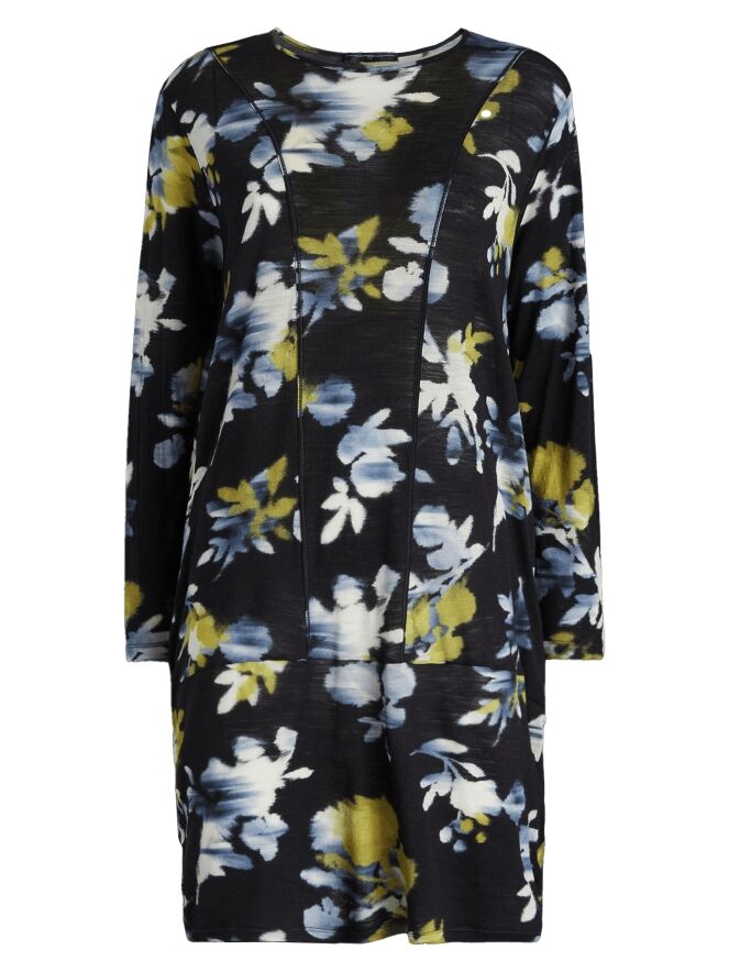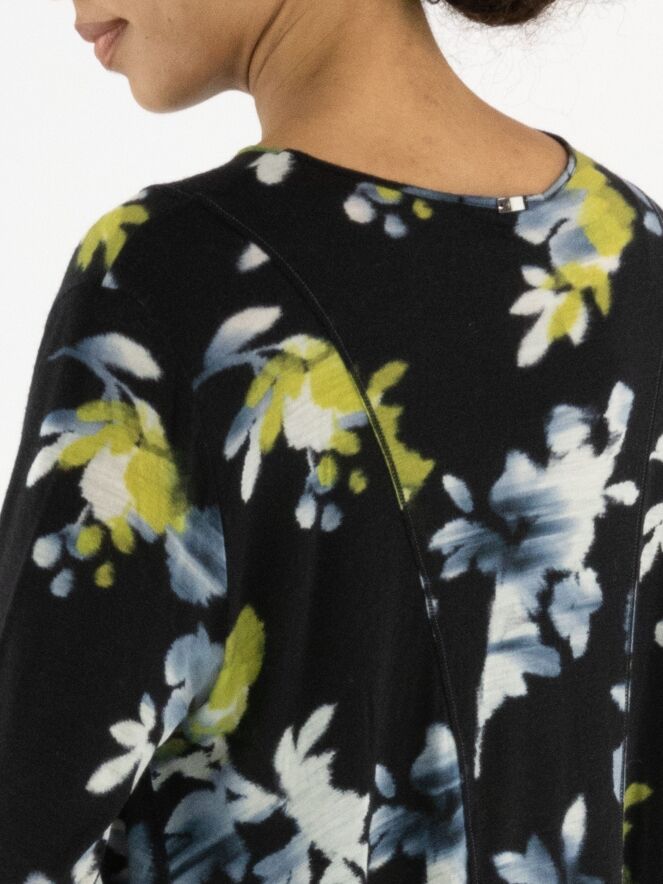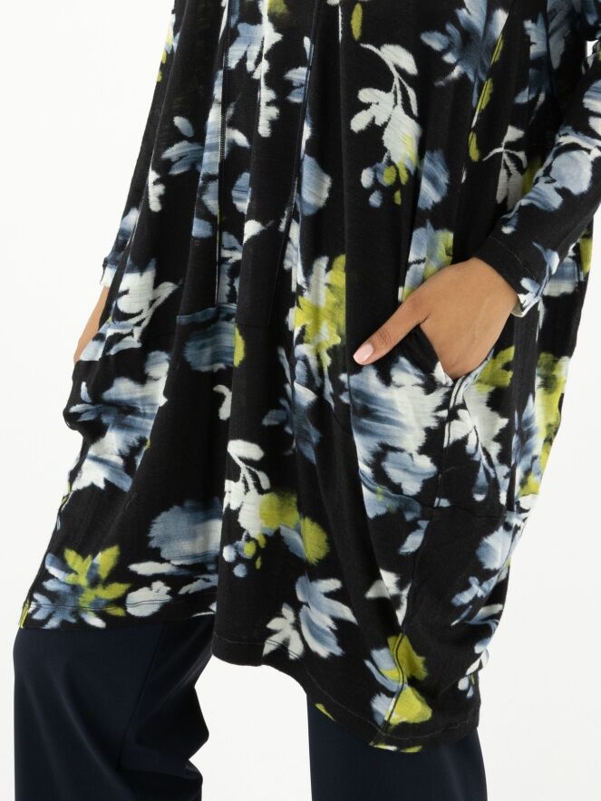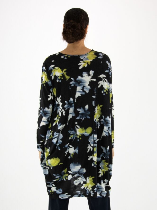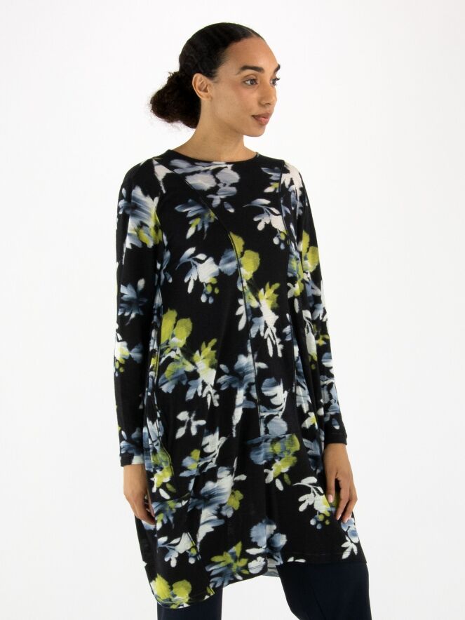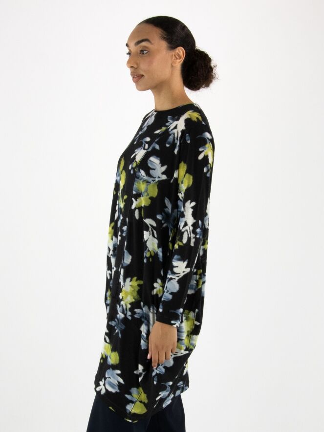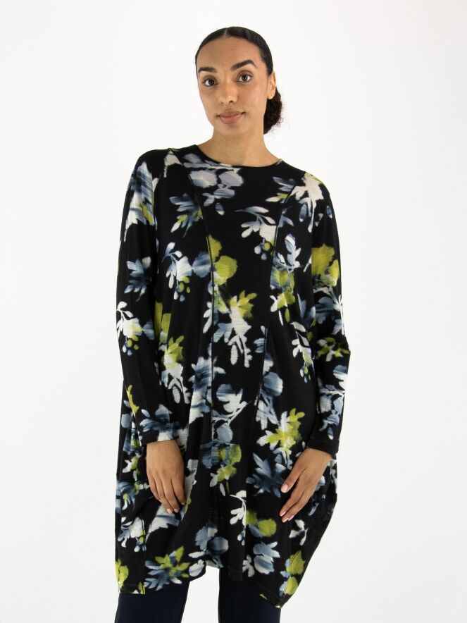 Une tunique de la marque High avec un imprimé floral graphique en jaune, bleu et blanc cassé sur un fond bleu marine. La tunique a un col rond, des manches longues et se resserre à partir des hanches. Cette tunique doit être lavée à la main.