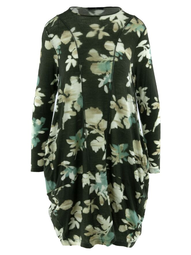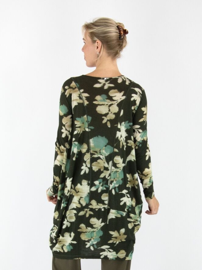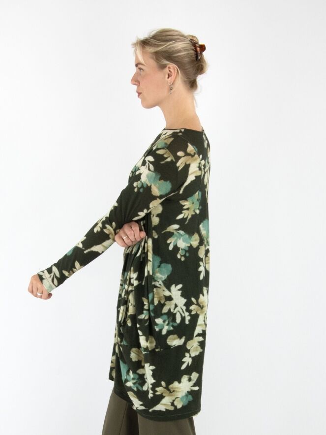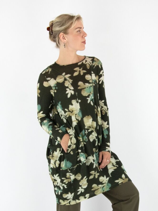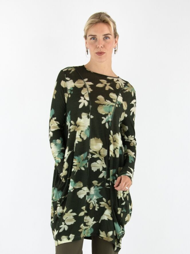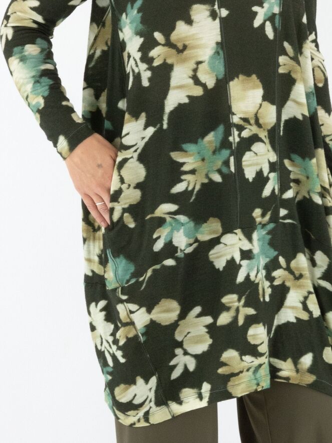 Une tunique de la marque High avec un imprimé floral graphique dans des tons de beige, turquoise et blanc cassé sur un fond vert olive. La tunique présente un col rond, des manches longues et se resserre légèrement à partir des hanches. Cette tunique doit être lavée à la main.