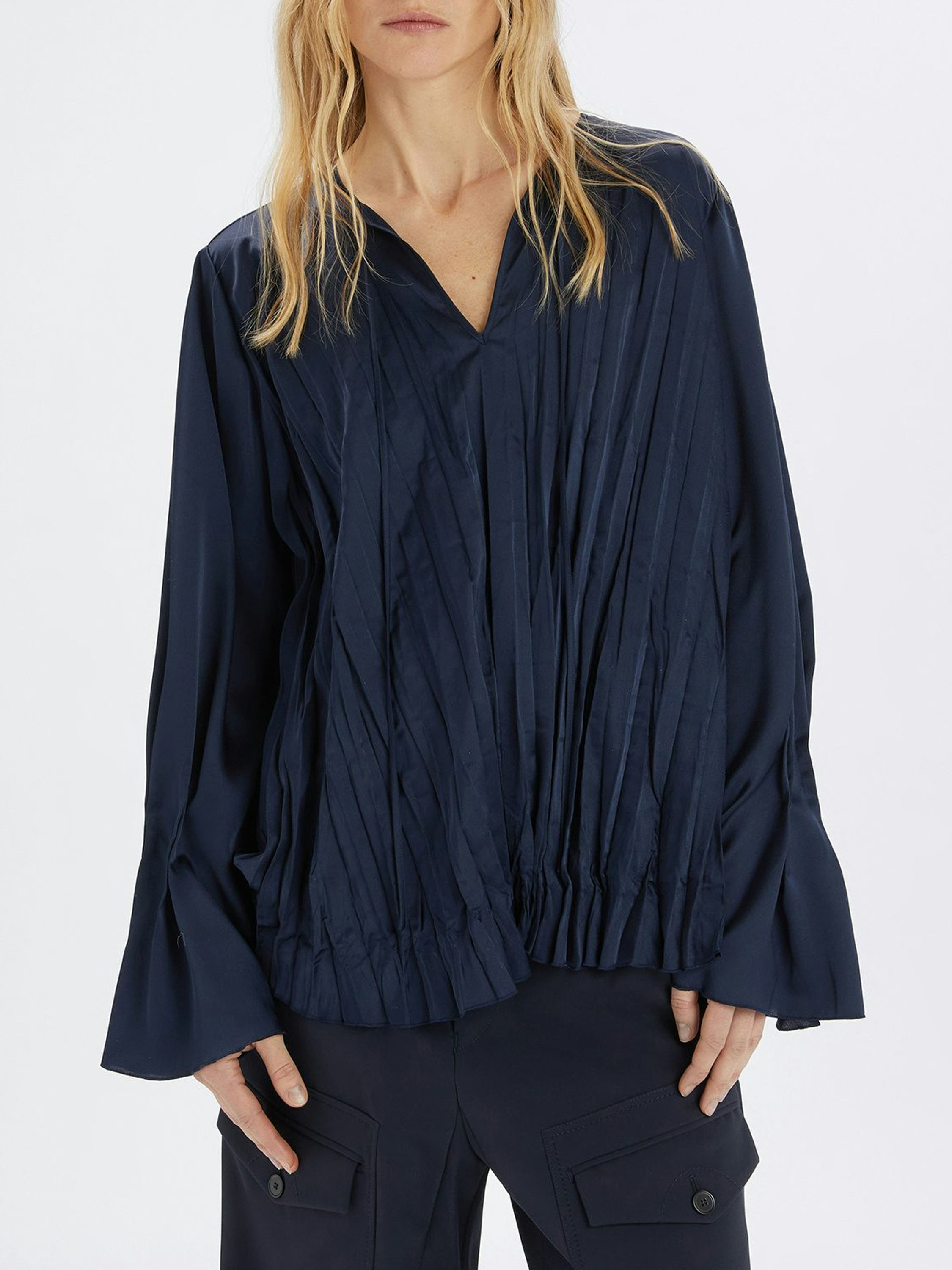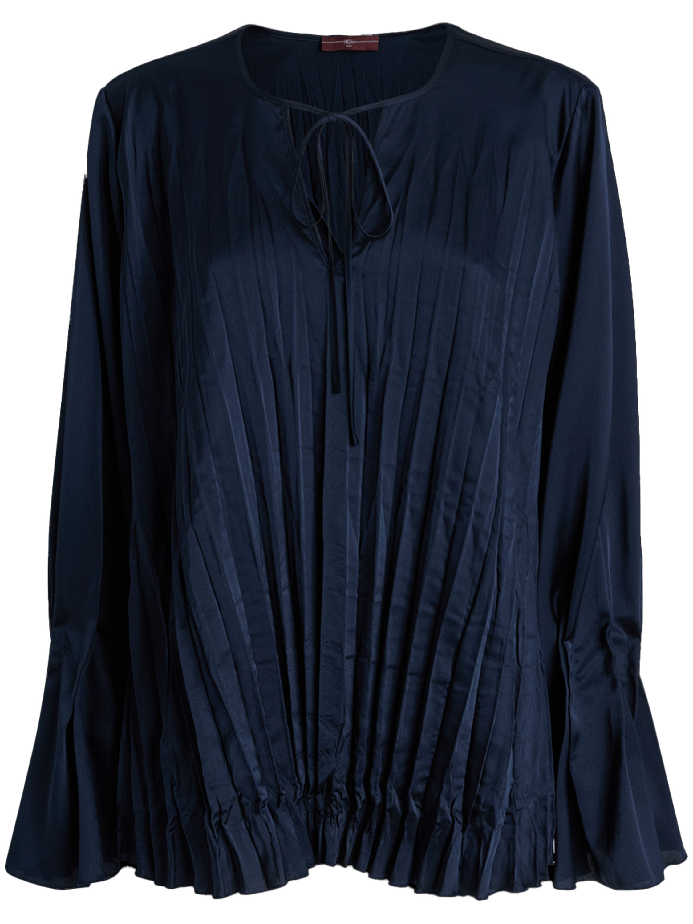 Une blouse de High en bleu marine. La blouse est confectionnée dans un fin tissu plissé et présente un décolleté en V au centre avec deux cordons étroits partant de l’encolure ronde. Les manches, en tissu lisse, s’évasent élégamment aux poignets. Cette blouse peut être lavée à 30 degrés.