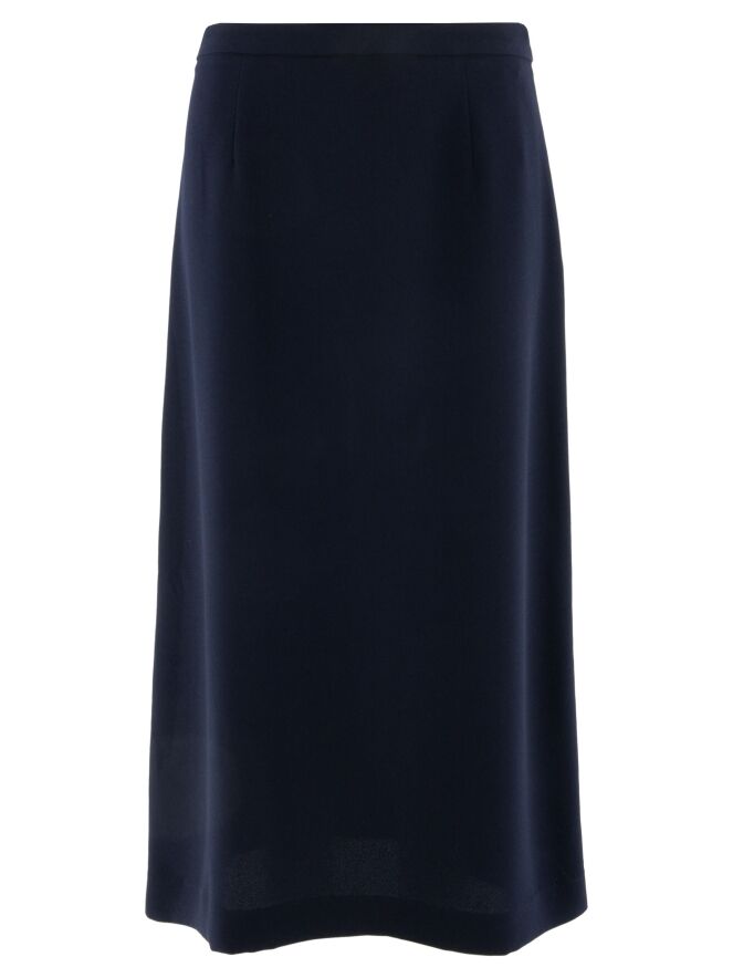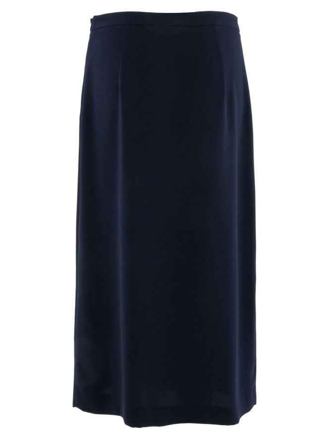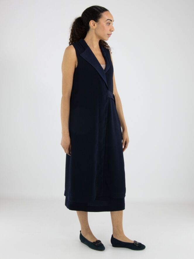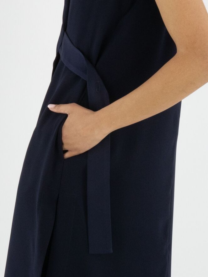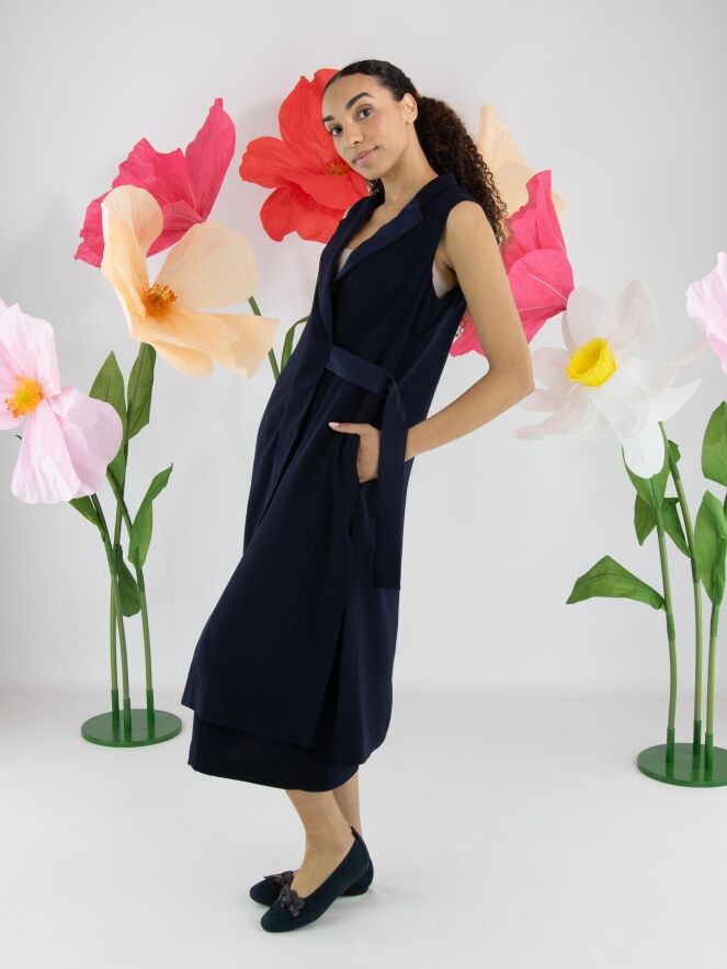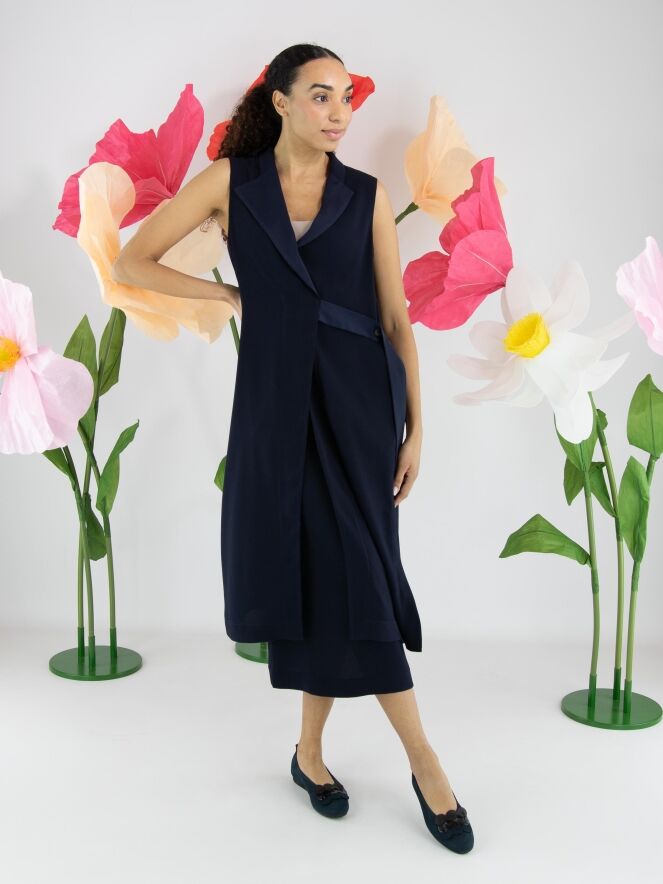 Ensemble deux pièces de High composé d’une tunique portefeuille et d’une jupe dans une élégante teinte bleu marine. La tunique se ferme par deux boutons dissimulés et possède un ruban à nouer sur le côté gauche. Dotée d’un col en V et de profondes fentes latérales jusqu’à la taille, elle crée une silhouette fluide et contemporaine. Des poches sont intégrées à hauteur de taille. La jupe est droite et se ferme par une fermeture zippée sur le côté. Cet ensemble doit être lavé à la main.