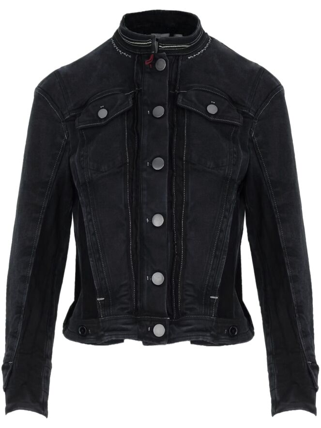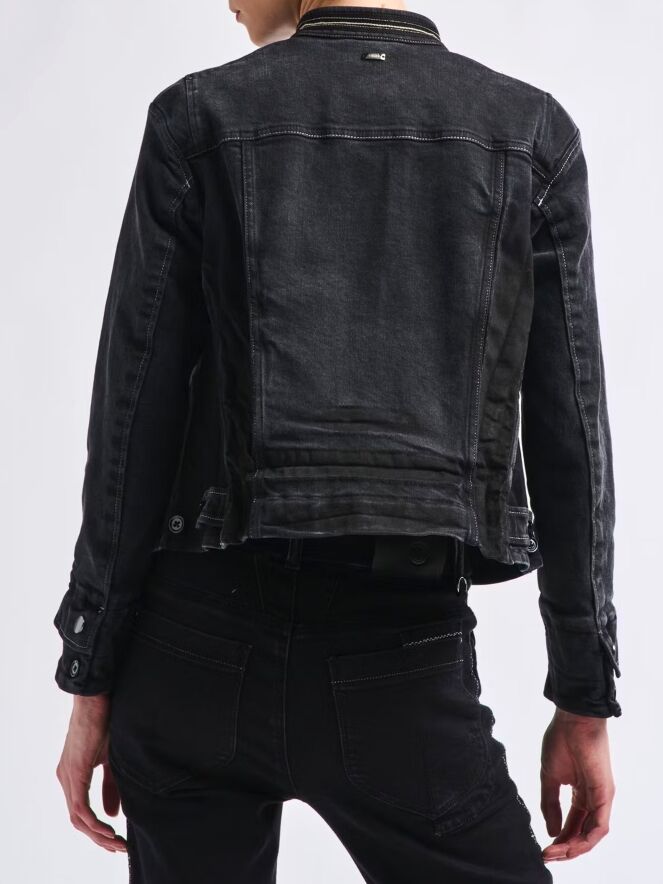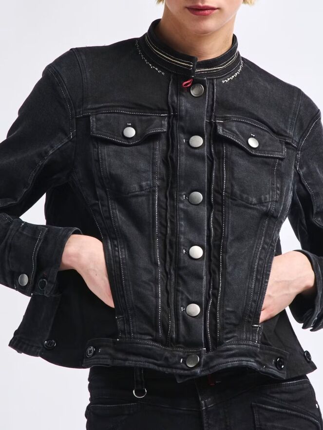 Un blazer en jean de High de couleur denim foncé. Le col comporte un fil de strass avec une couture en guise de bordure. Sur le devant, il y a plusieurs coutures verticales. Des boutons en bas des côtés permettent de régler la coupe du blazer pour un effet plus ou moins cintré. Ce blazer en jean peut être lavé à 30 degrés.