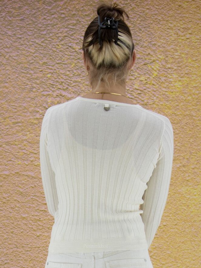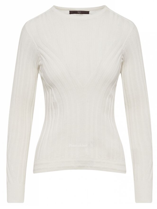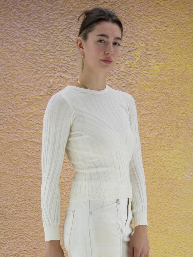 Pull de la marque High. Il est fait de motifs rayés irréguliers et en relief qui permettent de créer une forme en V dans la partie centrale du devant. Le pull-over présente un col rond ras du cou et des manches longues. Lavage à la main.