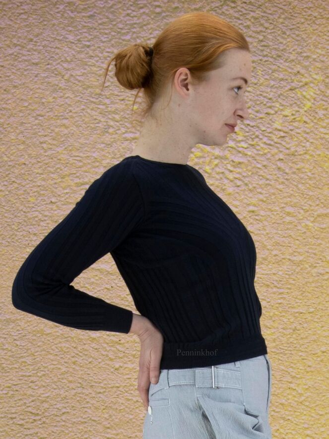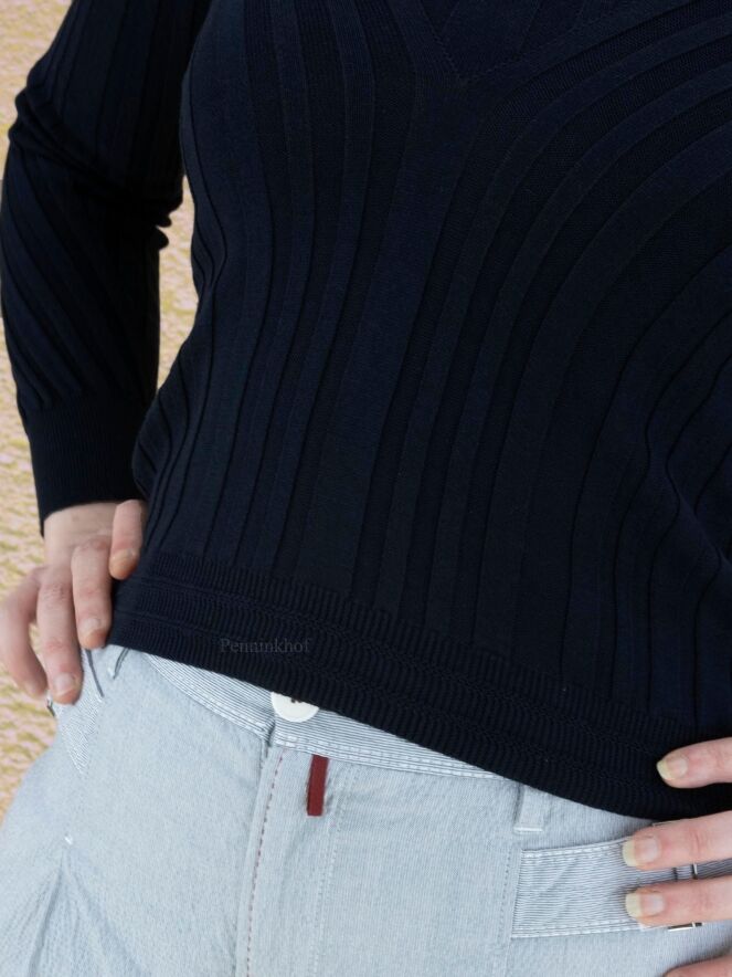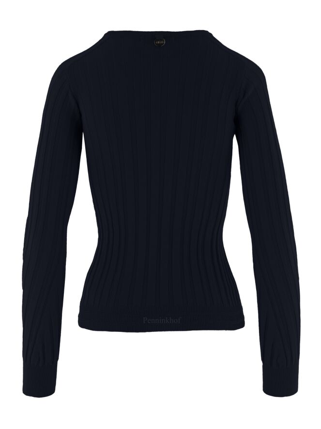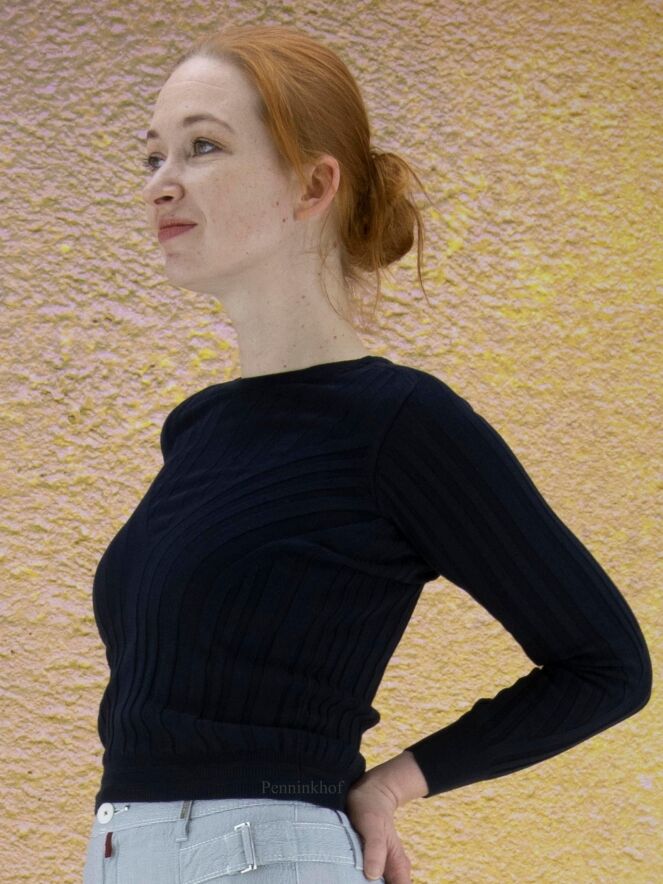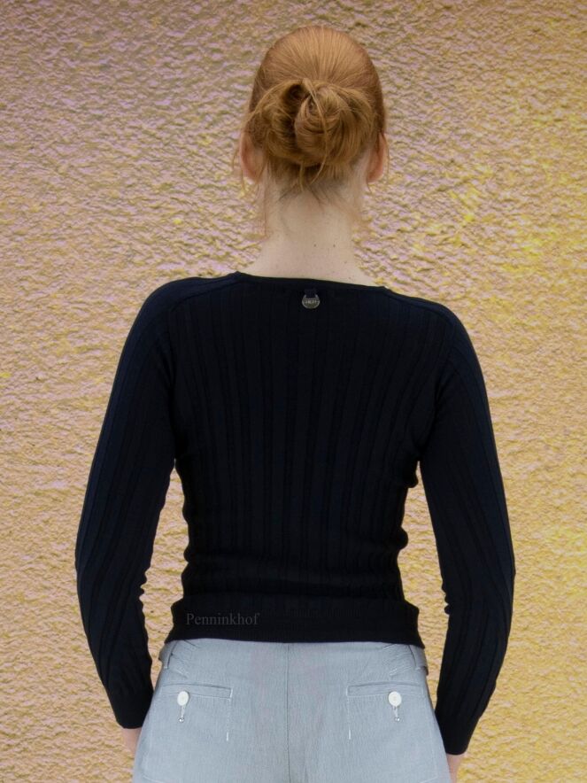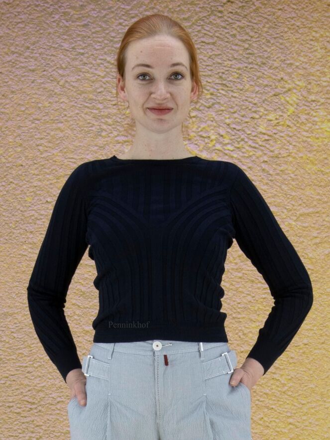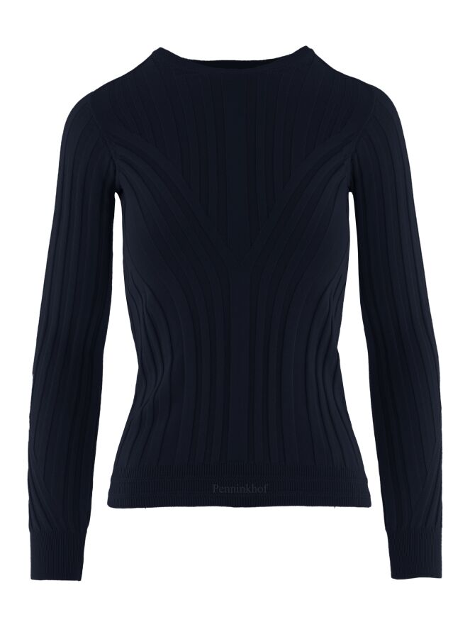 Pull de la marque High, dans une large structure côtelée de couleur bleu marine. Le bas du pull et des manches longues est fini par un large tricot côtelé. Lavage à la main.