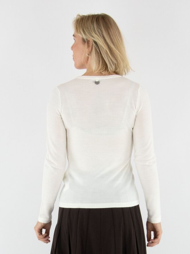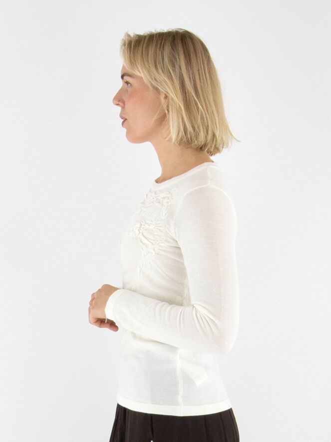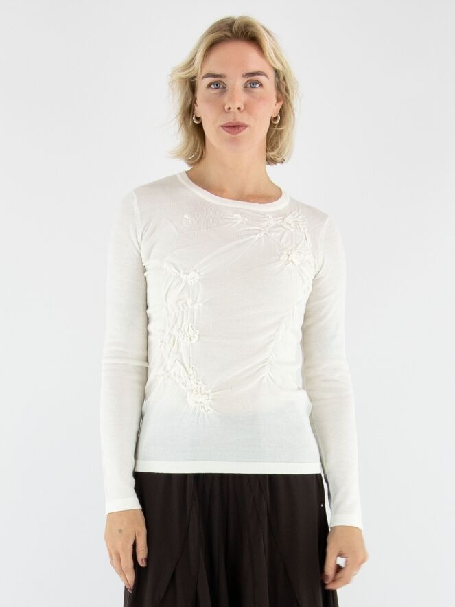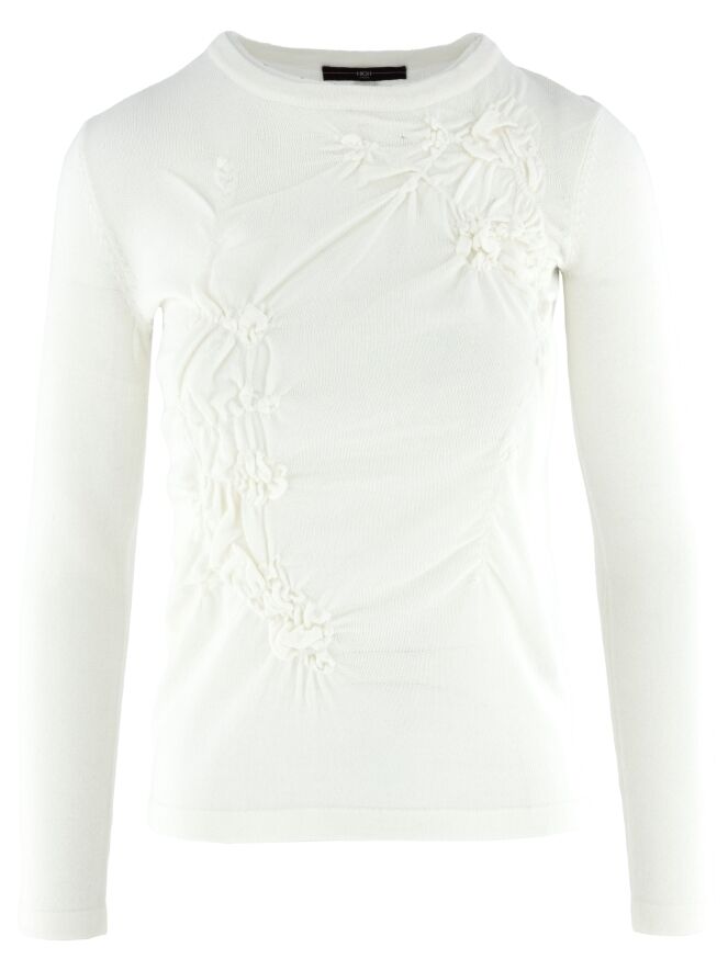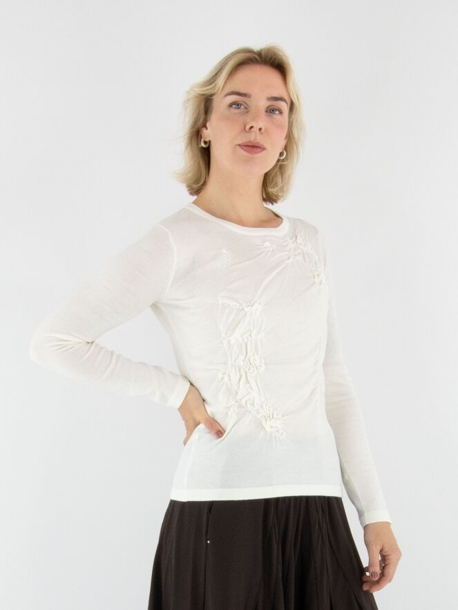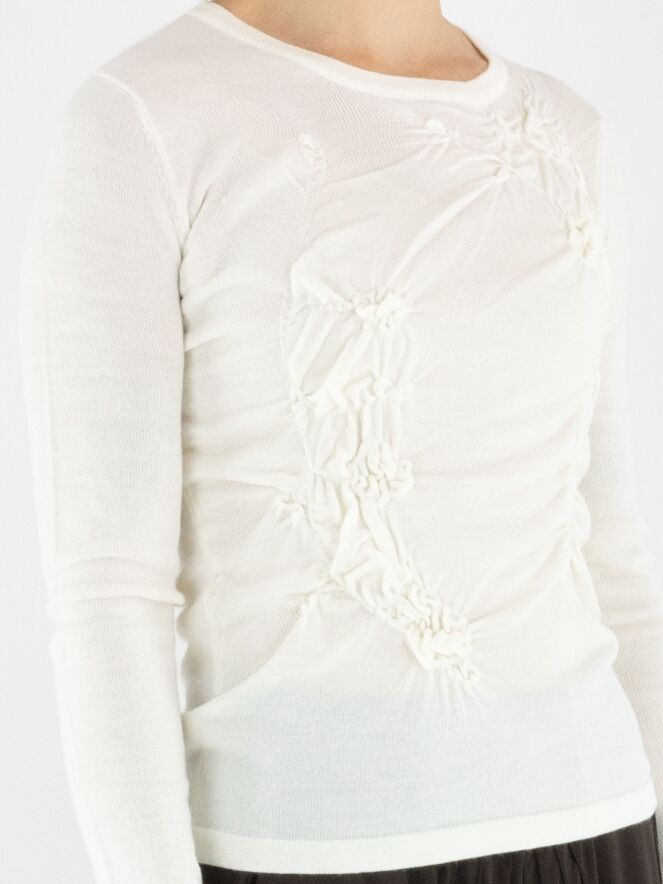 Un pull de High en blanc cassé. Le tissu est smocké à plusieurs endroits sur le devant, créant un détail de texture à la fois ludique et raffiné. Le pull présente une encolure ronde et des manches longues et peut être lavé à la main.