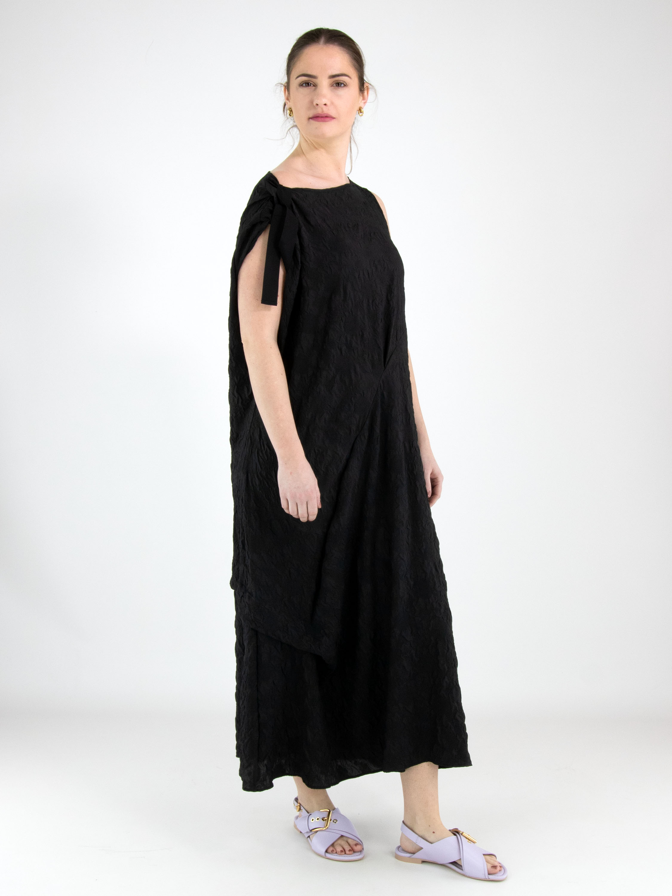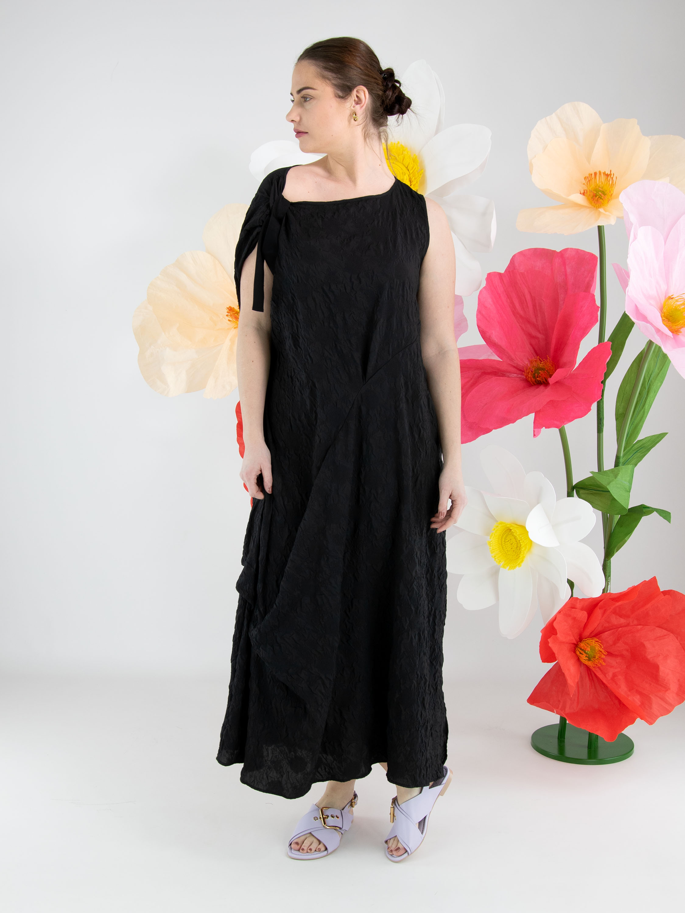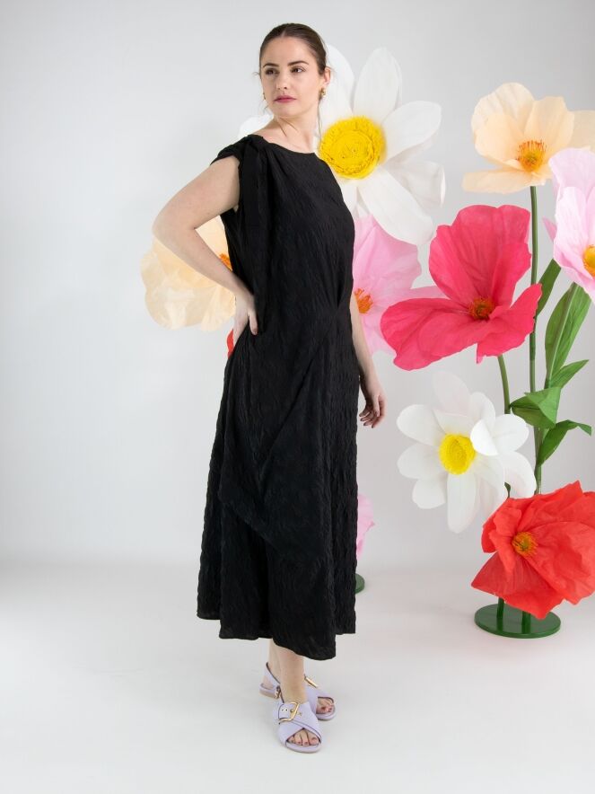 Une robe de High Lab en tissu smocké de couleur noire. Sur l’épaule droite, un ruban part de l’encolure jusqu’à l’emmanchure, créant un effet plissé. La robe présente plusieurs coutures décoratives, plis et fronces. En bas, une fente profonde est présente sur le côté gauche. Cette robe peut être lavée à la main.