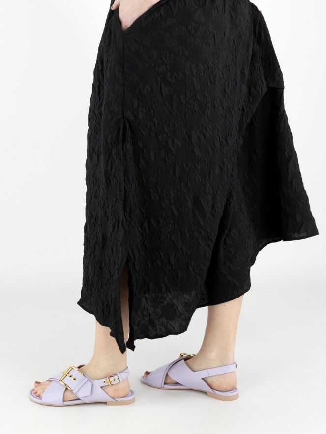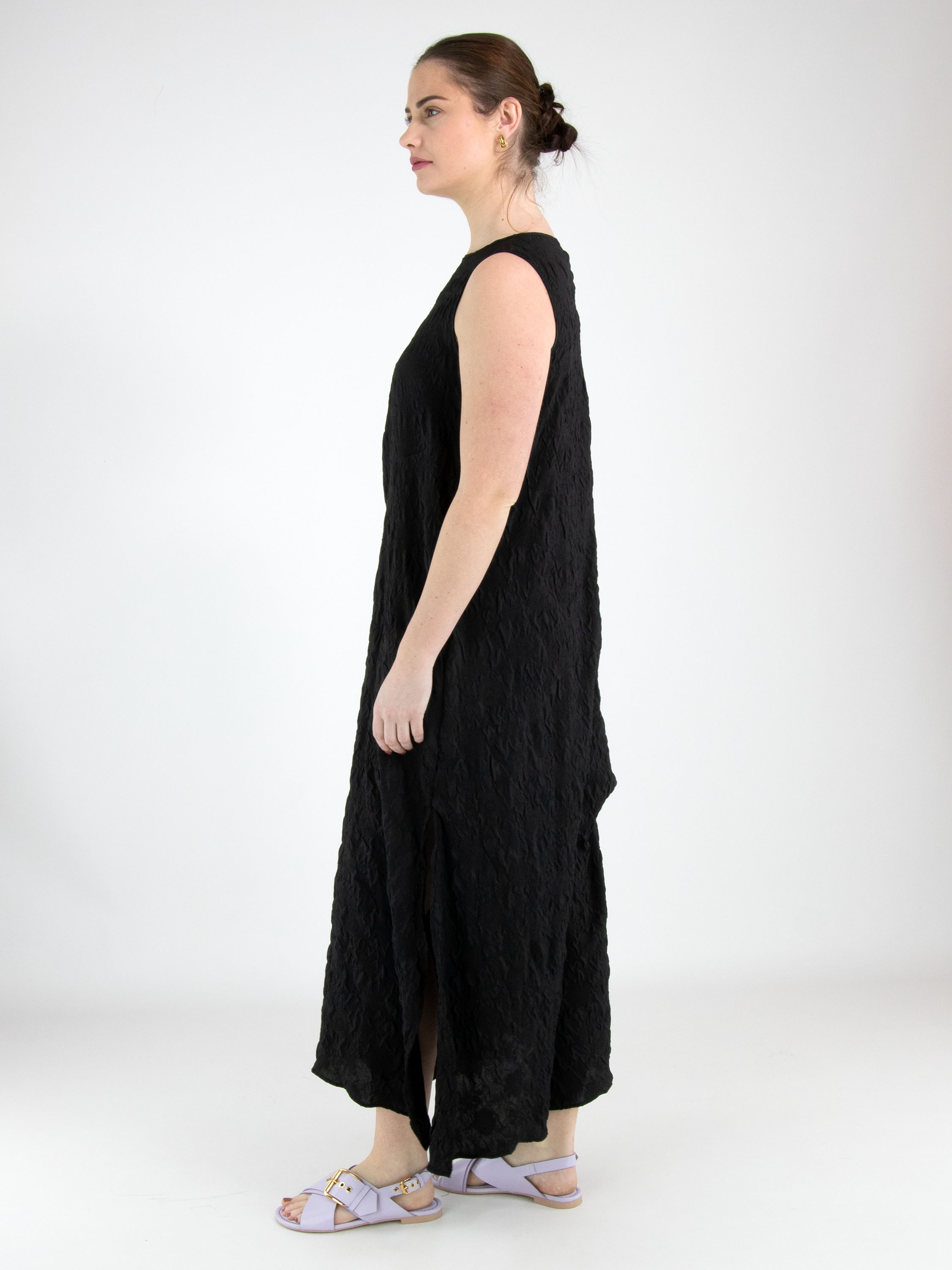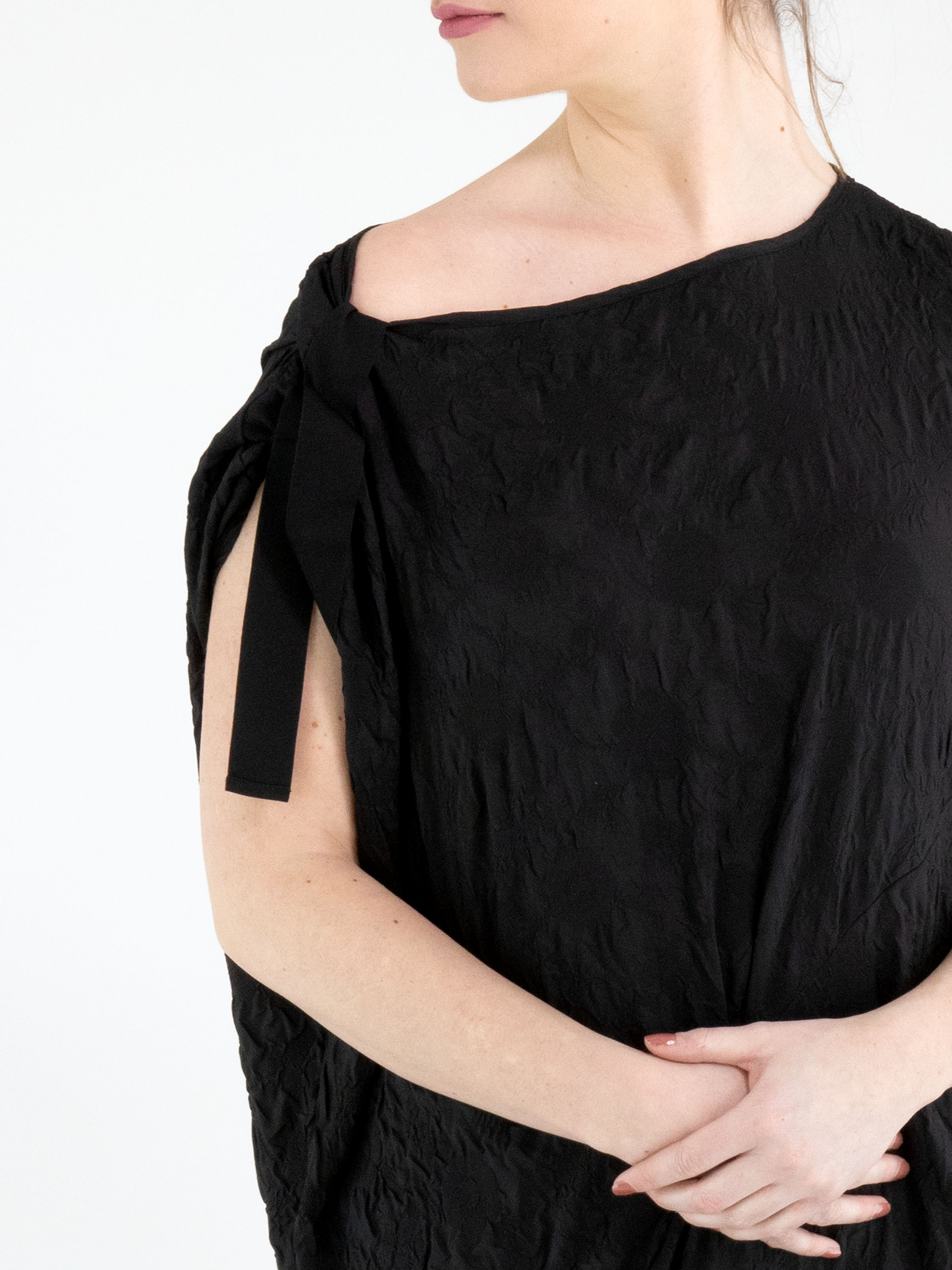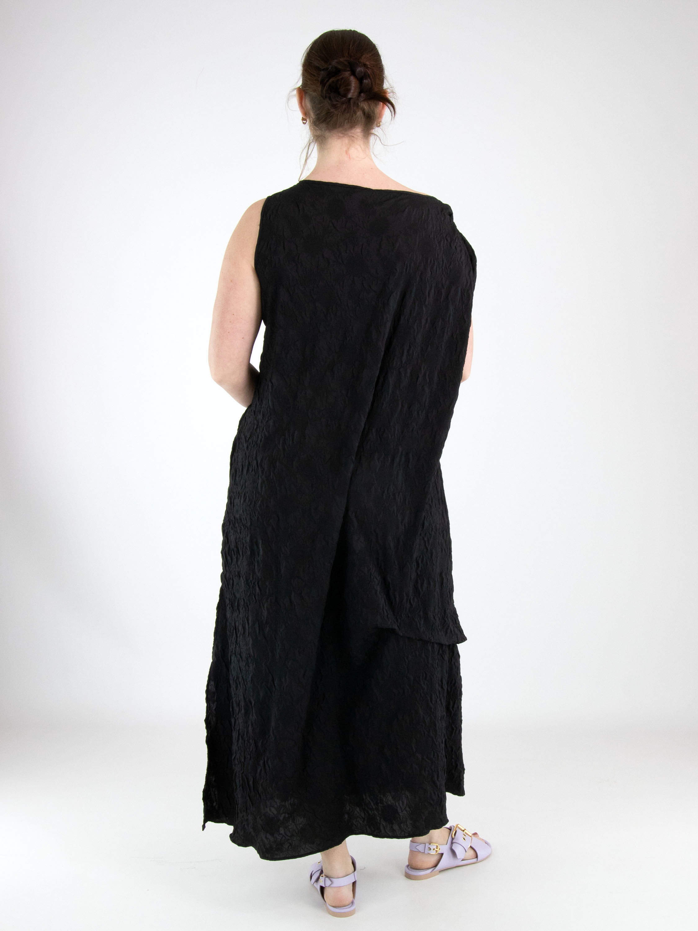 Une robe de High Lab en tissu smocké de couleur noire. Sur l’épaule droite, un ruban part de l’encolure jusqu’à l’emmanchure, créant un effet plissé. La robe présente plusieurs coutures décoratives, plis et fronces. En bas, une fente profonde est présente sur le côté gauche. Cette robe peut être lavée à la main.