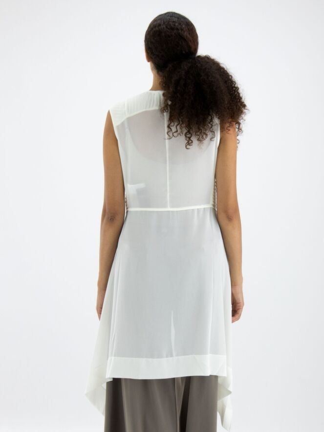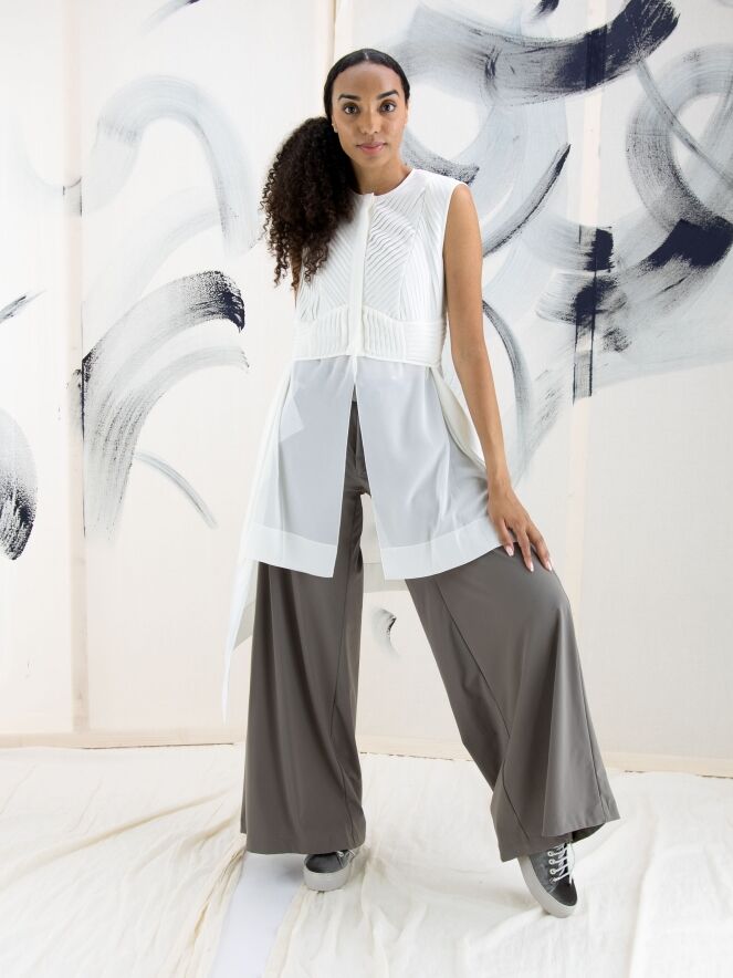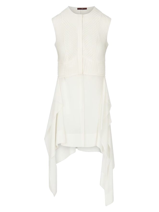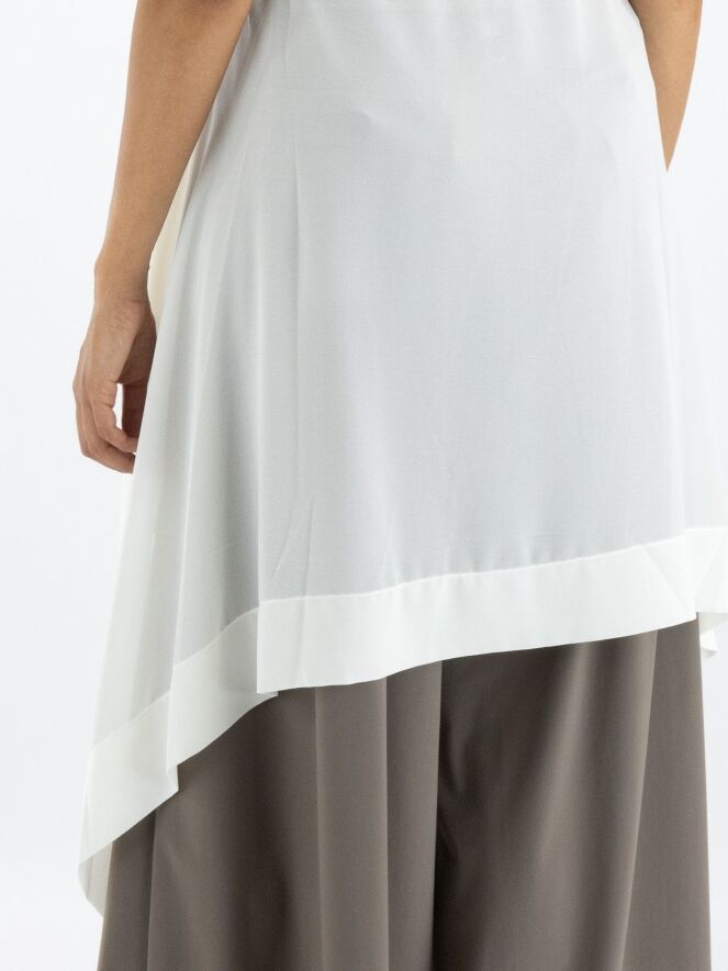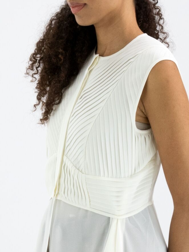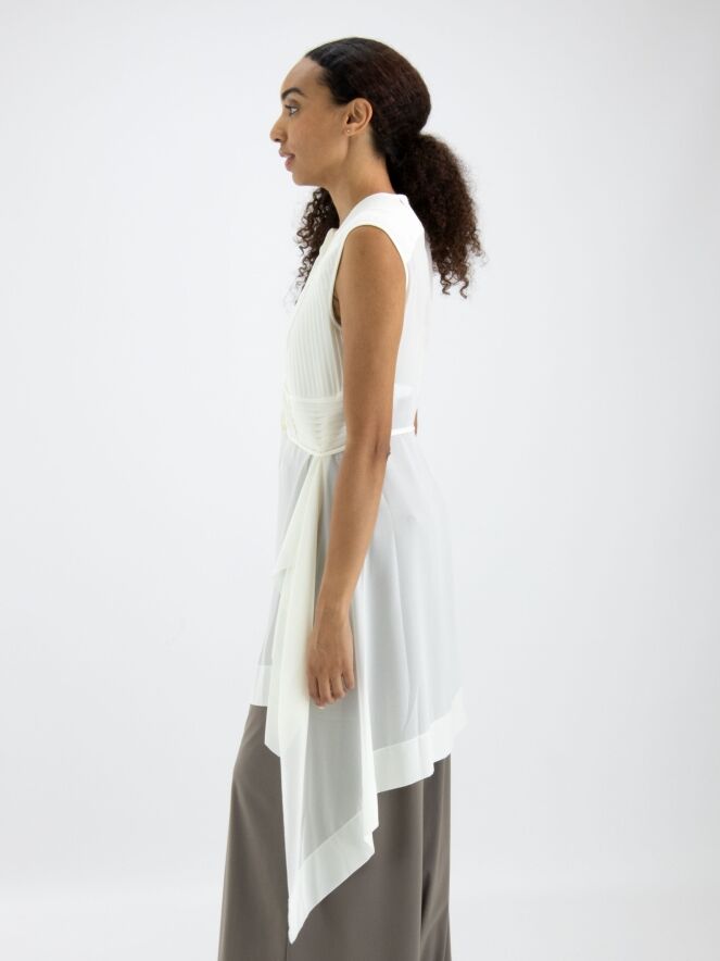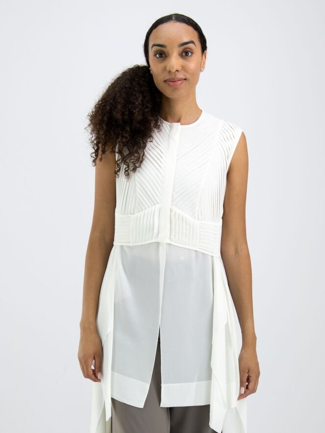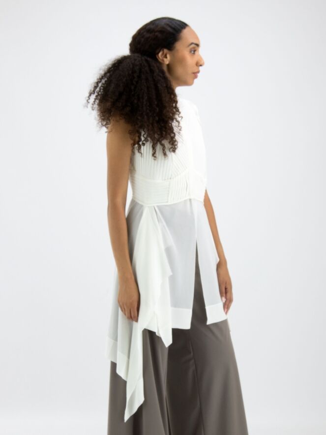 Un haut ou une tunique luxueuse de couleur crème. Jusqu'à la taille, le tissu est plissé en plusieurs lignes. À partir de la taille, le tissu est transparent avec des pointes sur les côtés. Le haut comporte une fermeture à boutons cachée et un col rond haut. Ce haut doit être lavé à la main.