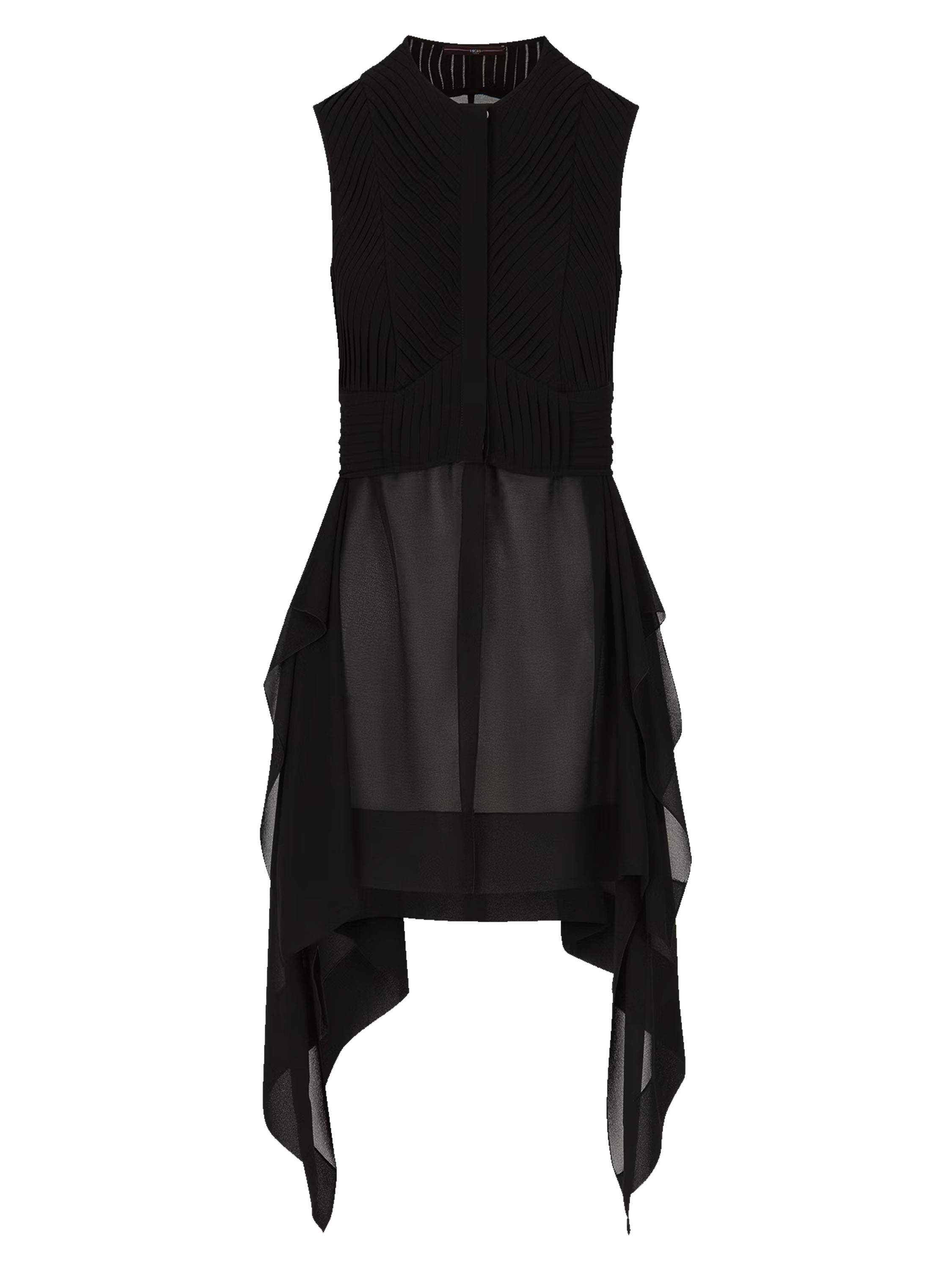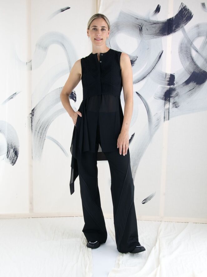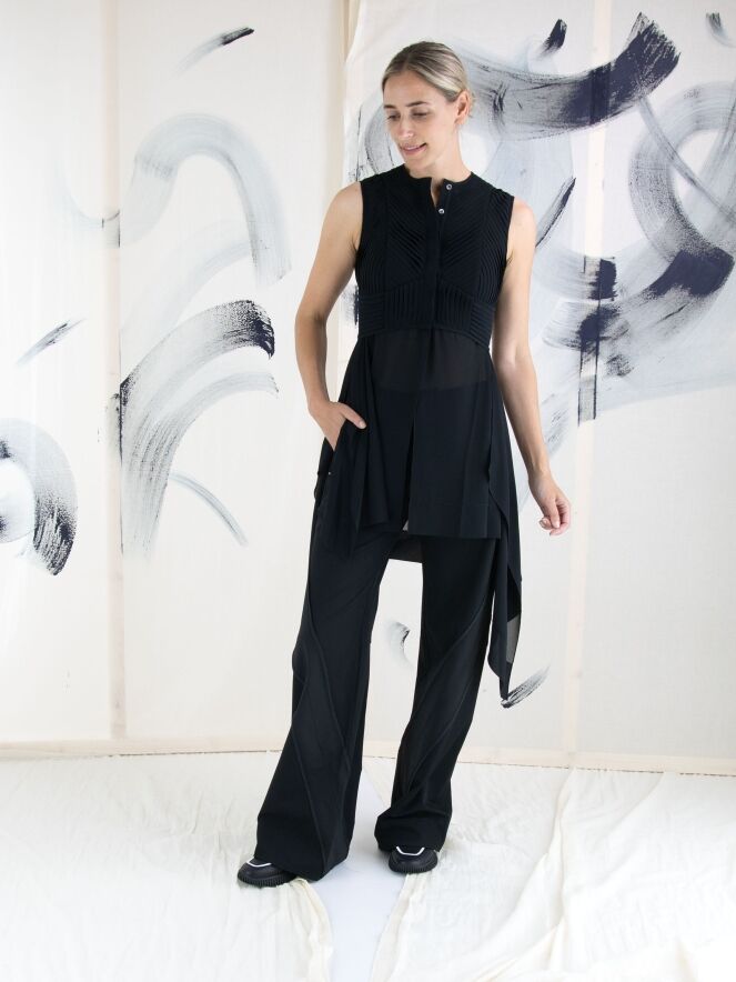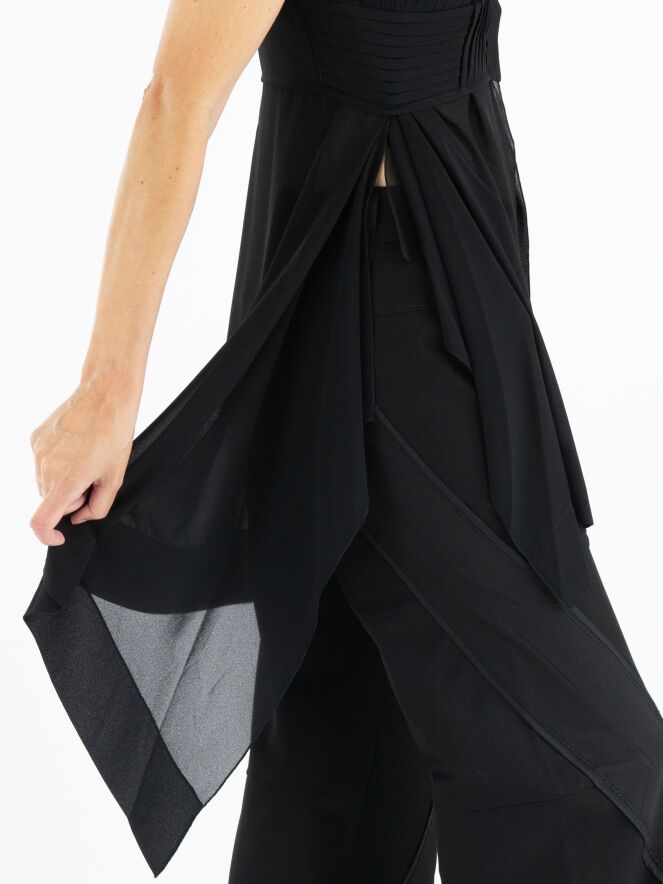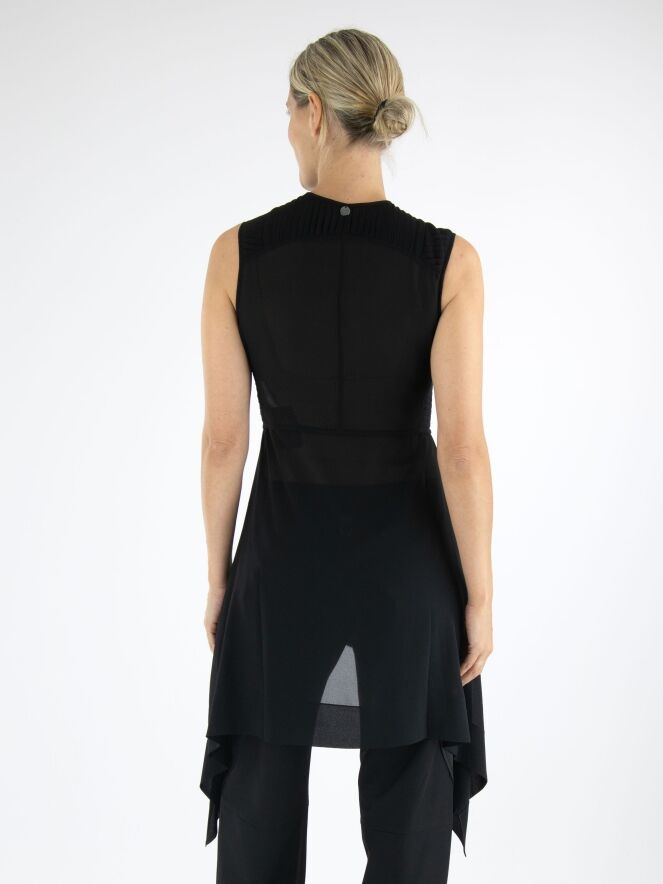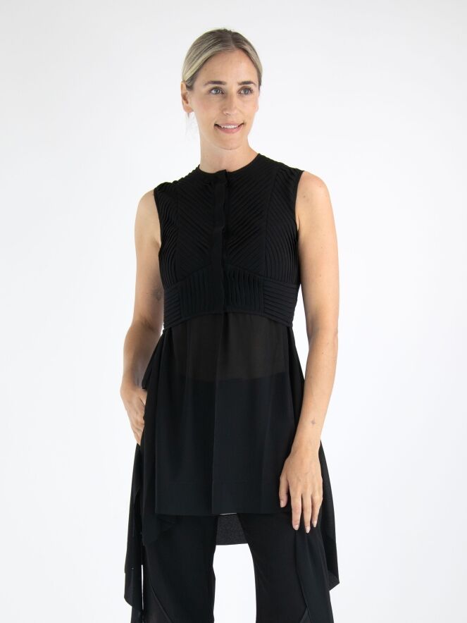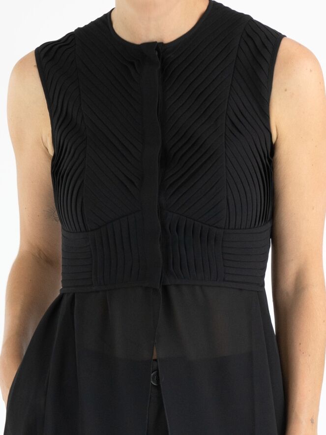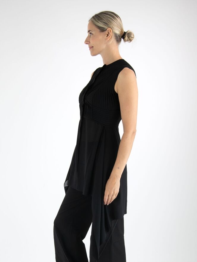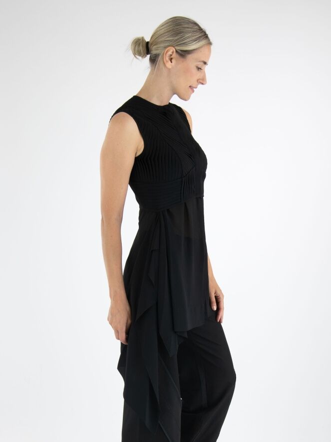 Un top ou une tunique de luxe en noir. Jusqu'à la taille, le tissu présente plusieurs lignes plissées. À partir de la taille, le tissu est transparent avec des pointes sur les côtés. Le haut est doté d'une fermeture à boutons cachée et d'un col rond haut. Ce haut doit être lavé à la main.
