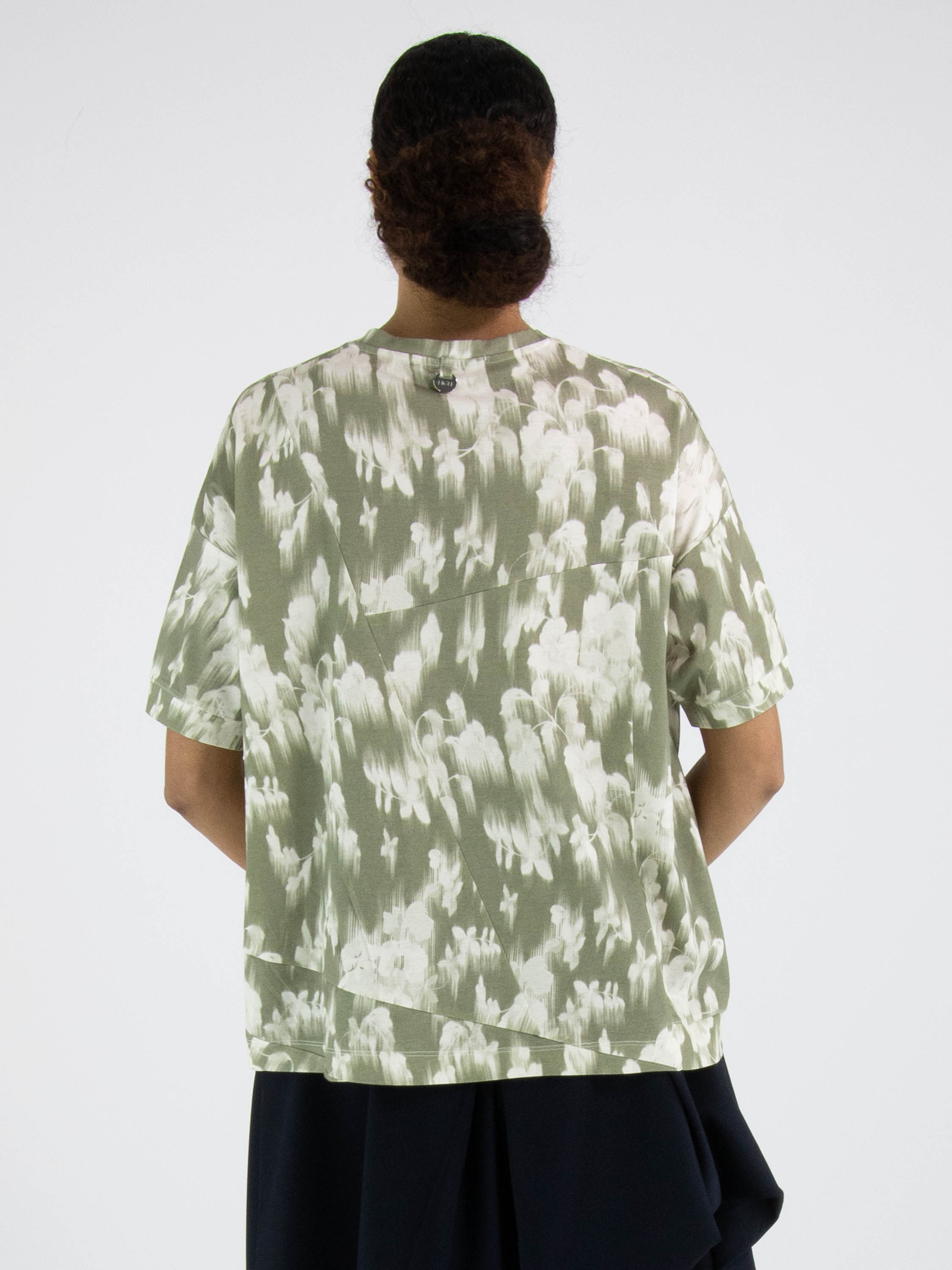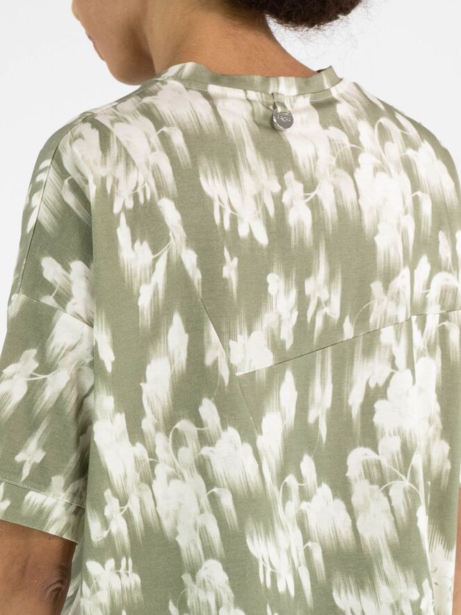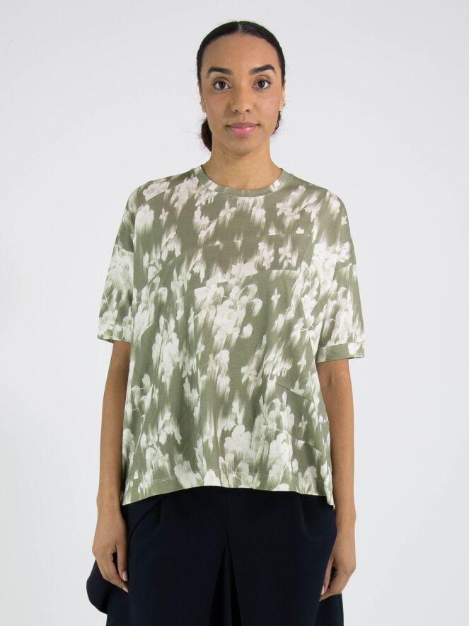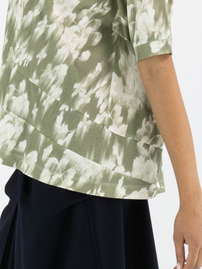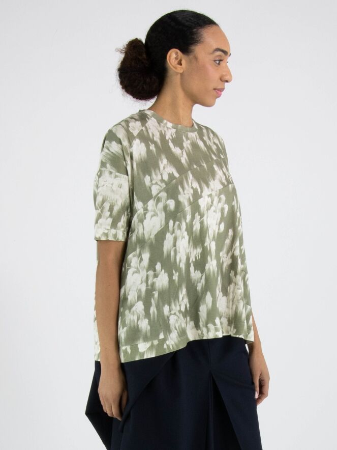 Un shirt de High avec un imprimé floral estompé dans plusieurs nuances de vert olive pastel et de blanc. Le shirt présente plusieurs coutures diagonales décoratives. Il possède une encolure ronde, des manches courtes et peut être lavé à la main.