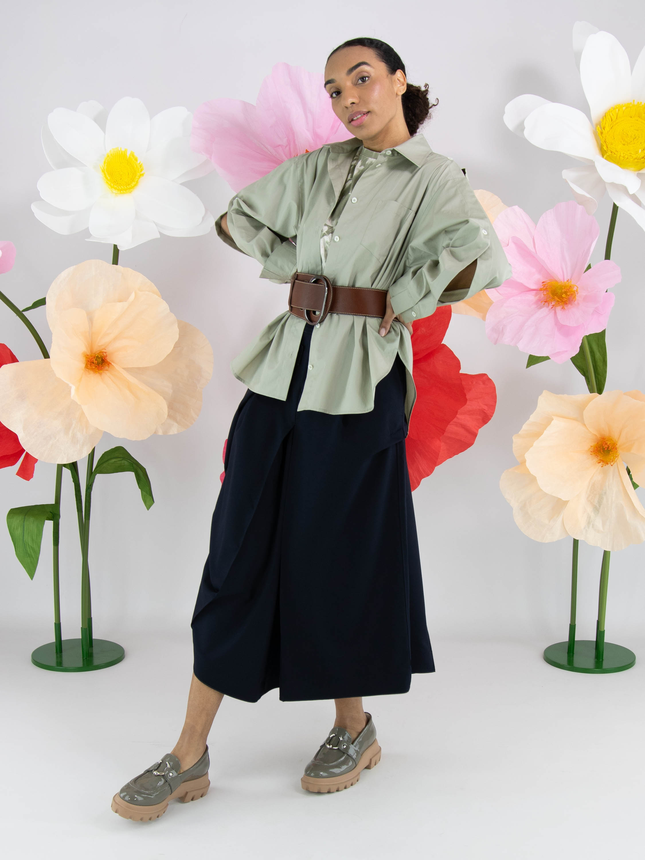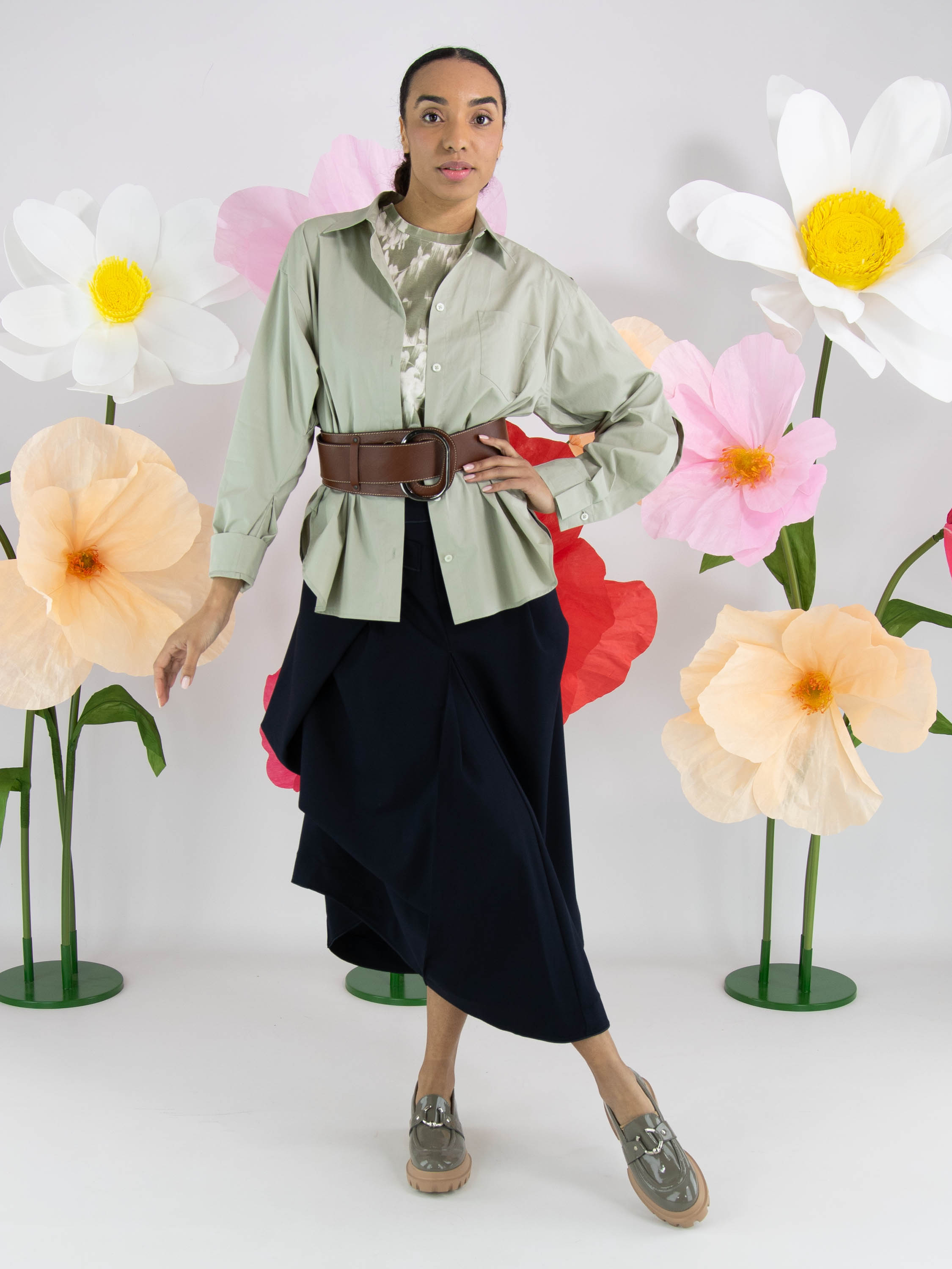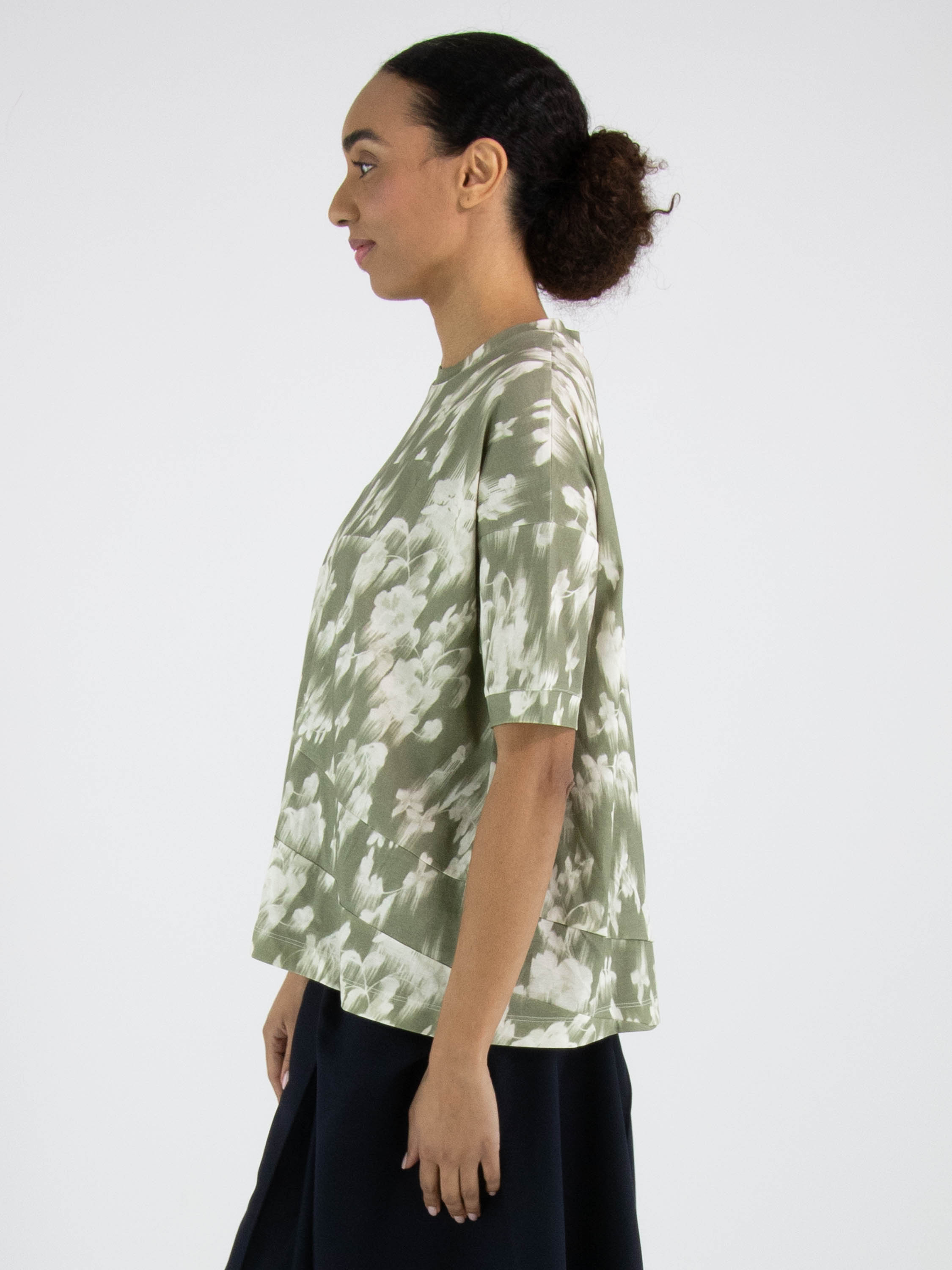 Un shirt de High avec un imprimé floral estompé dans plusieurs nuances de vert olive pastel et de blanc. Le shirt présente plusieurs coutures diagonales décoratives. Il possède une encolure ronde, des manches courtes et peut être lavé à la main.