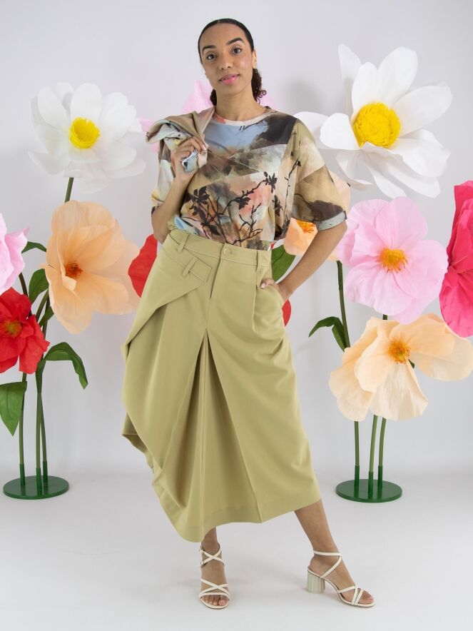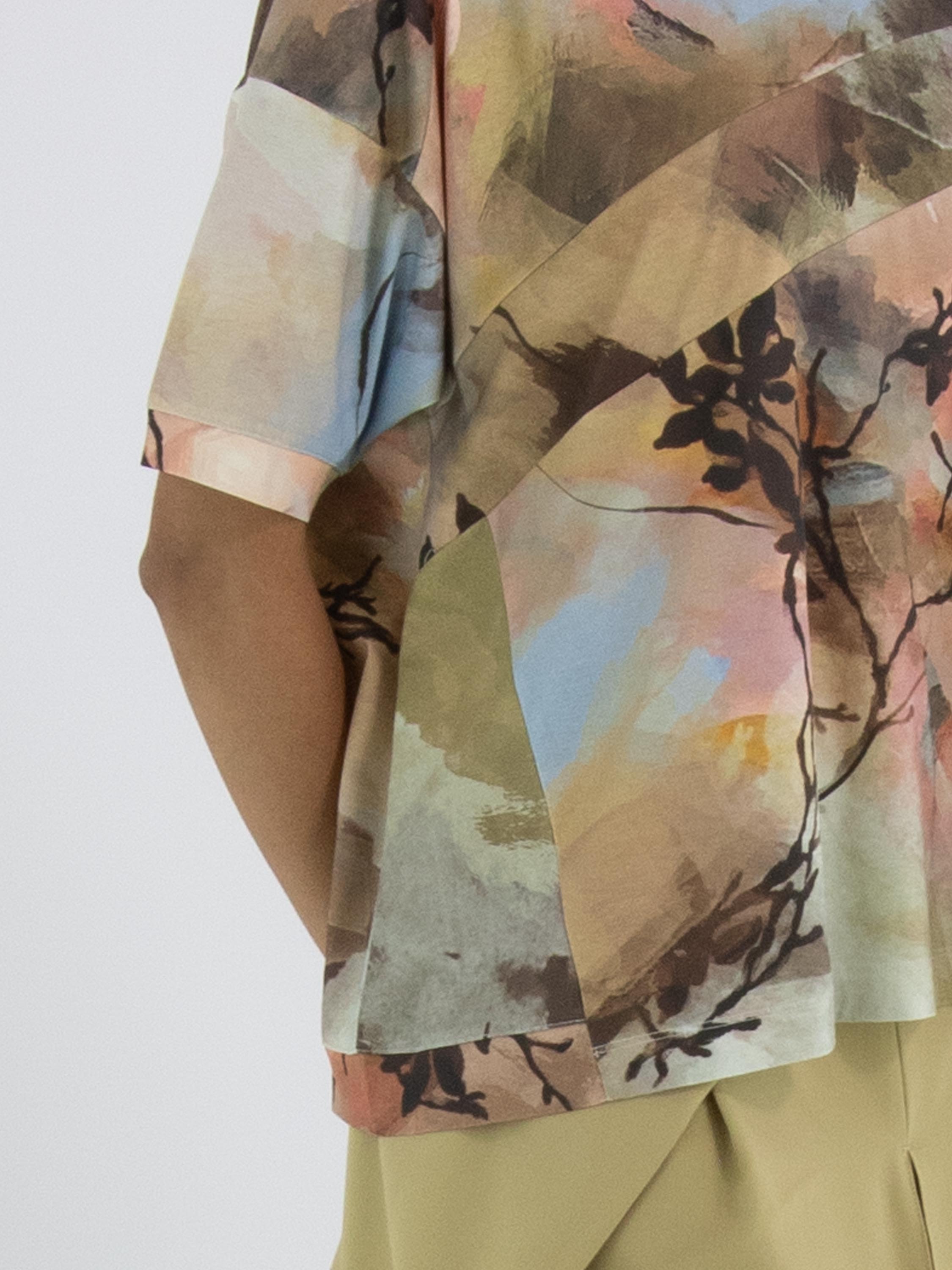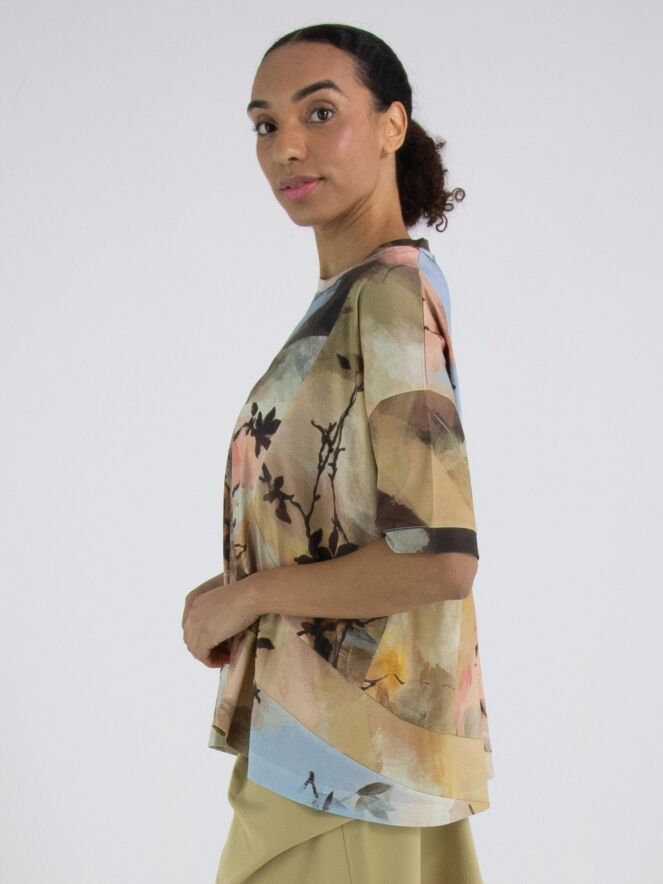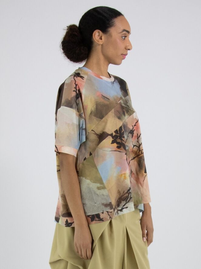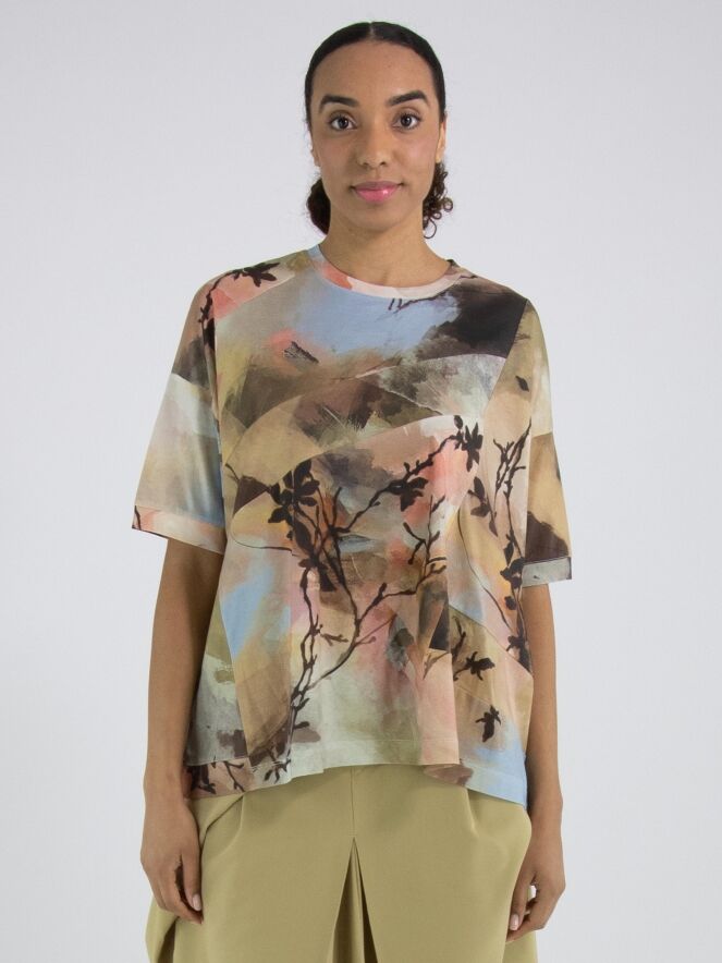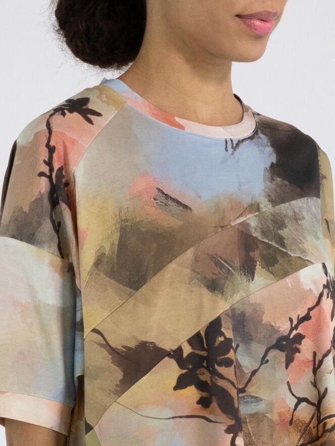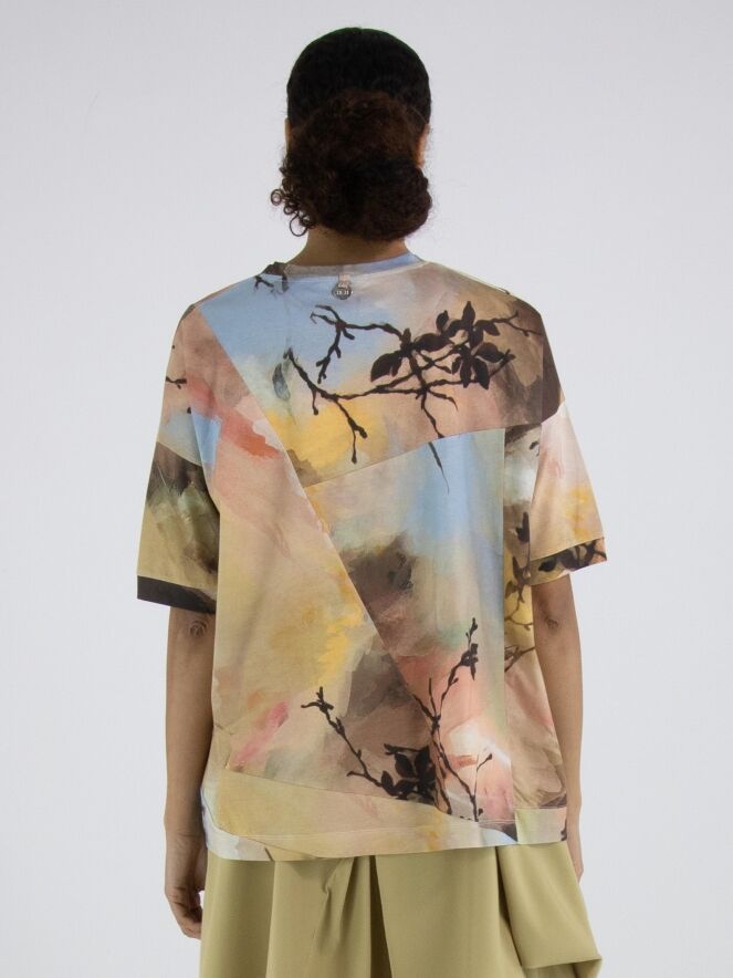 Un shirt de High Tech avec un imprimé aquarelle graphique multicolore, dominé par plusieurs nuances de taupe, de bleu pastel et de saumon. Le shirt présente plusieurs coutures diagonales décoratives à l’avant et à l’arrière. Il possède une encolure ronde, des manches courtes et peut être lavé à la main.