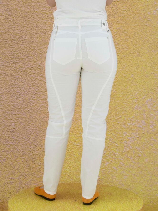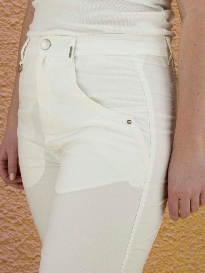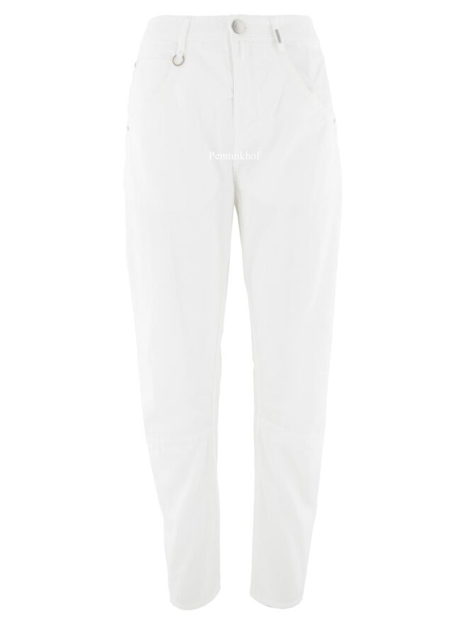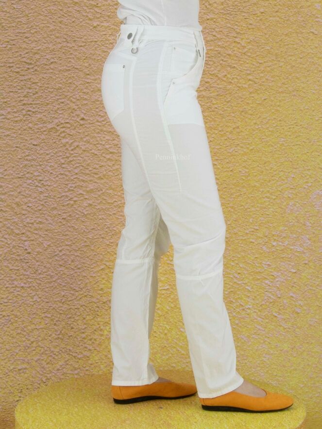 Pantalon à la coupe légèrement fuselée de la marque High, en coton doux qualitatif de couleur blanche. L'ouverture arrondie des poches est bordée d'un large passepoil. Différentes coutures ornent la jambe, dont une couture horizontale sous le genou. Lavage à 30 degrés.