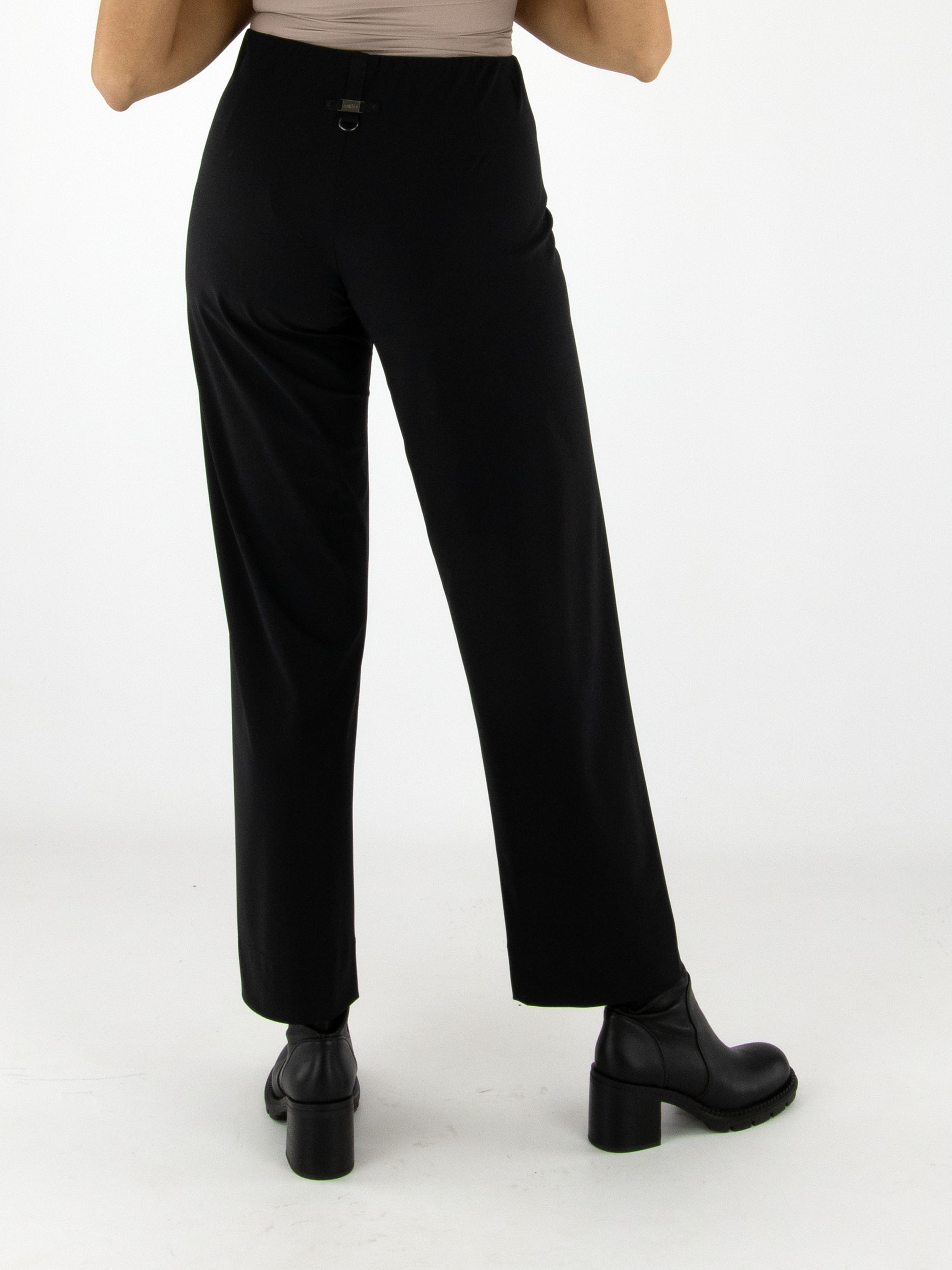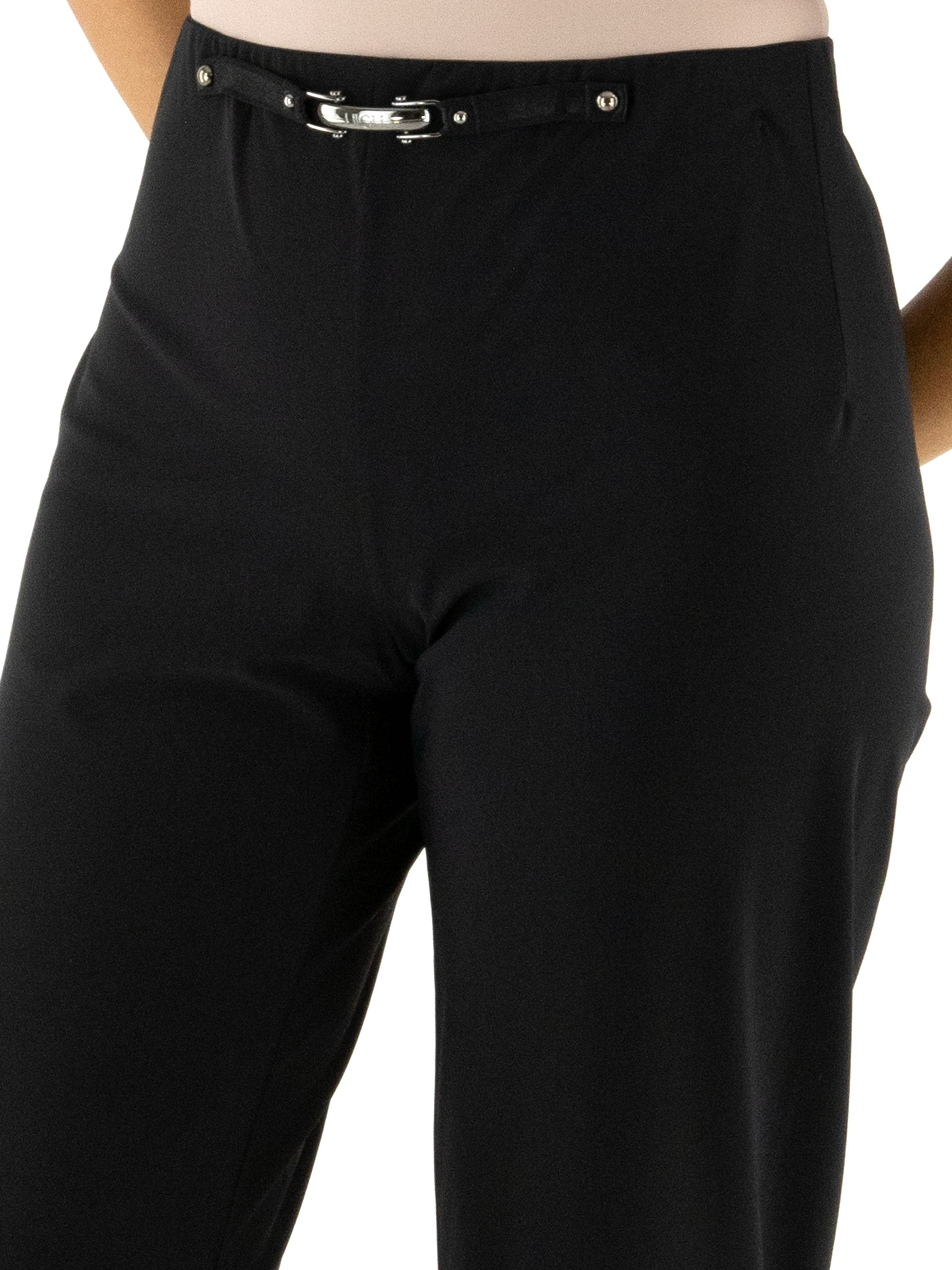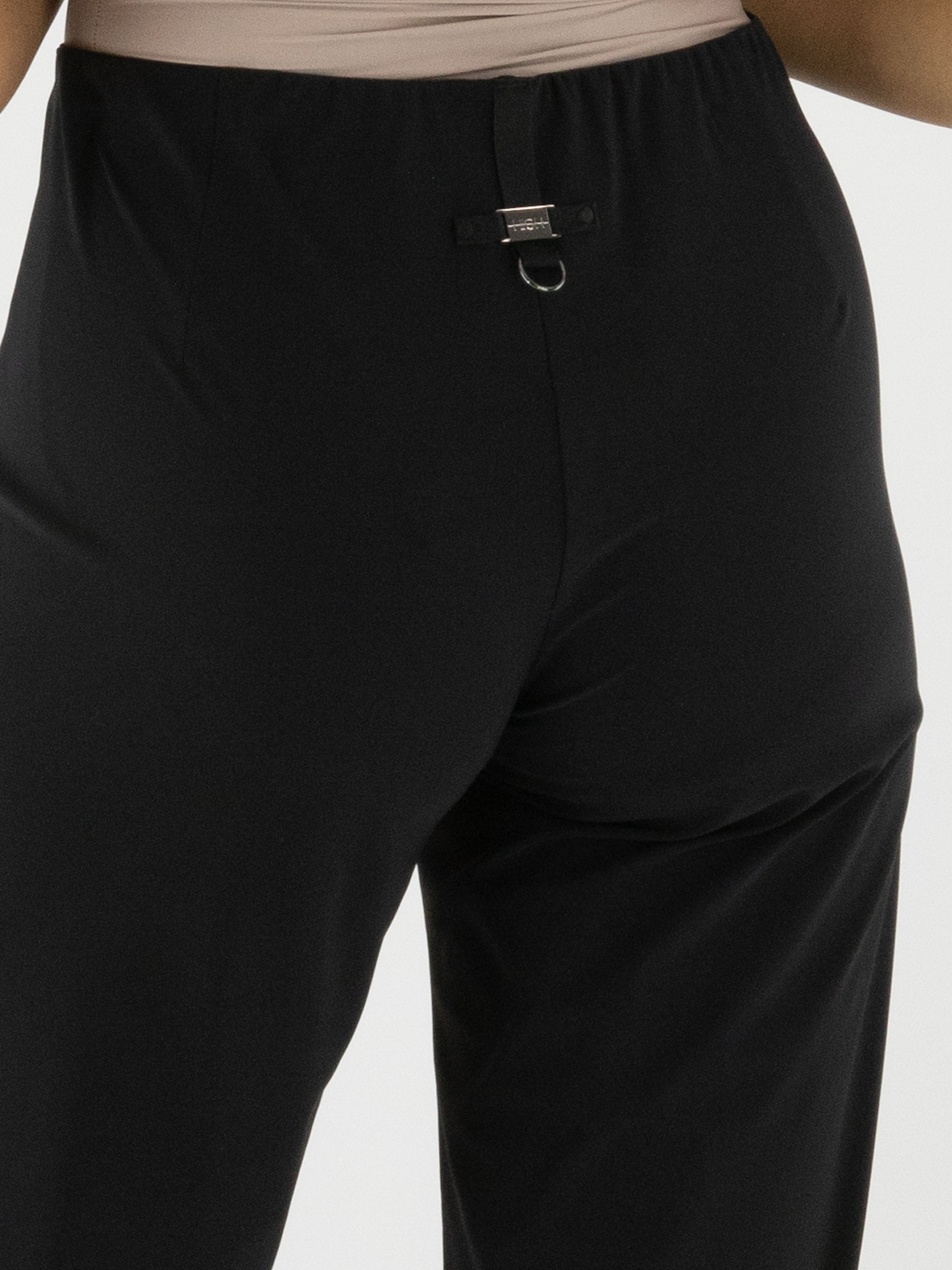Un pantalon de la marque High en noir. La taille est élastique. À l'avant, au niveau de la taille, se trouve une boucle décorative couleur nickel avec deux rivets. Ce pantalon peut être lavé à 30 degrés.